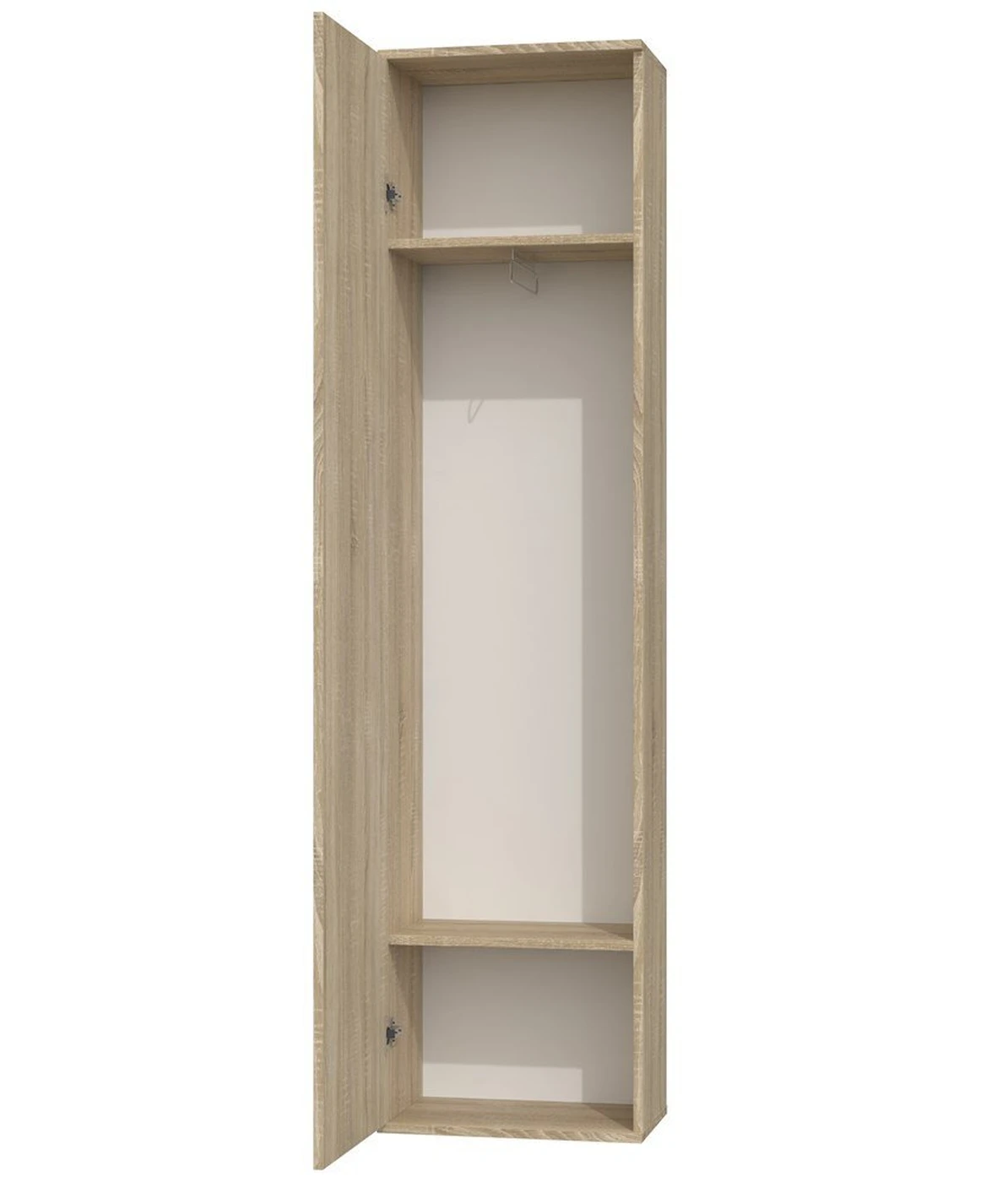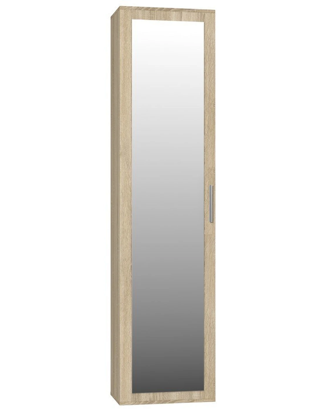 Praktiška spinta drabužiams;2 lentynos ir laikiklis pakaboms;Su veidrodžiu;Pagaminta iš laminuotos medžio drožlių plokštės (MDP), storis - 16 mm;Spintos kraštų apdailos medžiaga: PVC;Išmatavimai: plotis – 50 cm, aukštis – 180 cm, gylis – 35 cm;Spalva: ąžuolo (sonoma);