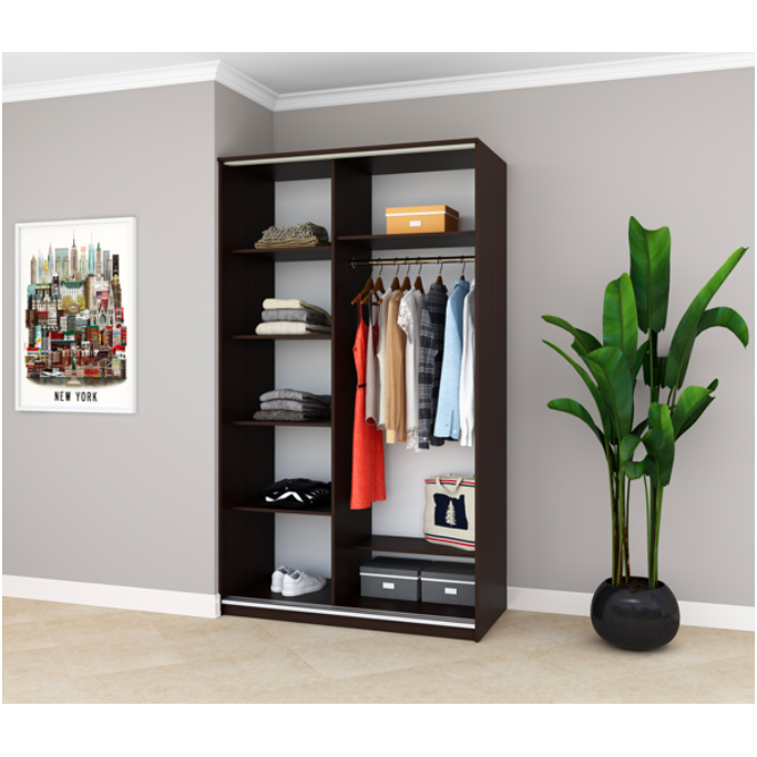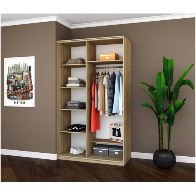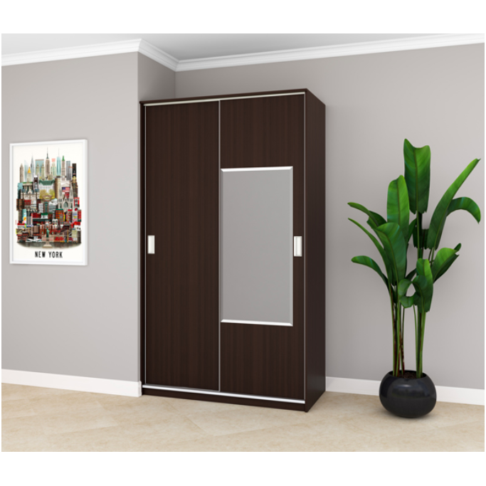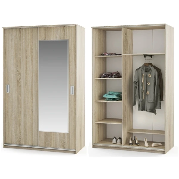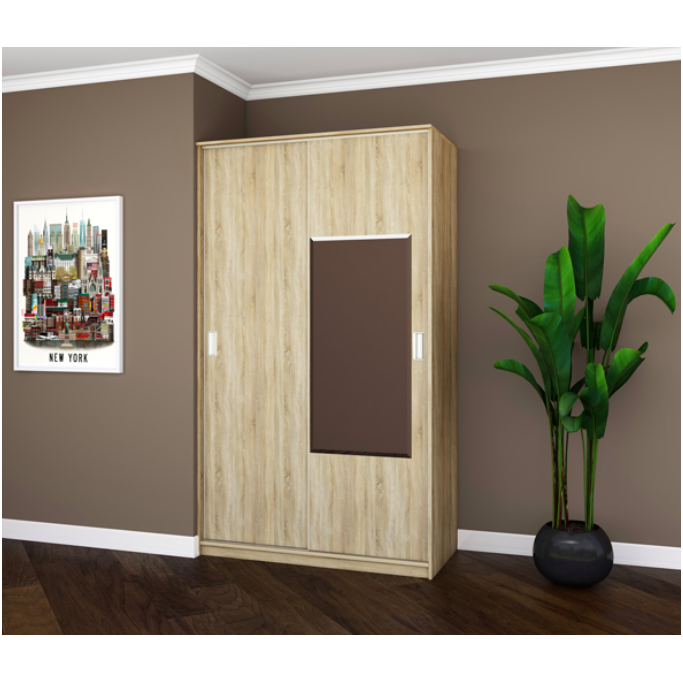 Drabužių spinta KOMFORT - patogi ir talpi: stumdomų durų mechanizmas, talpios lentynos, veidrodis ant durų.