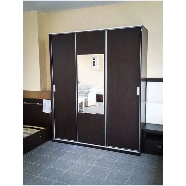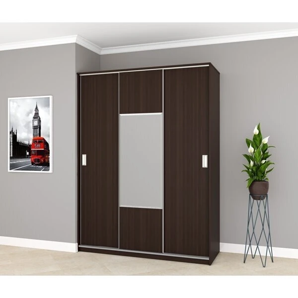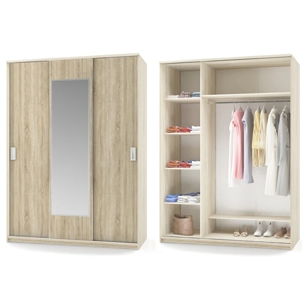 Trijų durų spinta su slankiojančiu mechanizmu KOMFORT yra universali ir talpi. Baldas pagamintas iš laminuotos medžio drožlių plokštės. Centre yra veidrodis. Durelės juda sklandžiai ir tyliai. Iš vidaus korpusas yra padalintas į du skyrius.
