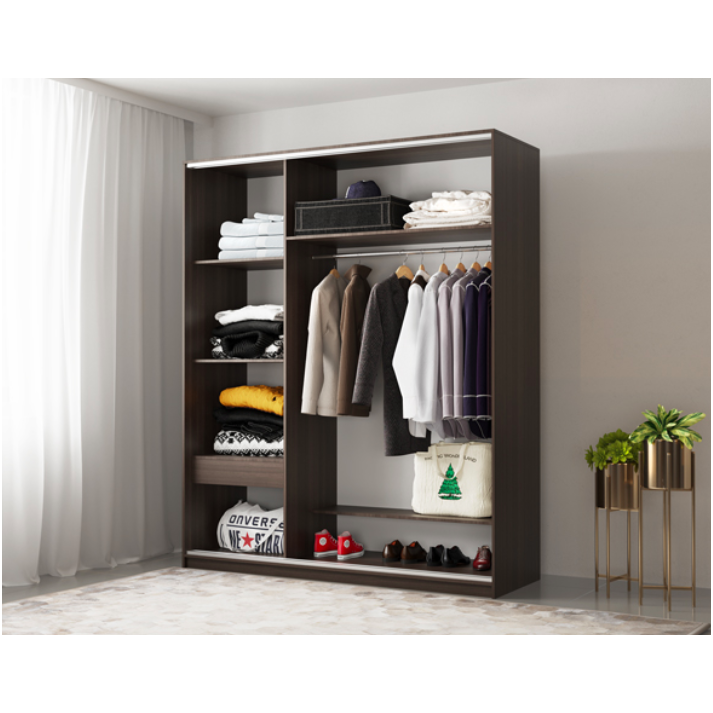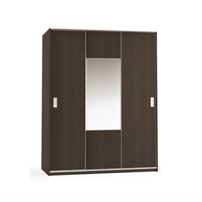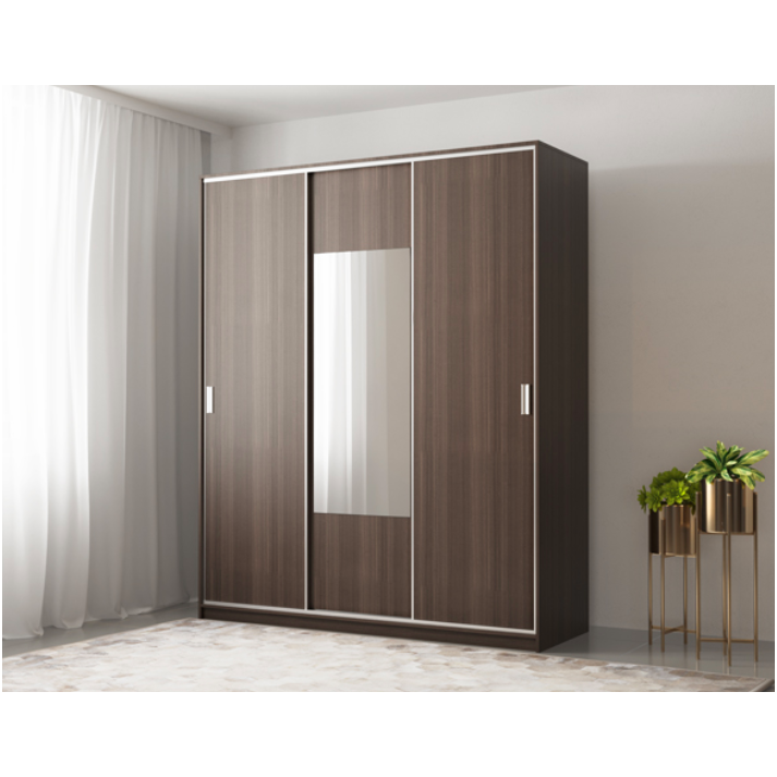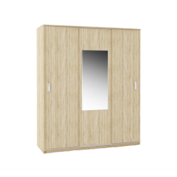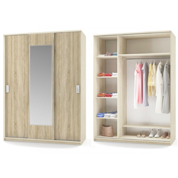 Didelė trijų durų spinta tiks tiek Jūsų miegamajame, tiek svečių kambaryje. Talpi, praktiška, su stumdomu mechanizmu spinta nepaliks abejingų. Baldas pagamintas iš laminuotos medžio drožlių plokštės. Centre yra veidrodis. Durelės juda sklandžiai ir tyliai. Iš vidaus korpusas yra padalintas į du skyrius.
