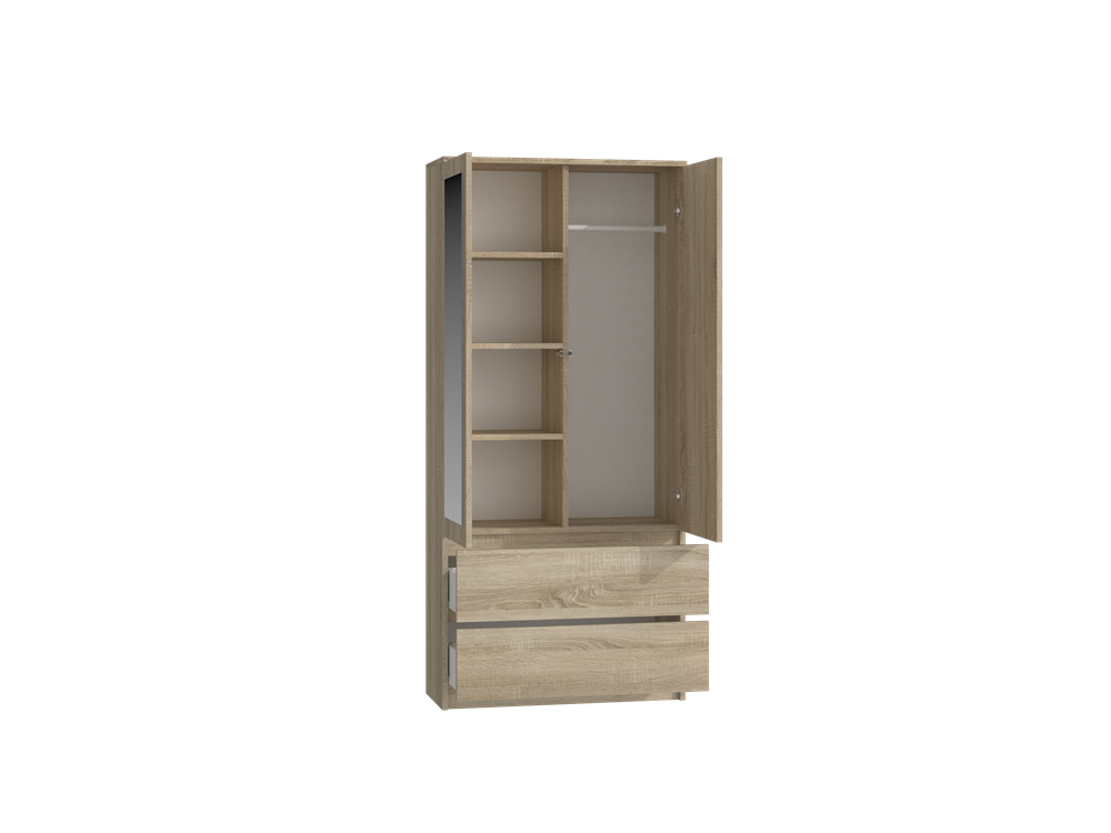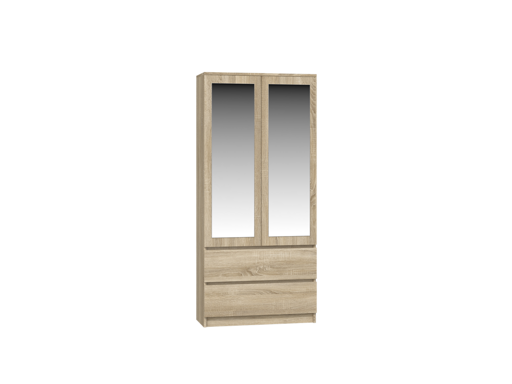 dviejų varstomų durų ir dviejų stalčių spinta;su dviem veidrodžiais;viduje yra 4 lentynos ir pakaba drabužiams;spinta pagaminta iš 16 mm storio laminuotos medžio drožlių plokštės (MDP) su ABS kraštų apdaila;spintos išmatavimai: plotis - 90 cm, gylis - 50 cm, aukštis - 180 cm;veidrodžių išmatavimai: plotis - 35 cm, aukštis - 116 cm;ritininiai bėgeliai apsaugos stalčius nuo iškritimo;""TIP-ON"" durų atidarymo sistema (atsidaro vos stipriau paspaudus);lentynos viduje gali būti montuojamos pasirinktinai- kairėje arba dešinėje pusėje;spintos spalva: ąžuolo (sonoma);tvirta ir stabili konstrukcija;