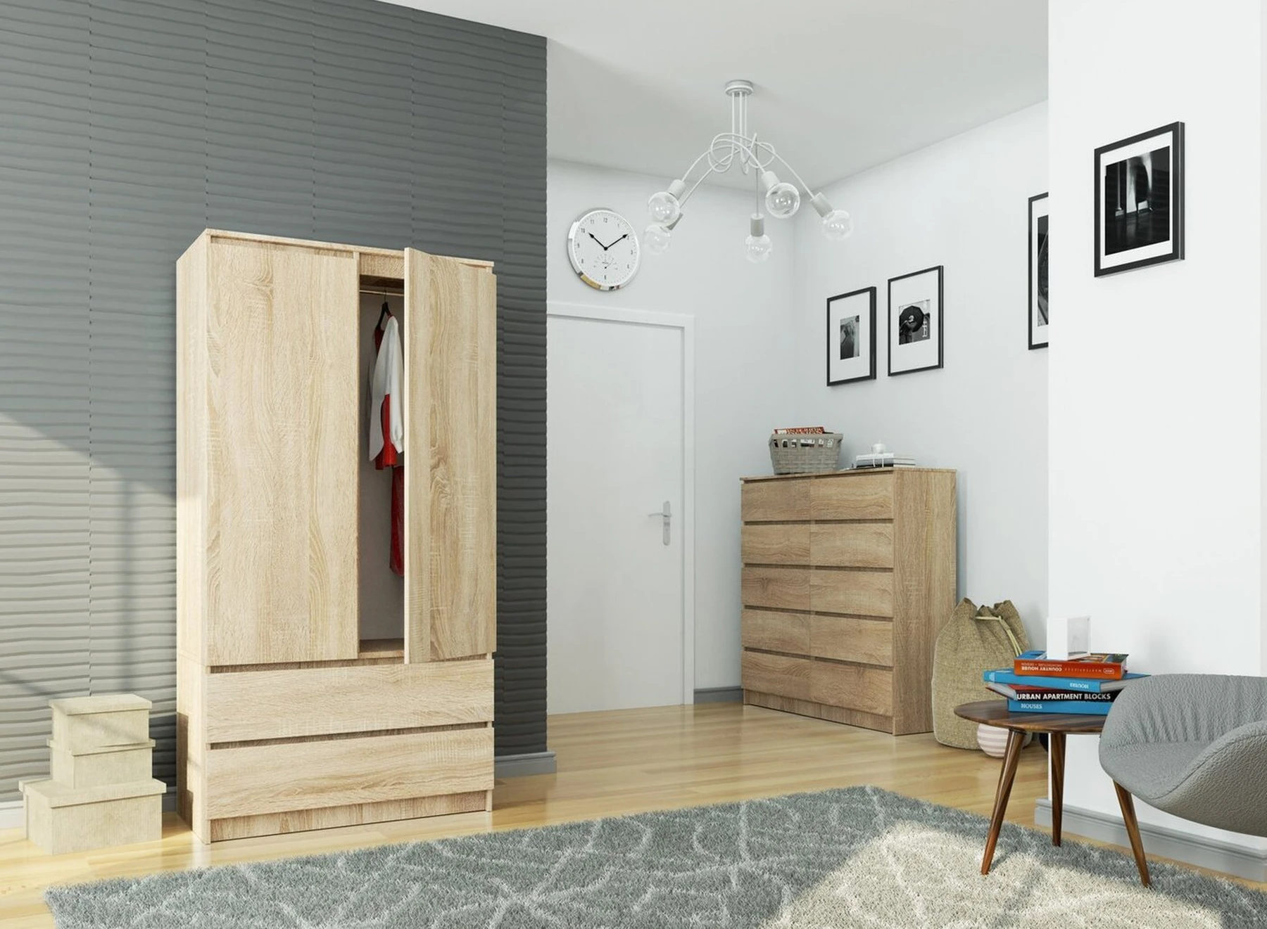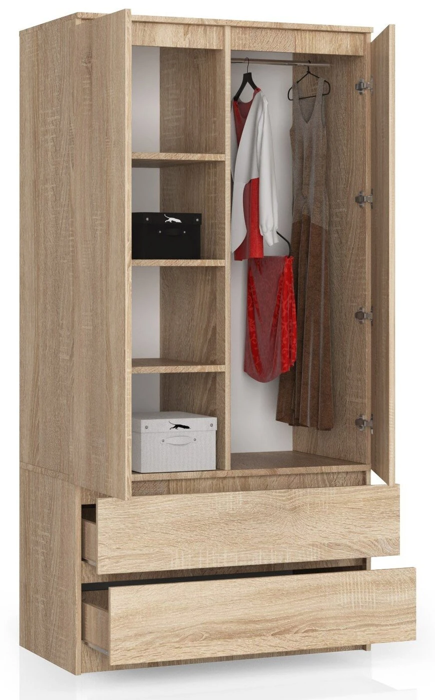 Aprašymas buvo automatiškai išverstas, gali pasitaikyti klaidų. - Spinta iš laminuotos plokštės Kronospan, atsparios trinčiai - Stalčių fasadai iš laminuotos plokštės - Durelių viduje yra lentyna ir drabužiai bėgis - Stalčiai juda ant metalinių garsiosios GTV kompanijos ritinėlių kreiptuvų - Kraštai yra padengti ABS briauna, užtikrinančia aukštą apsaugą nuo pažeidimų - Savarankiškai surenkama spinta - Instrukcija pridedama - Gamintojo garantija 24 mėn. Dviejų durų spinta su stalčiais yra universalus ir praktiškas baldas, kuris puikiai papildys miegamojo interjerą, holą ar svetainę studijos interjere. Dėl elegantiškos apdailos ir sonomos ąžuolo spalvų spinta puikiai dera prie klasikinio ir modernaus išdėstymo. Spintoje yra du talpūs stalčiai, pastatyti ant ritininių kreiptuvų, kurie puikiai tinka drabužiams ar atsarginiams antklodžių ir pagalvių užvalkalams, paklodėms, staltiesėms ar antklodėms laikyti. Už šarnyrinių durų esančioje baldų dalyje yra keturios erdvios lentynos ir baras pakaboms. Lentynos gali būti naudojamos megztiniams, palaidinukėms, rankinėms, bet ir, pavyzdžiui, rankšluosčiams. Kita vertus, bare bus galima pakabinti kostiumus, sukneles, sijonus ir viršutinius drabužius, pavyzdžiui, paltus ar švarkus. Baldai kruopščiai pagaminti iš aukščiausios kokybės laminuotos plokštės, kuri yra atspari trinčiai. Spintos kraštai apdailinti estetišku ABS briauna.