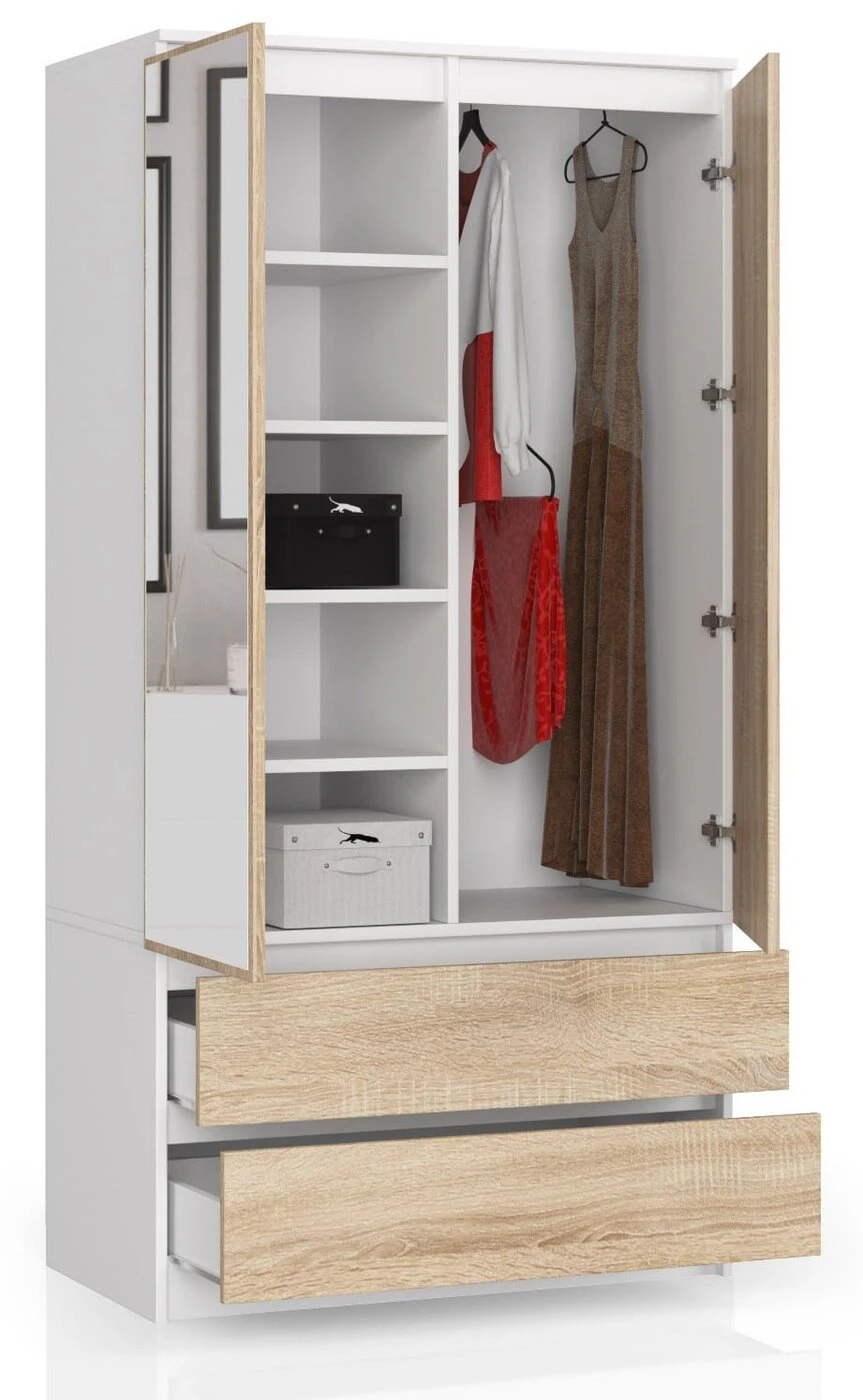 Aprašymas buvo automatiškai išverstas, gali pasitaikyti klaidų.S spinta yra elegantiškas ir praktiškas baldas. Puikiai tiks miegamajame, hole ar svetainėje, nes išsiskiria patraukliu, akį traukiančiu stiliumi. Baldą patogu naudoti, nes panaudoti šiuolaikiški ir praktiški dizaino sprendimai, tokie kaip erdvios lentynos, stalčiai, drabužių bėgeliai. Garsios GTV kompanijos metalinių ritininių kreiptuvų dėka stalčius atidaryti ir uždaryti lengva ir paprasta. Spintoje yra varstomos, dvigubos durelės su veidrodžiu Spinta atrodo labai įspūdingai. Sonoma ąžuolo spalvos fasadai ir, baltas korpusas sudaro labai įdomų ir nuoseklų spalvų derinį. Modelis S pagamintas iš šių medžiagų: 16 cm laminuota plokštė kraštas - ABS fanera matinė apdaila Aukštos kokybės laminuota plokštė yra atspari trinčiai, o ABS fanera puikiai apsaugo nuo mechaninių pažeidimų. Matinė apdaila atrodo elegantiška ir lengvai valoma. Spintos S, balta / sonoma matmenys: plotis - 90 cm aukštis - 180 cm gylis - 51 cm stalčiaus gylis - 44,5 cm stalčiaus plotis - 81 cm , balta spinta / sonoma yra labai funkcionalus baldas. Spintos vidus padalintas, kairėje pusėje yra lentynos, o dešinėje – praktiški strypai drabužiams pakabinti. Erdviose lentynose galima estetiškai susidėti, pavyzdžiui, dėžutes su įvairia tekstile ar kitais kasdieniais daiktais. Pateiktas modelis puikiai dera tiek prie klasikinių, tiek prie modernių derinių.
