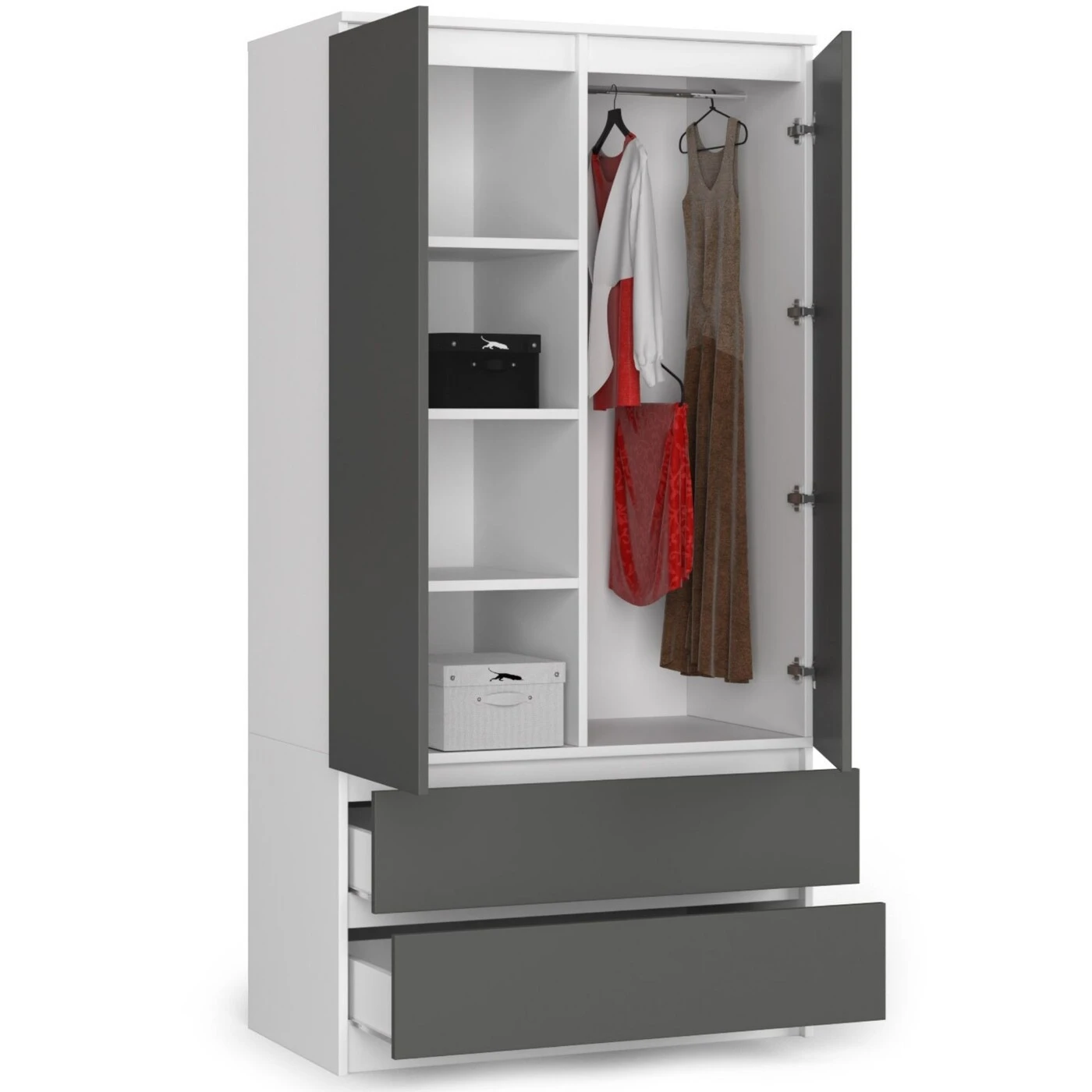 Aprašymas buvo automatiškai išverstas, gali pasitaikyti klaidų. Dviejų durų spinta pagaminta iš trinčiai atsparios laminuotos plokštės. Baldo korpusas visiškai, baltas, o tiek durelių fasadai, tiek stalčiai – pilkas grafitas laminate. Tokiu būdu buvo gautas įdomus kontrasto efektas, tuo labiau matomas, kad net ir žiūrint į baldą tik iš priekio, aiškiai matome balto korpuso elementus. Apatinė spintos dalis susideda iš dviejų lygiagrečiai vienas virš kito išdėstytų stalčių, o viršutinis, aukštesnis segmentas padalintas į dvi dalis. Kairėje yra 4 lentynų eilė, o dešinioji su lentyna skirta drabužiams pakabinti. Būdingos pristatomos spintos savybės: didelė baldų talpa (plotis 90 cm, aukštis 180 cm ir gylis 51 cm); aukštos kokybės apdailos medžiagos (korpusas iš Kronospan plokščių, metalas stalčių kreiptuvai); baldų kraštai sutvirtinti ABS; lengva sutvarkyti drabužius dėl įvairių laikymo galimybių; universalus sprendimas – baldai gali išpildyti jo funkcija daugelyje patalpų; didelė išdėstymo galimybė dėl dviejų spalvų apdailos; dvejų metų gamintojo garantija. Kaip ir kitų gamintojų spintos, pristatytas baldas puikiai tiks ne vienai svetainei. Juo sėkmingai galite įrengti miegamąjį, paauglio ar jaunesnio vaiko kambarį, svetainę ar net prieškambarį. Dviejų durų spinta su stalčiais taip pat yra geras sprendimas mažam biurui.
