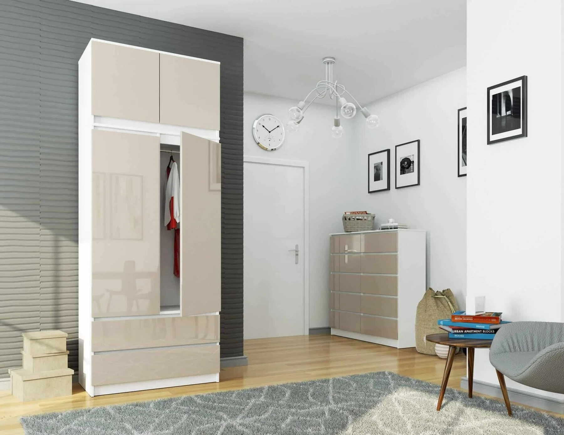 Aprašymas buvo automatiškai išverstas, gali pasitaikyti klaidų. Spintoje su S 90 cm prailginimu yra dvi durys ir du stalčiai. Jis yra paprastos formos ir labai erdvus. Tai padės išlaikyti tvarką, kai kalbama apie drabužius ir tekstilę. Jis išsiskiria įdomia spalvų gama: baltos ir kapučino spalvos derinys su blizgesiu. Tai puikus pasiūlymas svetainei, miegamajam ar svetainei. Spinta puikiai dera su šiuolaikinėmis minimalizmo, paprastumo ir stiliaus tendencijomis. Spinta daugeliu atžvilgių yra puikus pirkinys. Čia pateikiami svarbiausi jo privalumai: atsparumas – baldai pagaminti iš kokybiškos Kronospan laminuotos plokštės, todėl yra atsparios dilimui, talpa - spinta susideda iš dviejų durelių, stalčių ir priestato, dėl ko ji suteikia daug laisvos erdvės plėtrai, funkcionalumas - kairėje ir dešinėje spintos pusėse lentynos turi drabužių kabyklą, patogus naudojimas – stalčiai juda ant metalinių ritinėlių kreiptuvų iš garsios GTVm kompanijos ilgaamžiškumas – spintelės kraštai padengti ABS briauna, kuri suteikia apsaugą nuo pažeidimų, šiuolaikiška spintos išvaizda ir įdomios spalvos, patraukli kaina garantija 24 mėn. Spintelė skirta montuoti savarankiškai. Sunku niekam neturėtų būti, nes prie užsakymo pateikiamos aiškios instrukcijos. Baldai pasižymi aukšta estetika. Spinta tvirta ir ilgaamžė, todėl tarnaus ilgus metus. Tai kokybiškas baldas už palankią kainą, pateisinantis visus lūkesčius. Tai leidžia palaikyti tvarką ir tuo pat metu atrodys gražiai.