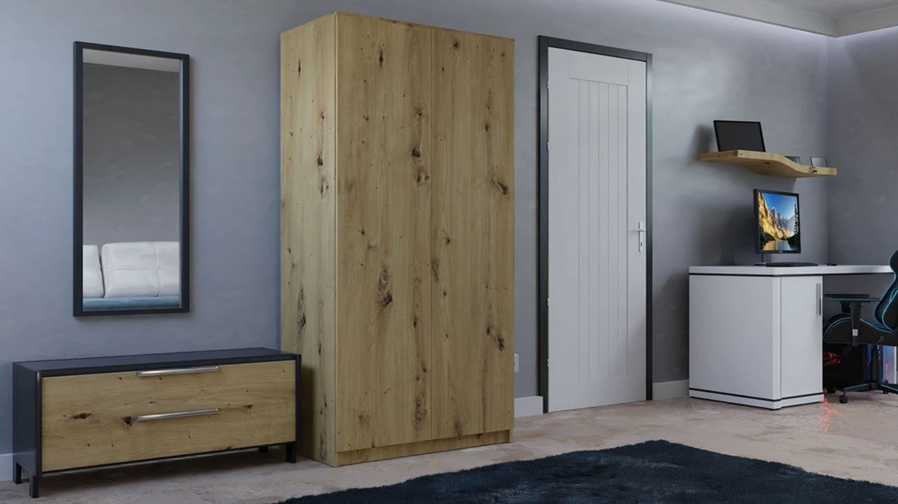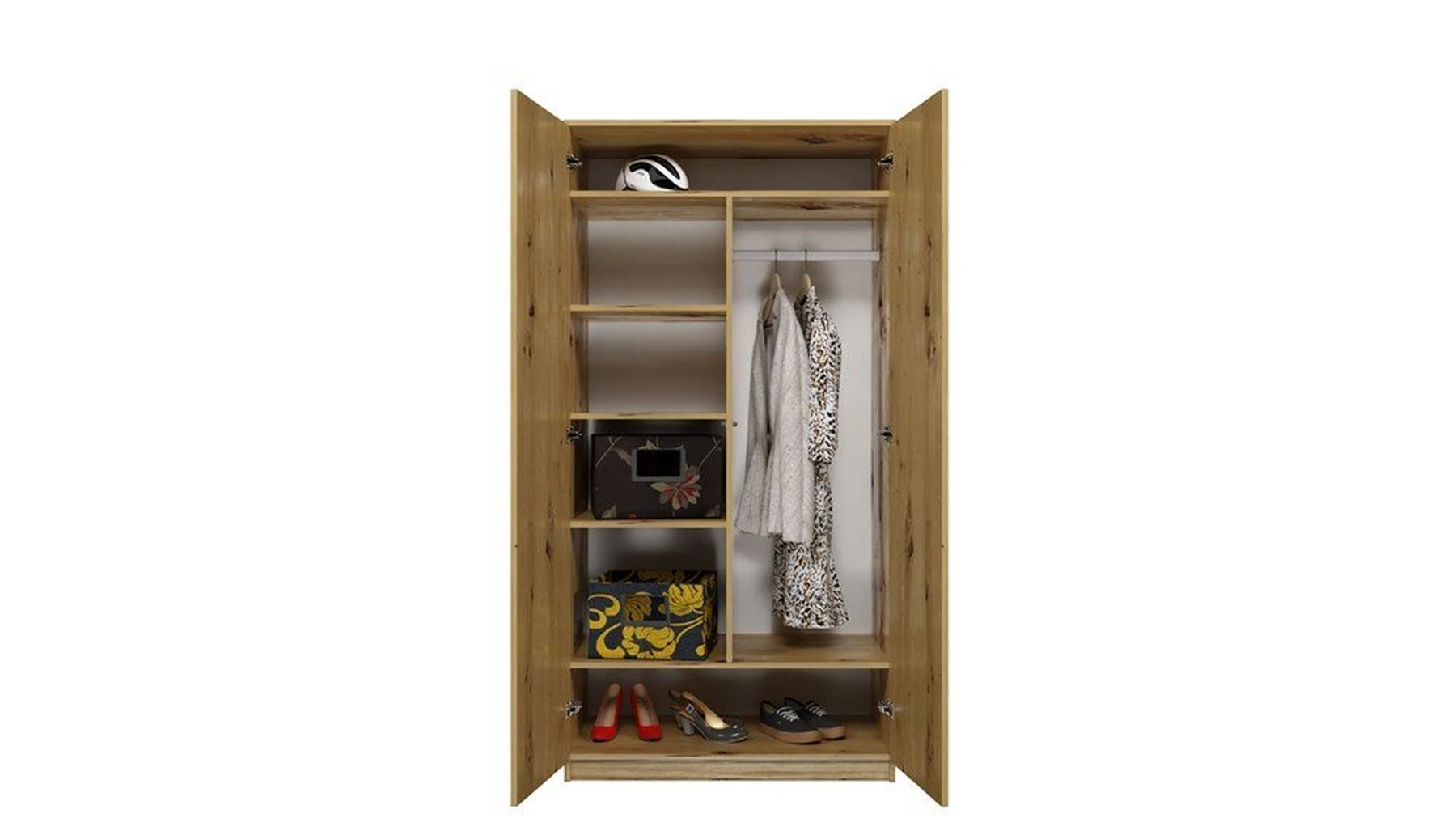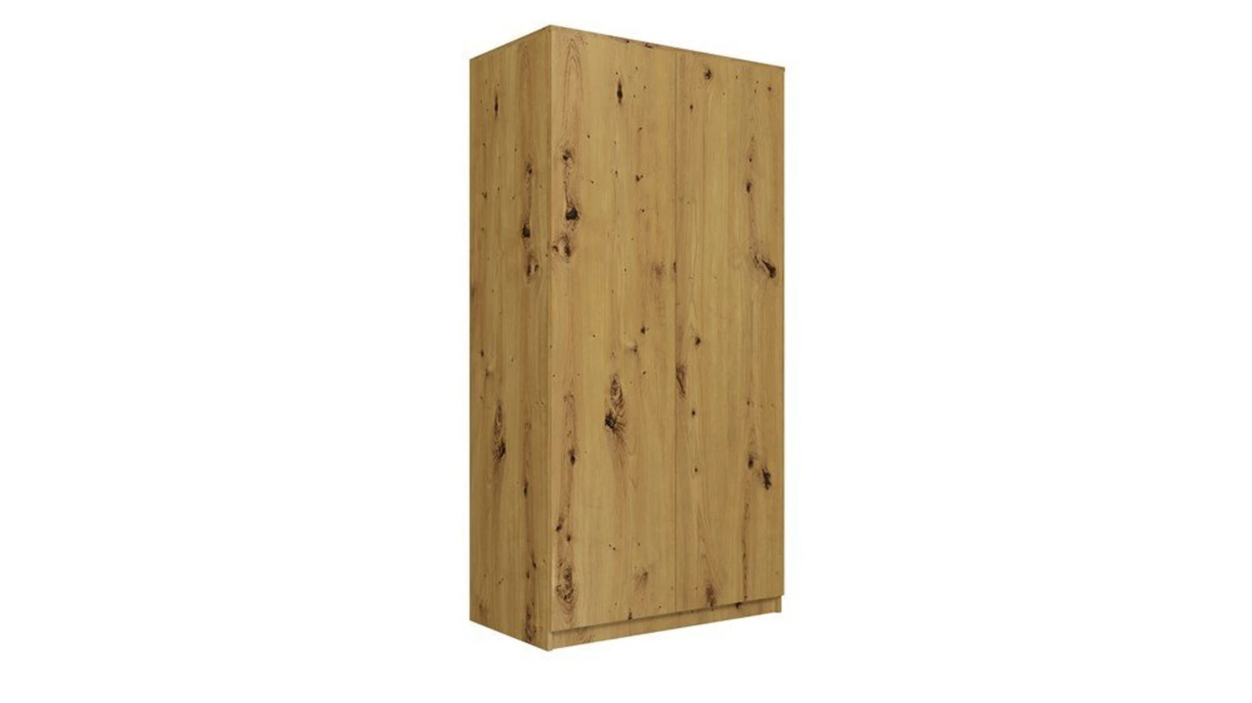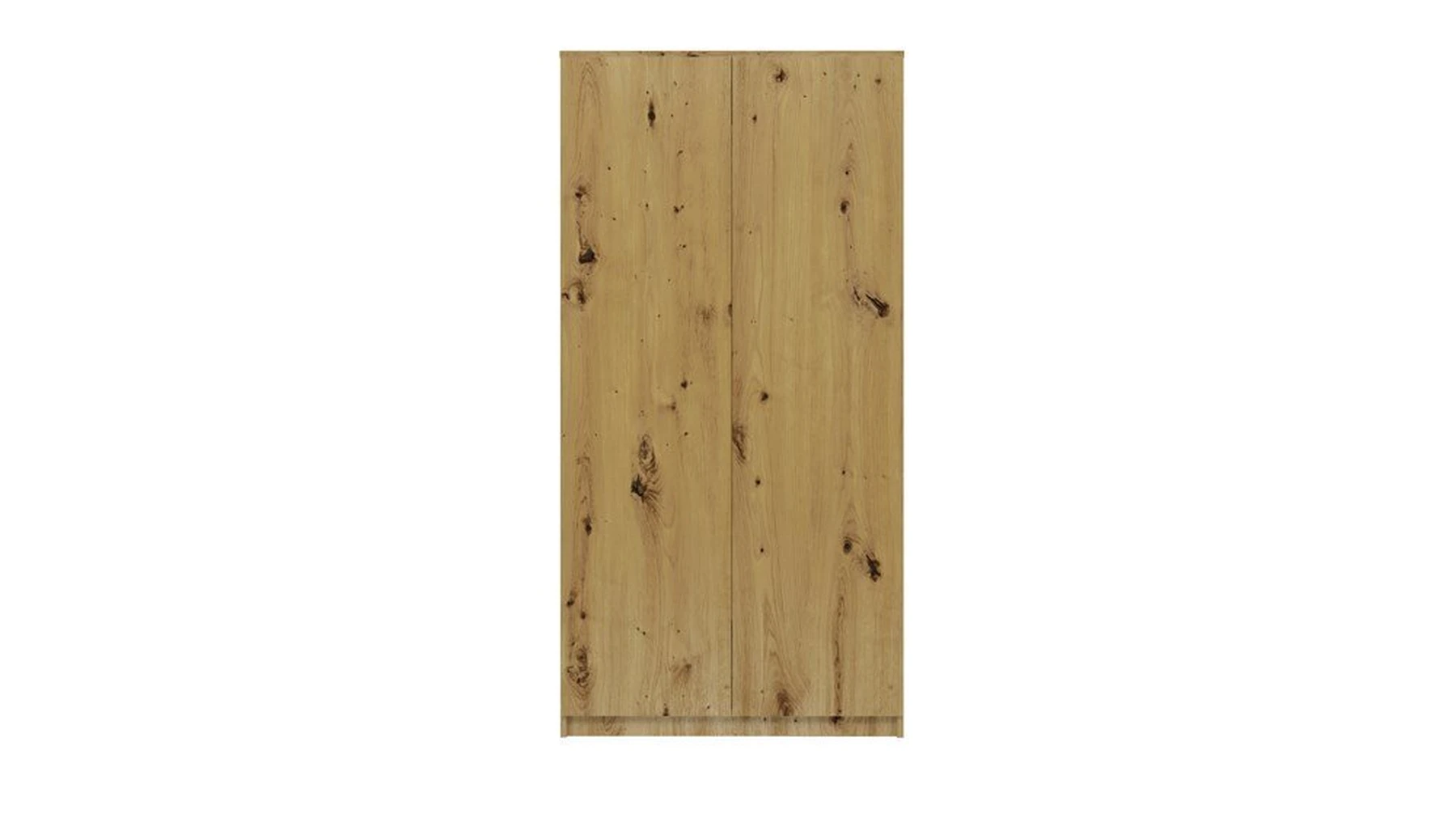 Praktiška dviejų durų spinta;Spintos vidaus išplanavimas pavaizduotas trečioje ir ketvirtoje nuotraukoje;Lentynas galima montuoti tiek dešinėje, tiek kairėje pusėje;TIP-ON sistemos spintos durys;Spinta pagaminta iš 16 mm storio laminuotos medžio drožlių plokštės (MDP) su ABS kraštų apdaila;Spintos išoriniai išmatavimai: plotis –90 cm, aukštis – 180 cm, gylis – 50 cm;Spintos spalva: natūrali;
