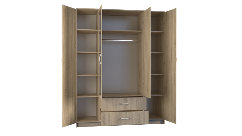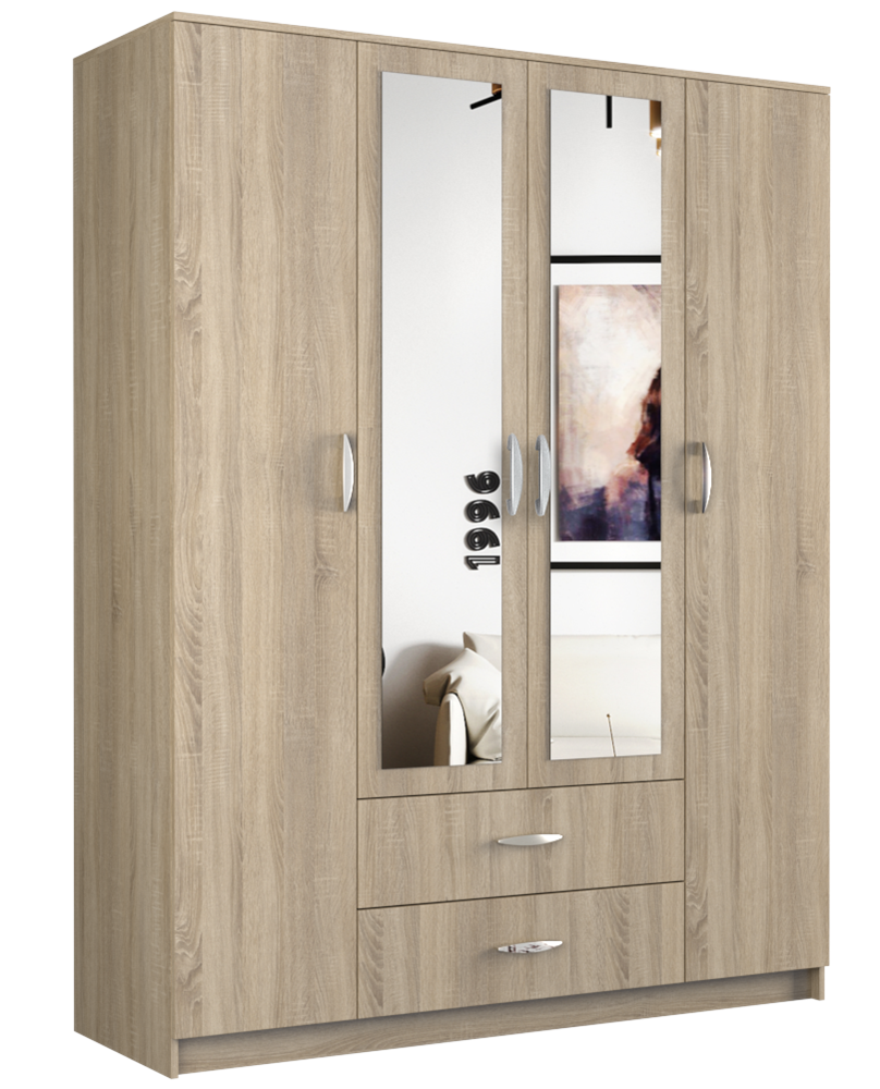 keturių varstomų durų ir dviejų stalčių spinta;spinta pagaminta iš laminuotos medžio drožlių plokštės (MDP) su ABS kraštų apdaila;vidurinės durys su veidrodžiu;spintos išmatavimai: plotis - 160 cm, gylis - 52 cm, aukštis - 205 cm;spintos spalva: Sonoma ąžuolas;vidinis spintos išplanavimas pavaizduotas 2 nuotraukoje;tvirta ir stabili konstrukcija;