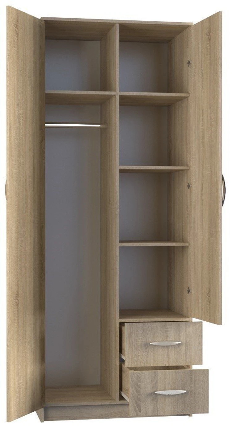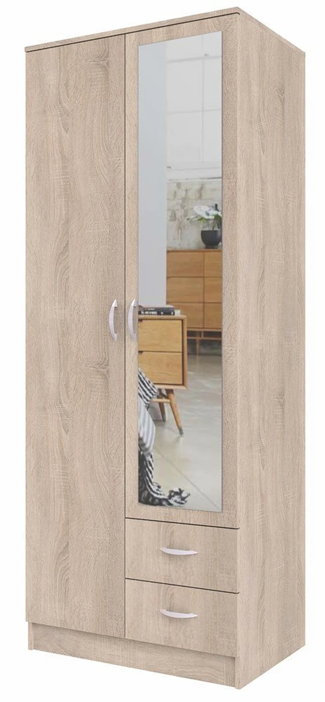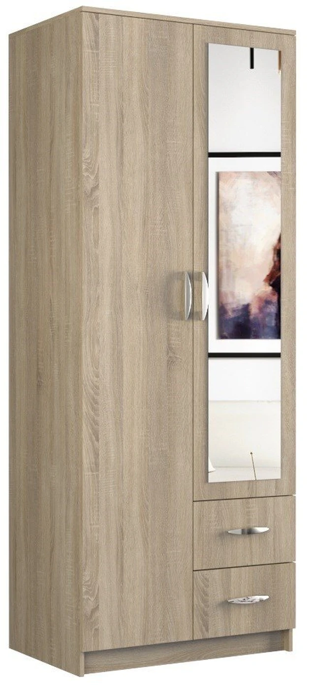 2- jų durų spinta;minimalistinio dizaino varstomos durys su veidrodžiu;pagaminta iš 16 mm laminuotos medžio drožlių plokštės (MDP), briaunos dailintos ABS danga;5 lentynos, 2 stalčiai ir kabykla;išmatavimai: aukštis - 205 cm, plotis - 80 cm, gylis - 52 cm;spalva - ąžuolo (sonoma);