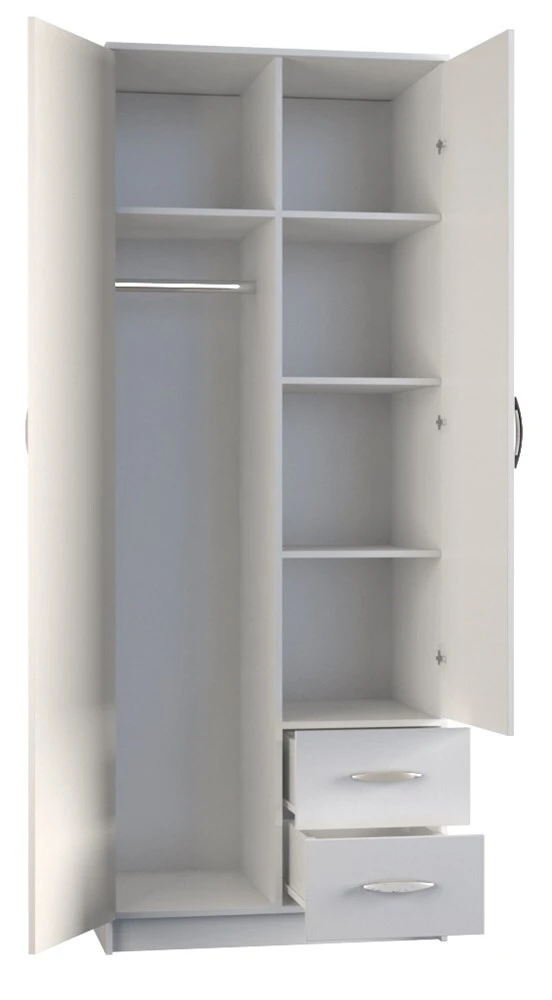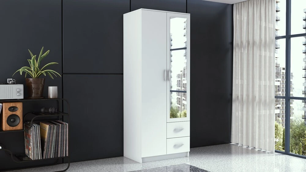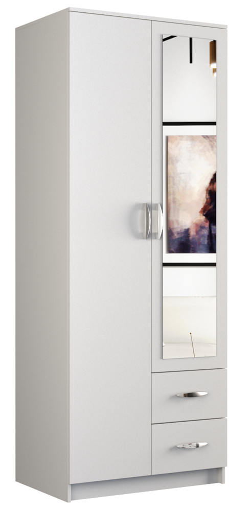 dviejų varstomų durų ir dviejų stalčių spinta;spinta pagaminta iš laminuotos medžio drožlių plokštės (MDP) su ABS kraštų apdaila;vienos durys su veidrodžiu;spintos išmatavimai: plotis - 80 cm, gylis - 52 cm, aukštis - 205 cm;spintos spalva: balta;vidinis spintos išplanavimas pavaizduotas 2 nuotraukoje;tvirta ir stabili konstrukcija;