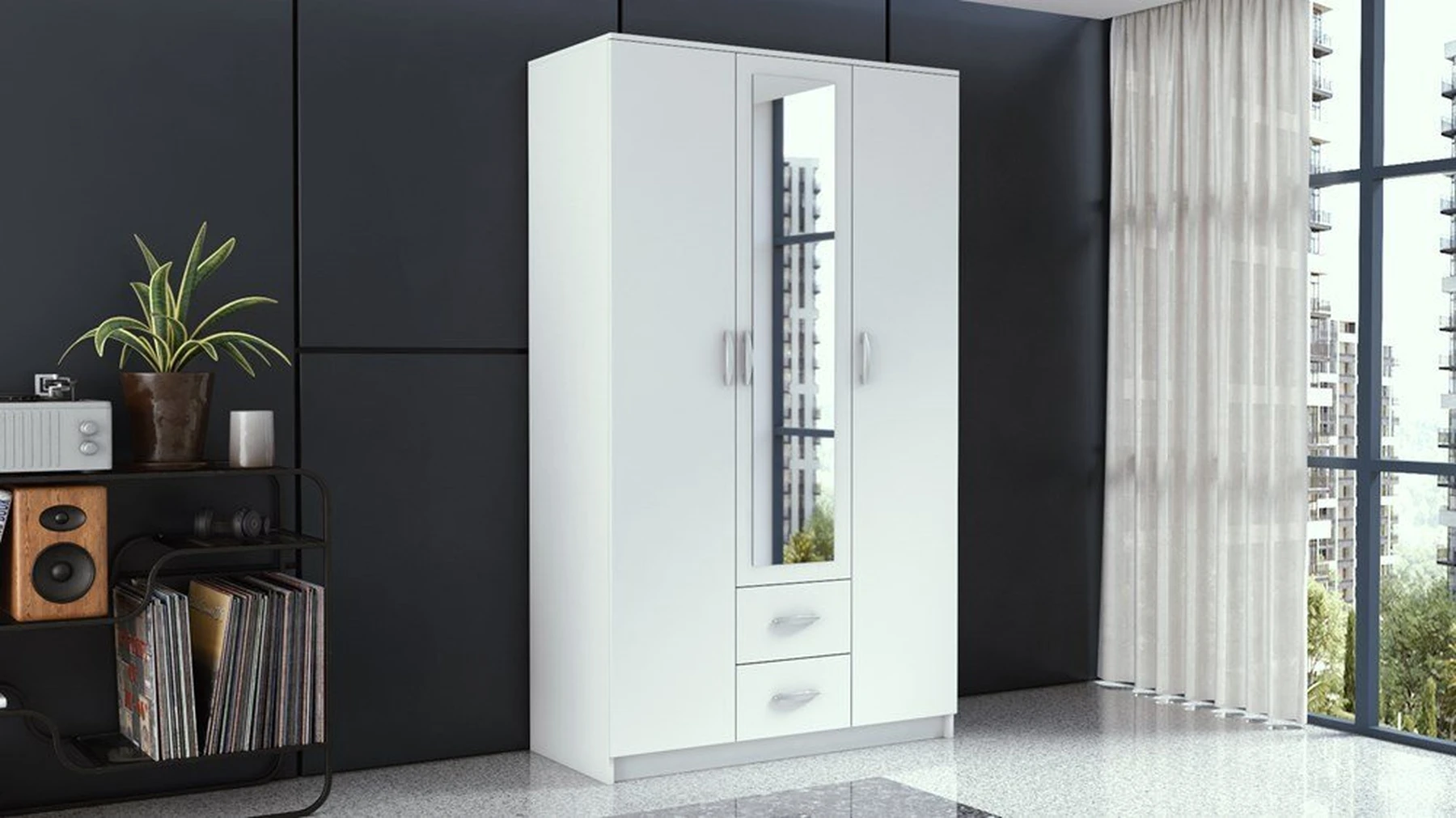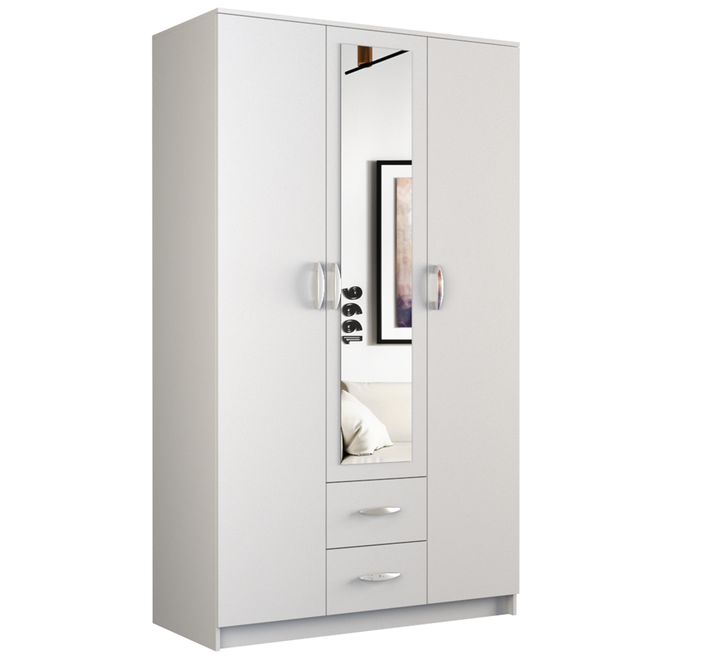3-ų durų ir 2-jų stalčių spinta;Spinta pagaminta iš laminuotos 16 mm medžio drožlių plokštės (MDP);Spintos kraštų apdailos medžiaga: ABS;Spintos išmatavimai: aukštis - 205 cm, plotis - 120 cm, gylis - 52 cm;Spalva: balta;Vidinis spintos išplanavimas pateiktas antroje nuotraukoje;Su 1 veidrodžiu;Prekė bus pristatyta nesurinkta;