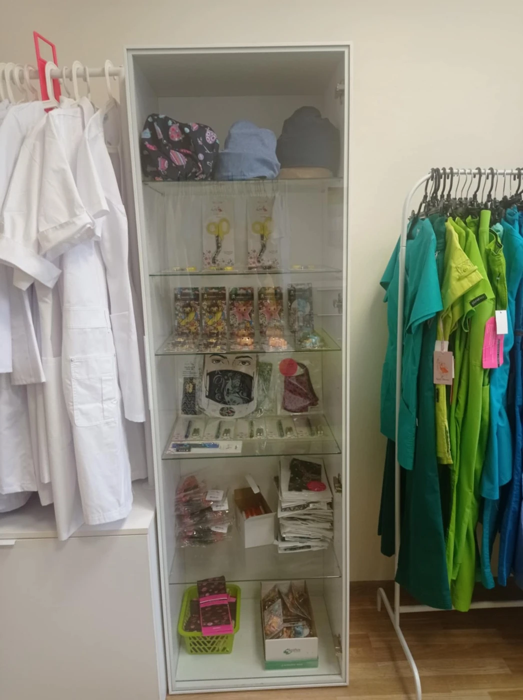 Spinta su stiklinėmis durimis. Viduje yra 6 stiklinės lentynos. Išmatavimai: 180x55x42 cm. Spinta dera su kitais drabužių parduotuvės baldais: kabyklomis ir spintomis su veidrodžiais. Spinta gaminta pagal užsakymą, yra labai geros būklės.
