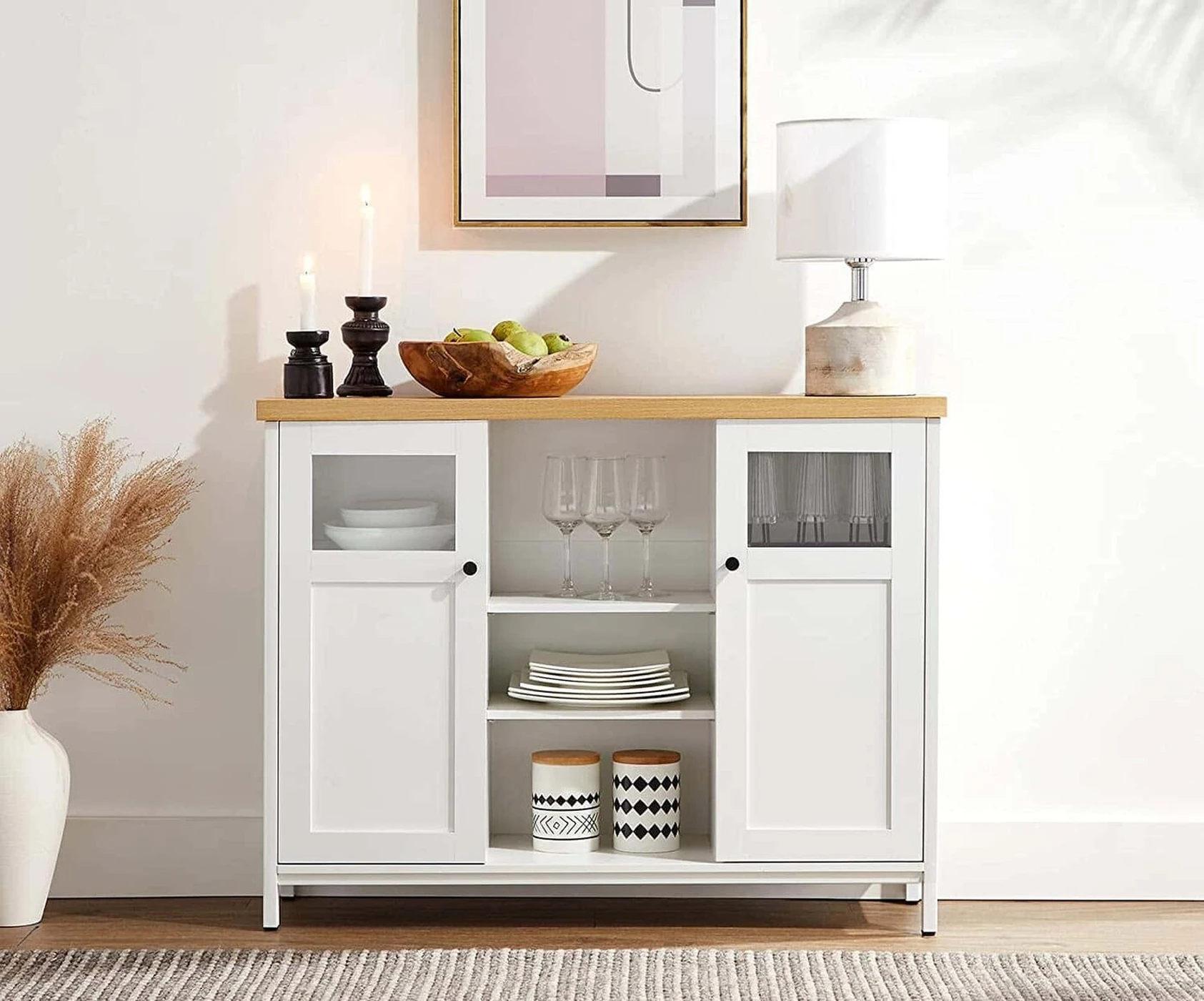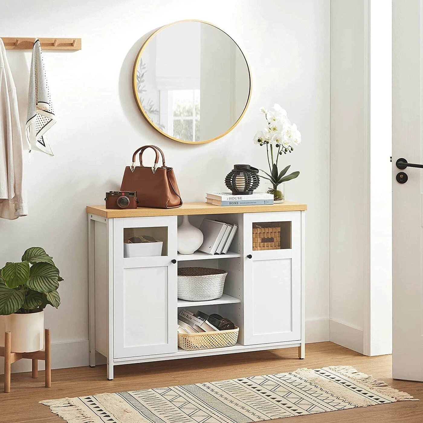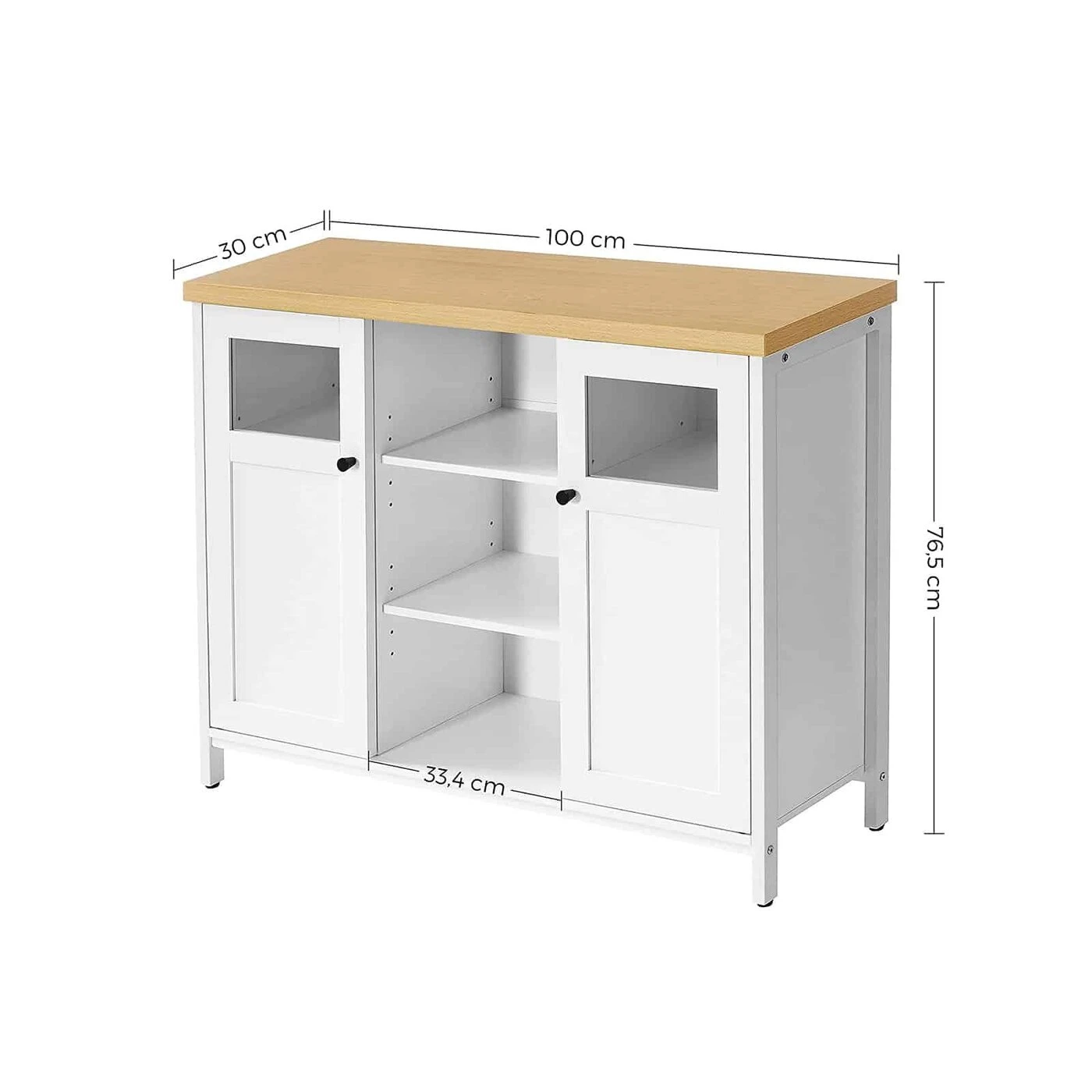 Aprašymas buvo automatiškai išverstas, gali pasitaikyti klaidų. Produkto detalės: - Spalva: baltas ąžuolas - Medžiaga: medžio drožlių plokštė, plienas, stiklas - Dydis: 100 x 30 x 76,5 cm (P x P x A) - Svoris: 24,3 kg - Maksimali statinė paviršiaus apkrova: 30 kg - Maksimali statinė apkrova vienam lentynos lygiui: 10 kgPristatymo komplektas:- 1 x saugojimo spintelė- 1 x priedų pakuotė- 1 x apsauga nuo apvirtimo- 1 x instrukcijaVASAGLE Pastabos:- Saugumo sumetimais vaikams draudžiama lipti ant gaminio ar žaisti su juo.- Pritvirtinkite šį gaminį prie pateikto apsaugos nuo apvirtimo įtaiso Sienos, kad būtų užtikrintas saugus naudojimas.