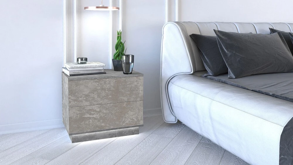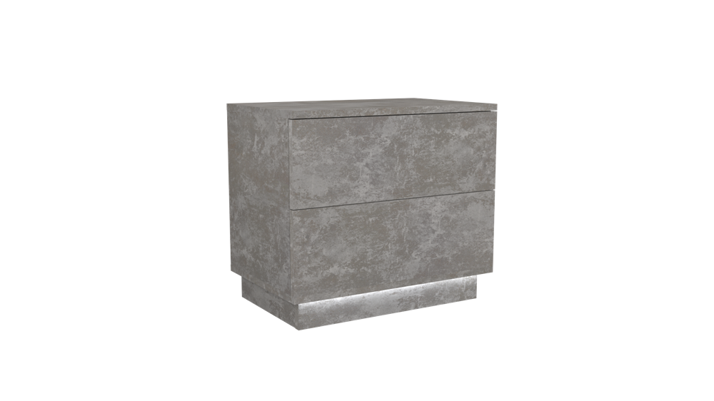 Modernaus dizaino spintelė su dviem stalčiais ir LED apšvietimu;2 ištraukiami, talpūs stalčiai;Stalčių bėgeliai ritininiai;TIP-ON sistemos stalčius be rankenų lengvai atidarysite juos švelniai paspaudę;Spintelė pagaminta iš laminuotos medžio drožlių plokštės (MDP) su ABS kraštų apdaila;Spintelės išmatavimai: plotis - 55 cm, aukštis - 47 cm, gylis - 35 cm;Spintelės spalva: pilka;