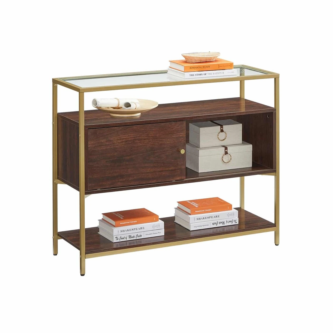 Aprašymas buvo automatiškai išverstas, gali pasitaikyti klaidų. Produkto detalės: - Spalva: šokoladinis rudas matinis auksas - Medžiaga: medžio drožlių plokštė, plienas, grūdintas stiklas - Dydis: 100 x 35 x 80 cm (P x P x A) - Svoris: 23,3 kg - Maksimali statinė paviršiaus apkrova: 30 kg - Maksimali statinė apkrova vienam lygiui: 10 kgPristatymo komplektas: - 1 x saugojimo spintelė - 1 x priedų paketas - 1 x apsaugos nuo posvyrio įtaisas - 1 x rankinis (DE, EN, ES, FR, IT) VASAGLE Pastabos: - Saugumo sumetimais vaikams draudžiama lipti ant gaminio arba žaiskite su juo. - Pritvirtinkite šį gaminį prie sienos su komplekte esančia apsauga nuo apvirtimo, kad jis neapvirstų. - Šio gaminio paviršius pagamintas iš stiklo. Su juo elkitės atsargiai, kad nesuskiltų.