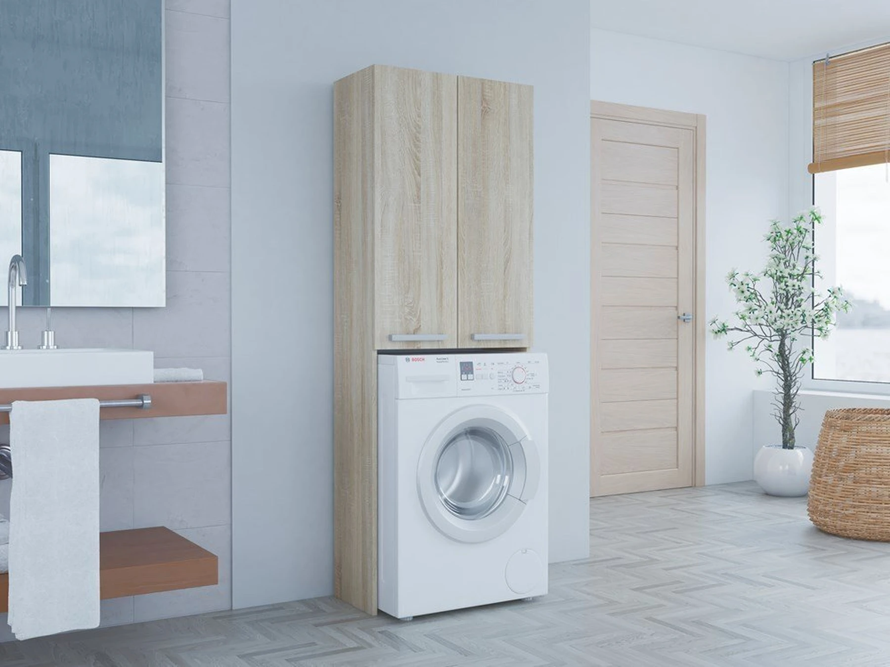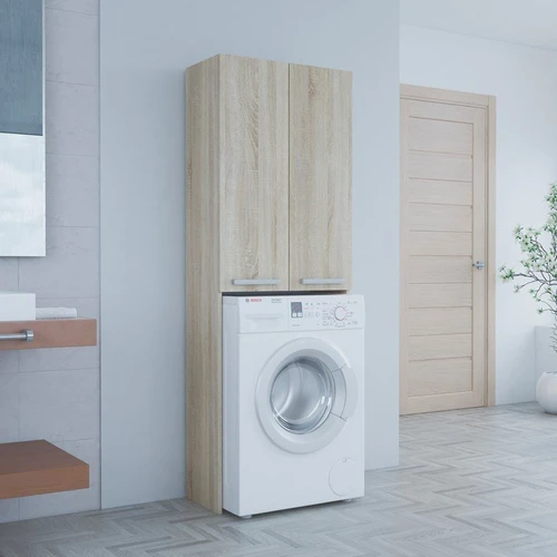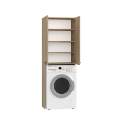 Pastatoma, dviejų durelių spintelė virš skalbimo mašinos;Spintelės viduje - 4 lentynos;Spintelė pagaminta iš 16 mm storio laminuotos medžio drožlių plokštės (MDP);ABS kraštų apdaila;Pilkos rankenos;Spintelės išmatavimai: aukštis – 183 cm; plotis – 64 cm, gylis – 30 cm;Skyriaus skalbimo mašinai matmenys: plotis - 60,8 cm, aukštis - 89 cm, gylis - 30 cm;Spintelės spalva: ąžuolo (sonoma);
