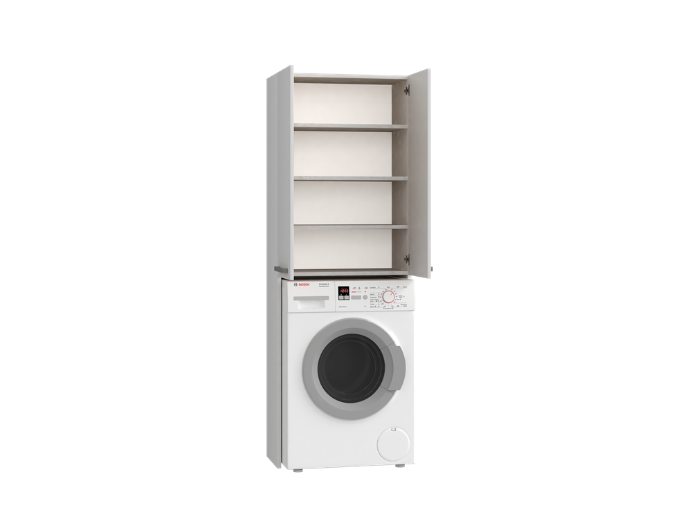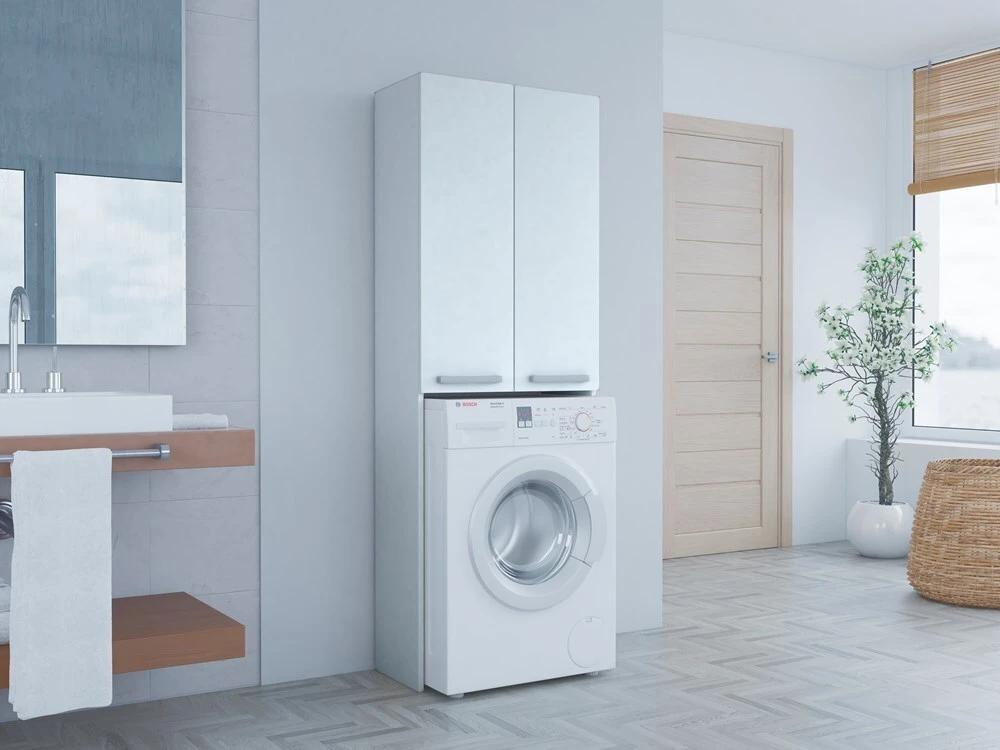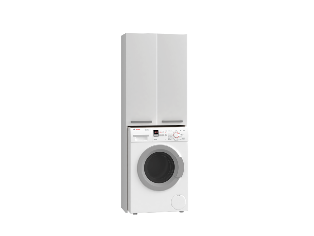 Pastatoma, dviejų durelių spintelė virš skalbimo mašinos;Spintelės viduje - 4 lentynos;Spintelė pagaminta iš 16 mm storio laminuotos medžio drožlių plokštės (MDP);ABS kraštų apdaila;Pilkos rankenos;Spintelės išmatavimai: aukštis – 183 cm; plotis – 64 cm, gylis – 30 cm;Skyriaus skalbimo mašinai matmenys: plotis - 60,8 cm, aukštis - 89 cm, gylis - 30 cm;Spintelės spalva: balta;