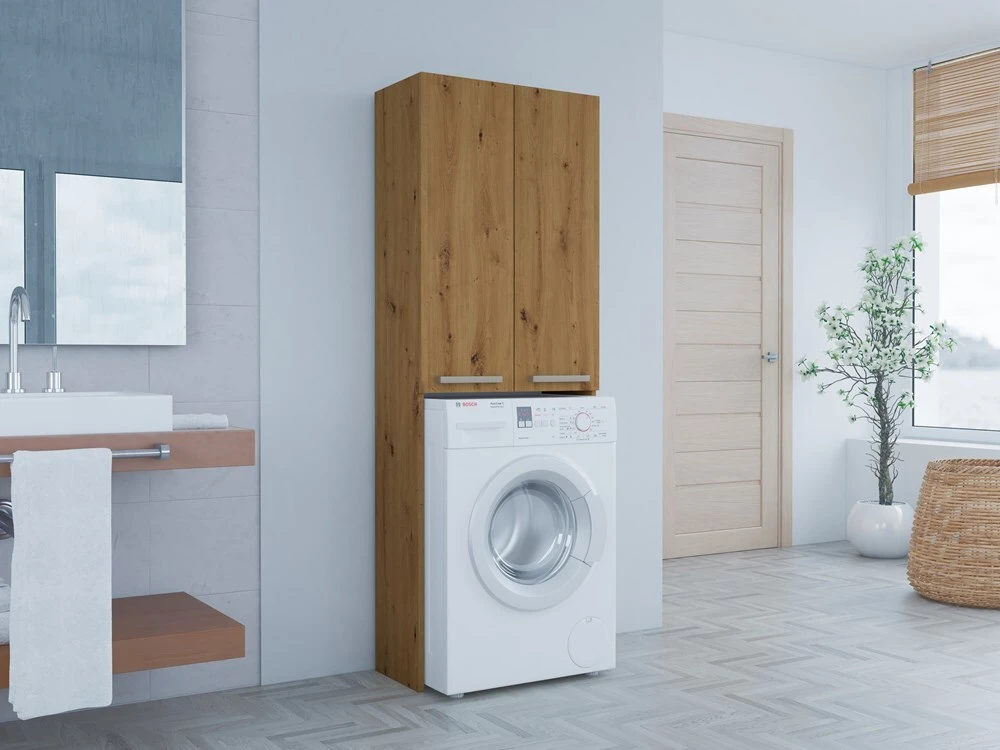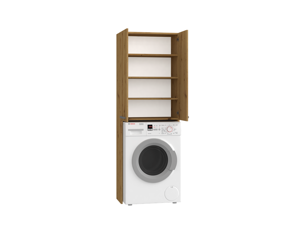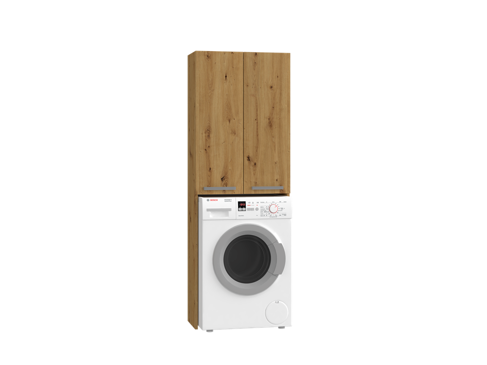 Pastatoma, dviejų durelių spintelė virš skalbimo mašinos;Spintelės viduje - 4 lentynos;Spintelė pagaminta iš 16 mm storio laminuotos medžio drožlių plokštės (MDP);ABS kraštų apdaila;Pilkos rankenos;Spintelės išmatavimai: aukštis – 183 cm; plotis – 64 cm, gylis – 30 cm;Skyriaus skalbimo mašinai matmenys: plotis - 60,8 cm, aukštis - 89 cm, gylis - 30 cm;Spintelės spalva: ruda (ąžuolo Artisan);