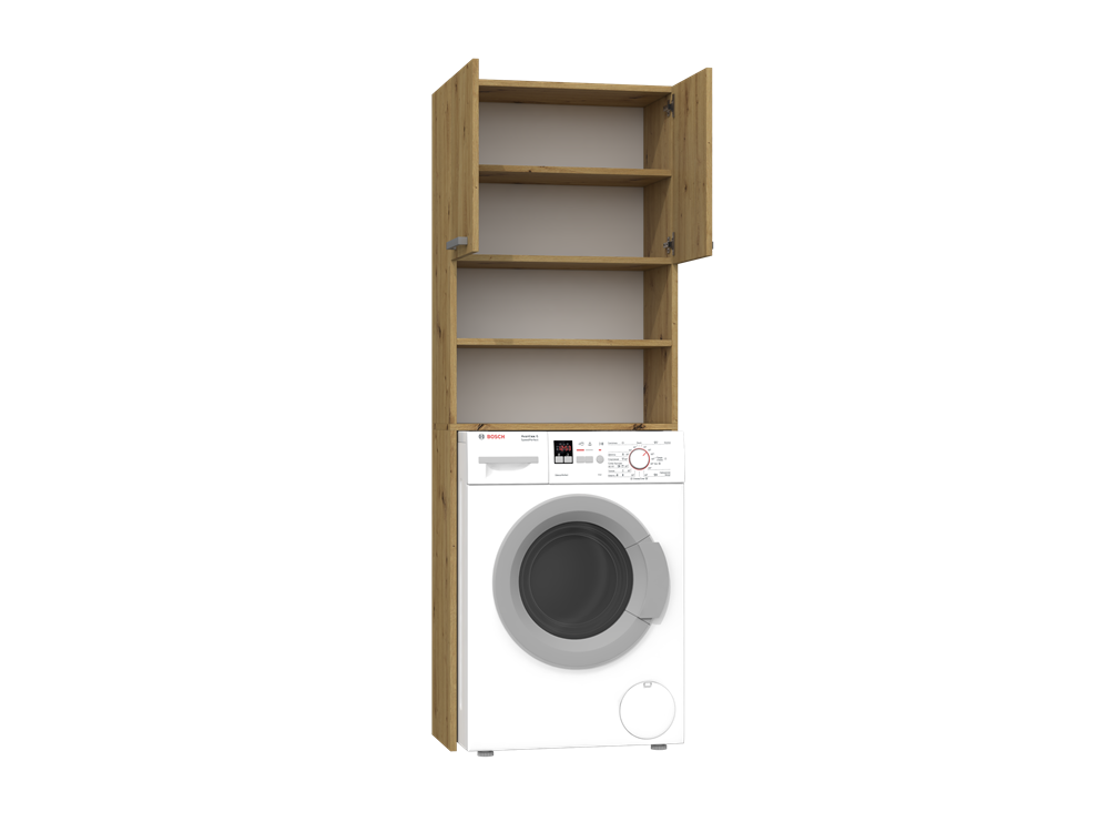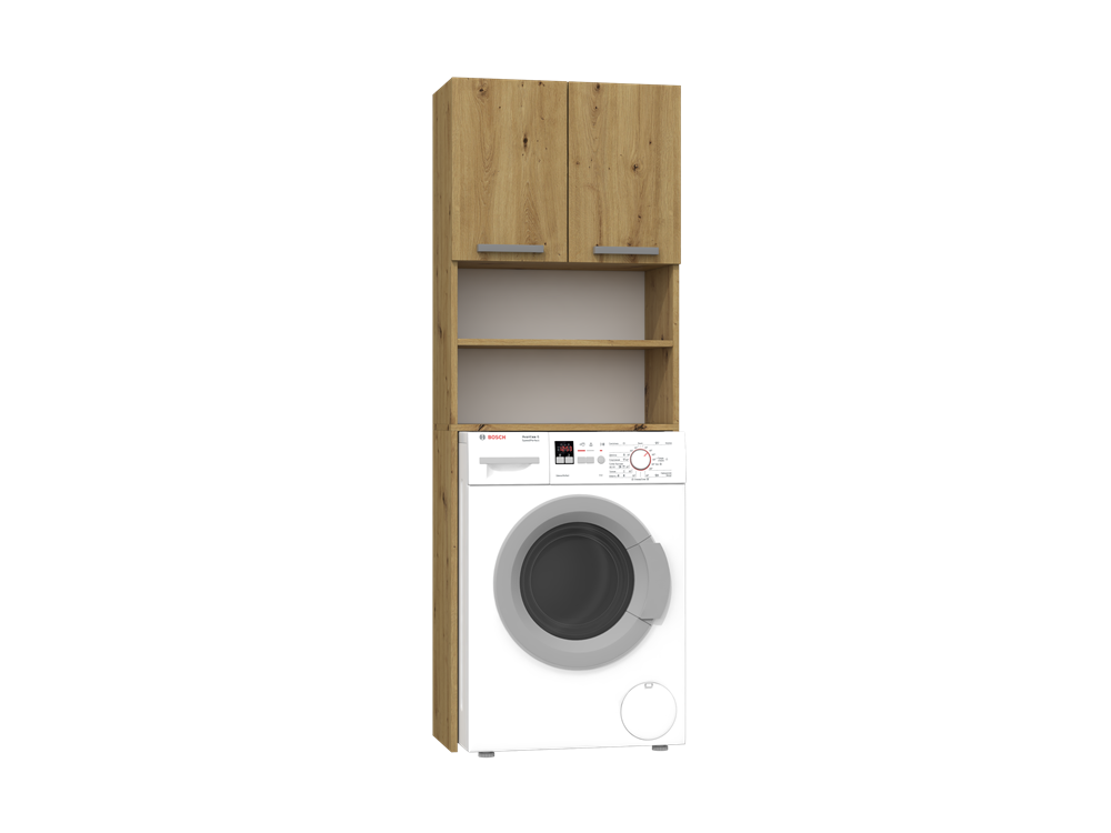 Pastatoma, dviejų durelių ir dviejų atvirų lentynų spintelė virš skalbimo mašinos;Spintelės viduje - 2 lentynos;Spintelė pagaminta iš 16 mm storio laminuotos medžio drožlių plokštės (MDP);PVC kraštų apdaila;Pilkos rankenos;Spintelės išmatavimai: aukštis – 183 cm; plotis – 64 cm, gylis – 30 cm;Skyriaus skalbimo mašinai matmenys: plotis - 60,8 cm, aukštis - 89 cm;Spintelės spalva: ruda (artisan oak);