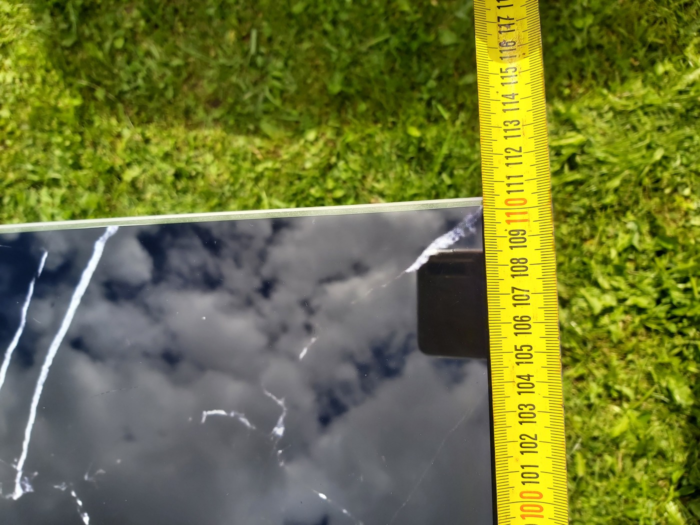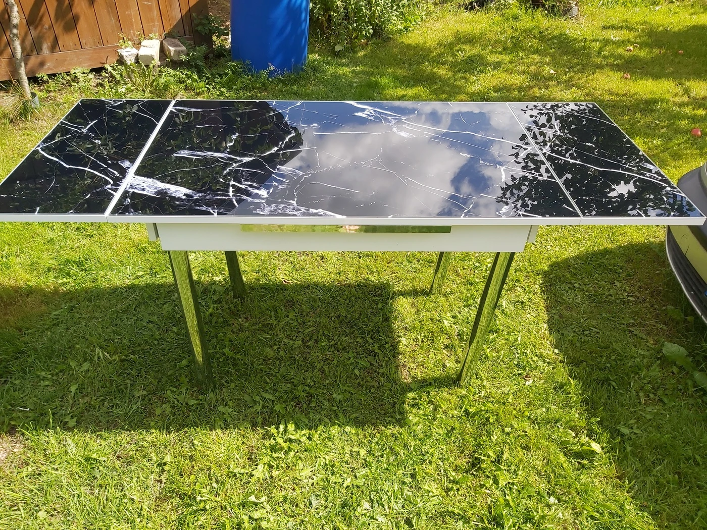 Parduodamas valgomojo stalas su stikliniu paviršiumi, išskleidžiamas. Dydis: plotis 70, ilgis 110 (išskleidus 170), aukštis 80. Defektai - nuo naudojimo minimaliai pabraižytas stiklinis paviršius, minimaliai pažeistas kampas, kojų atsilupę dažai keliose vietose (defektai pažymėti nuotraukose). Parduodamas už 100€. Kainą galima kažkiek paderinti. Stalas randasi Šakiuose, galima atvežti į Kauną arba į Vilnių.