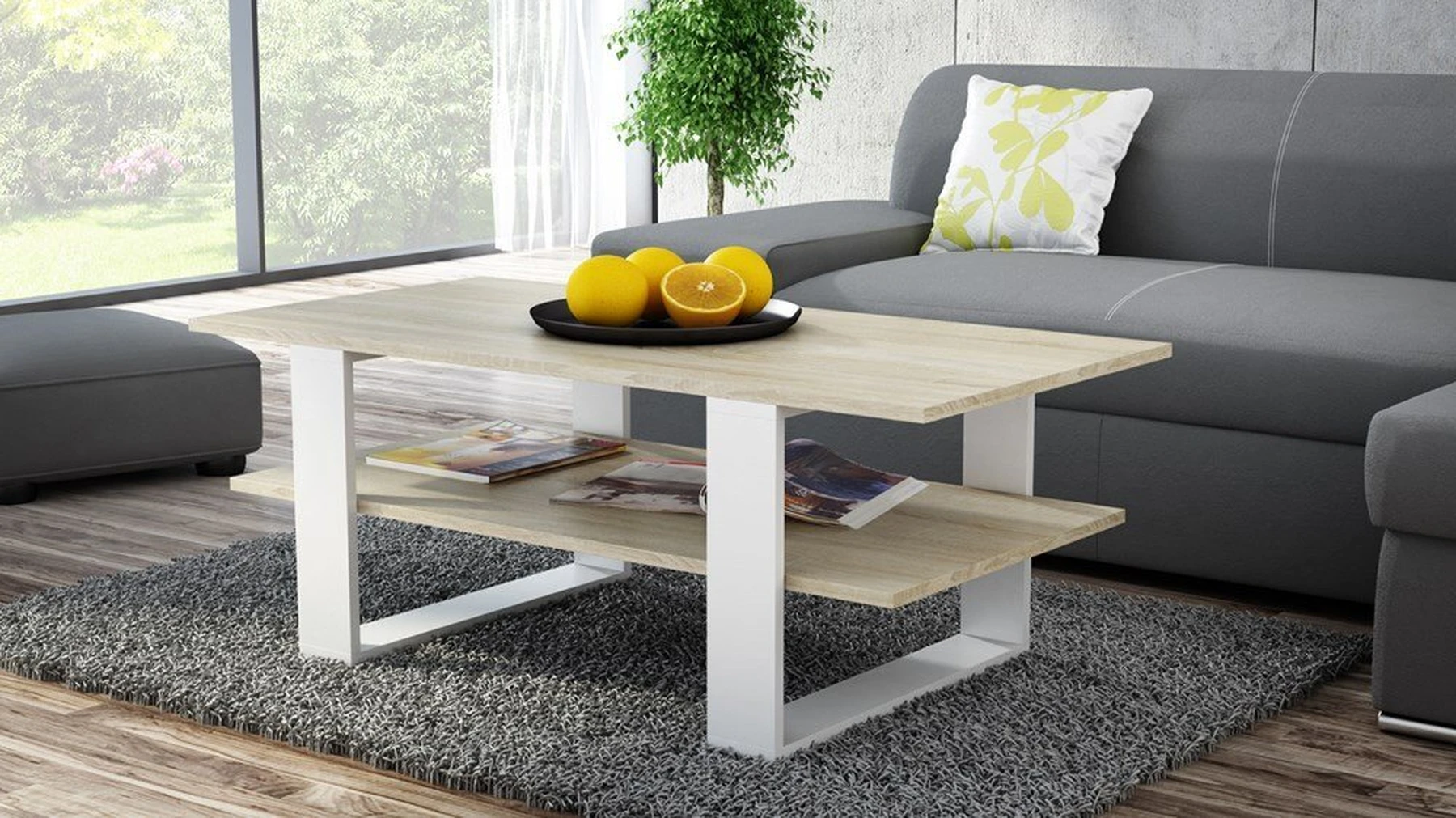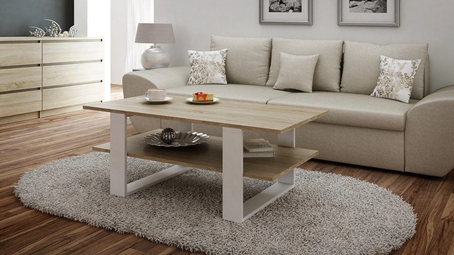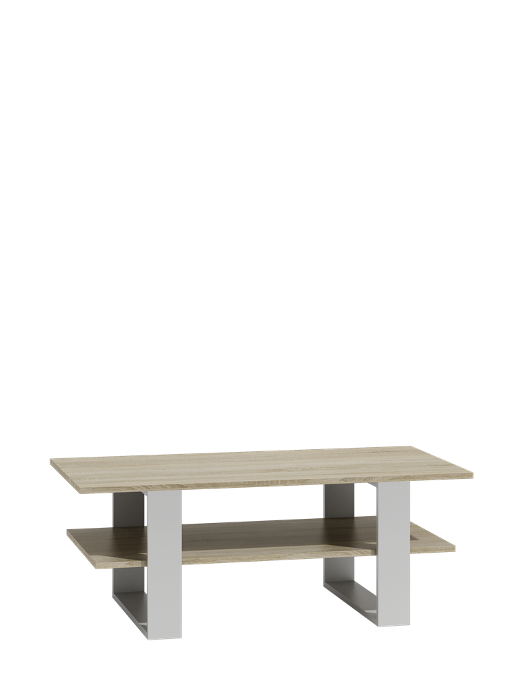 modernus, funkcionalus dizainas;stalas pagamintas iš 16 mm storio laminuotos medžio drožlių plokštės (MDP);Kraštai dailinti PVC danga;stalo viršutinės dalies ir lentynos spalva: ąžuolo (sonoma), stalo kojų spalva: balta;stalo išmatavimai: ilgis - 120 cm, plotis - 60 cm, aukštis - 55 cm;