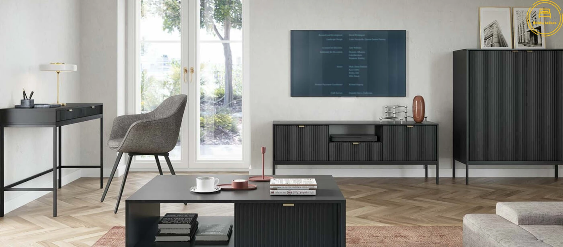 Modernus minimalistinio dizaino baldas papuoš Jūsų svetainę, o daiktus patogiai sudėsite į tam skirtus skyrius.Staliuko išmatavimai: plotis: 104 cm; 48 aukštis: cm; 68 gylis cm.Medžiaga: LMDP plokštė, ABS plastiku dengtos briaunos.