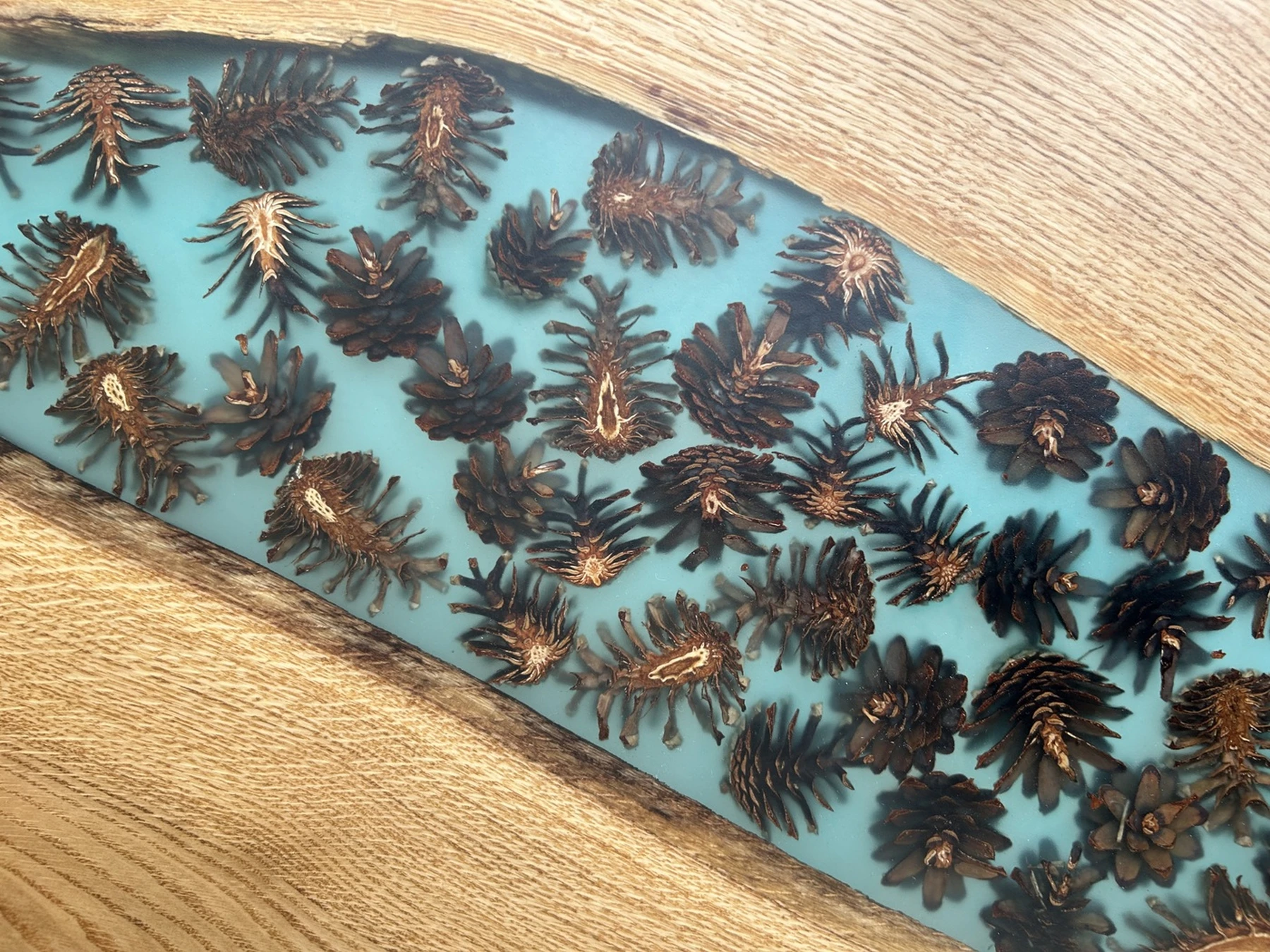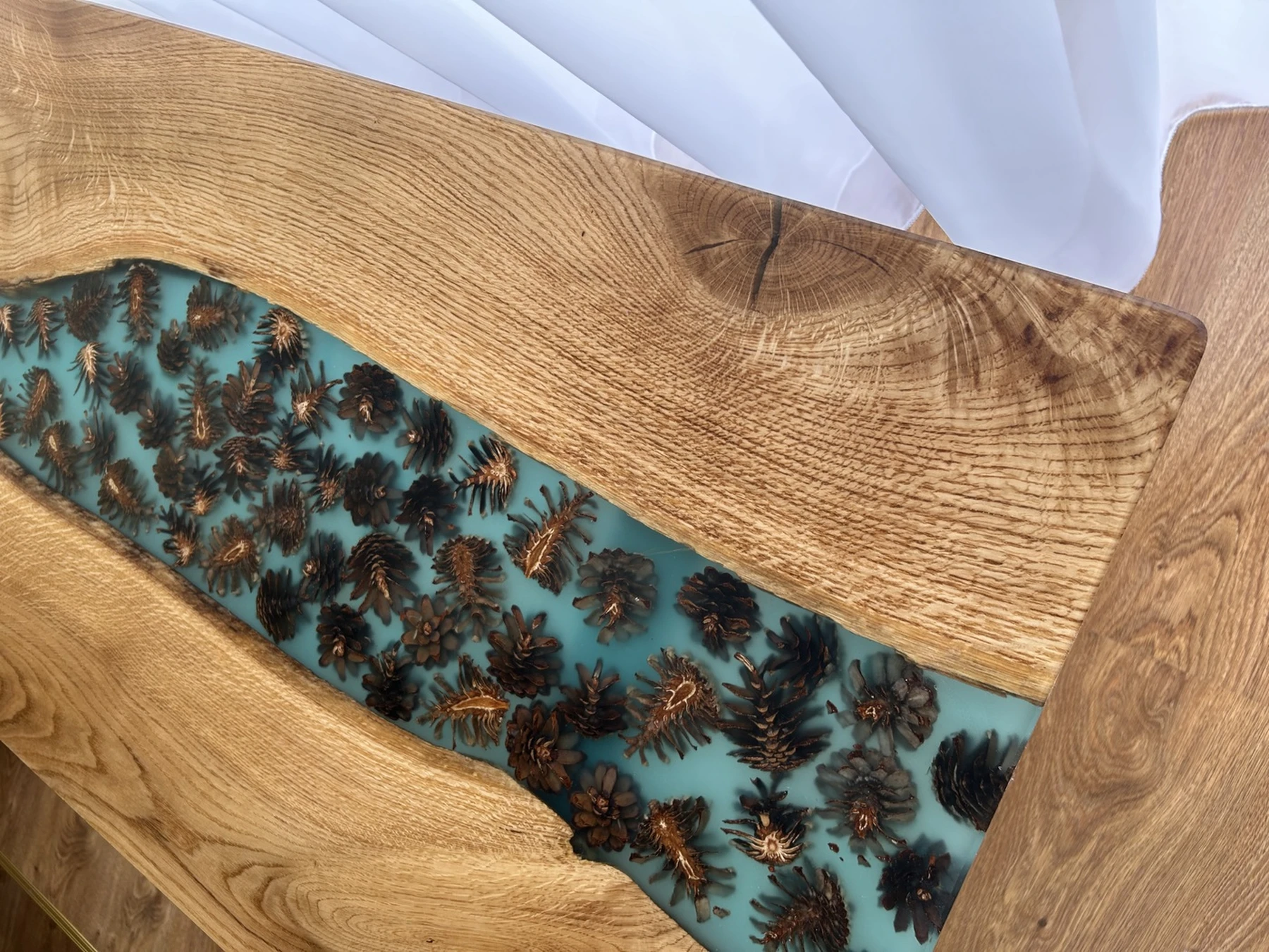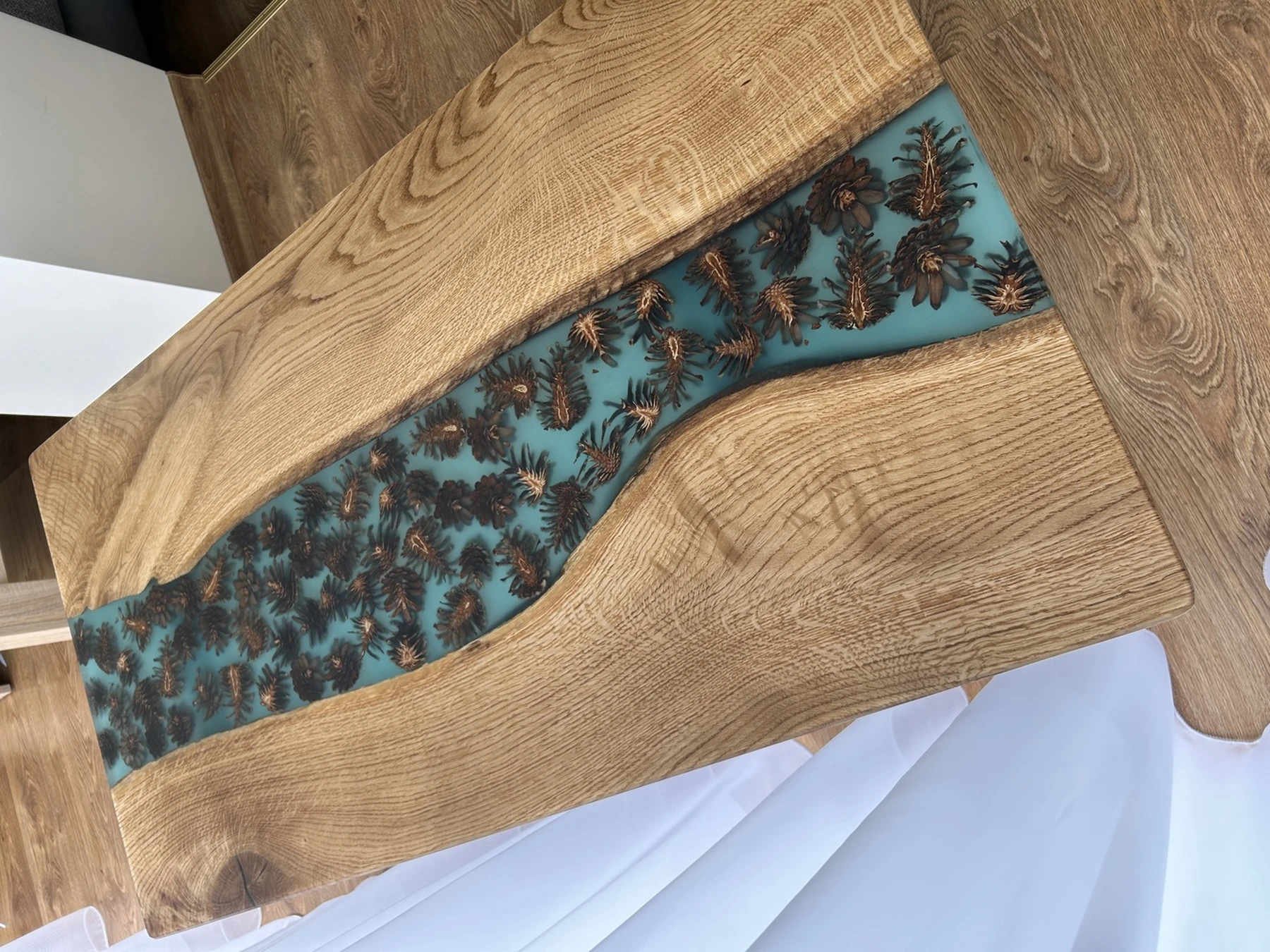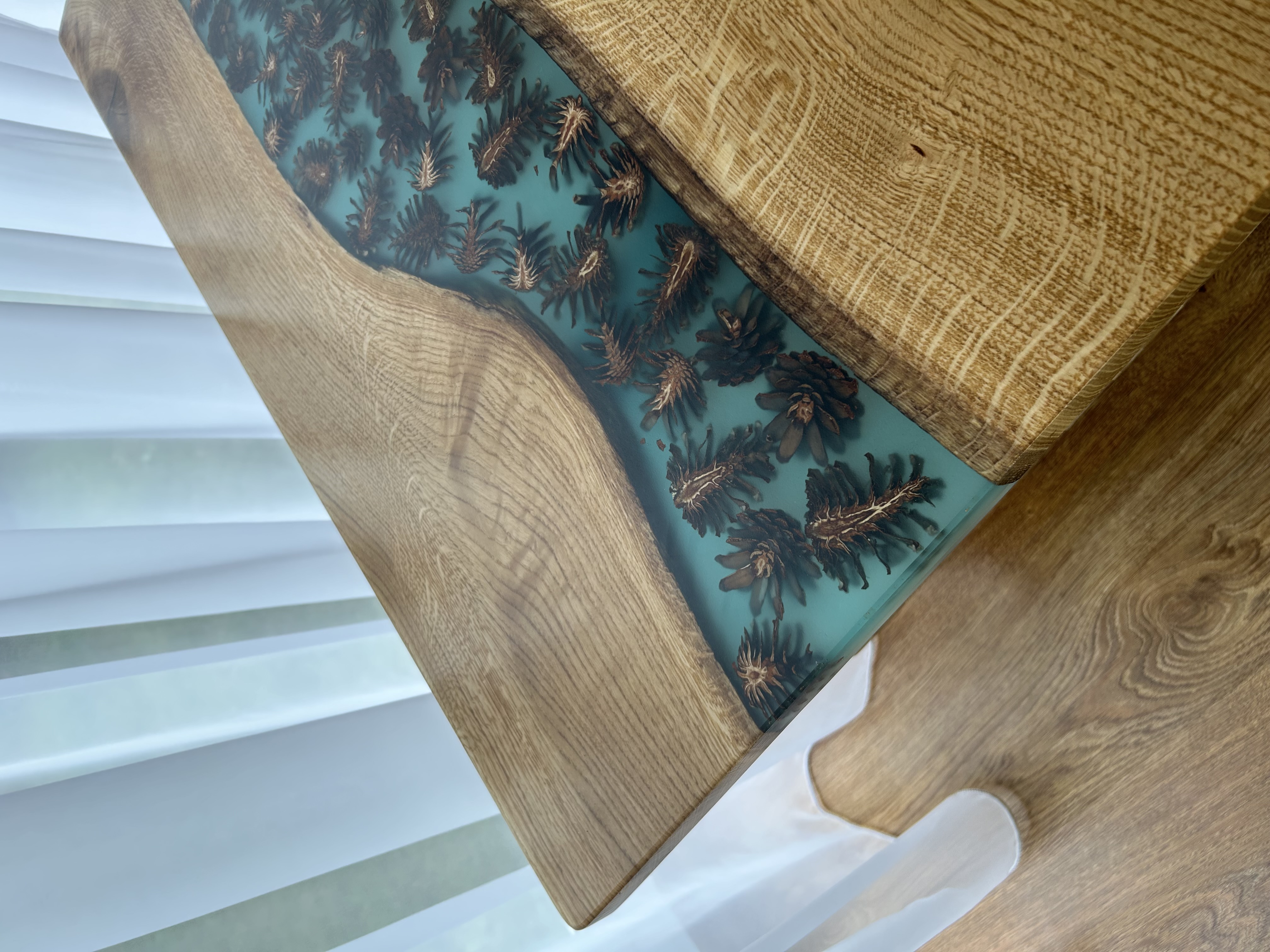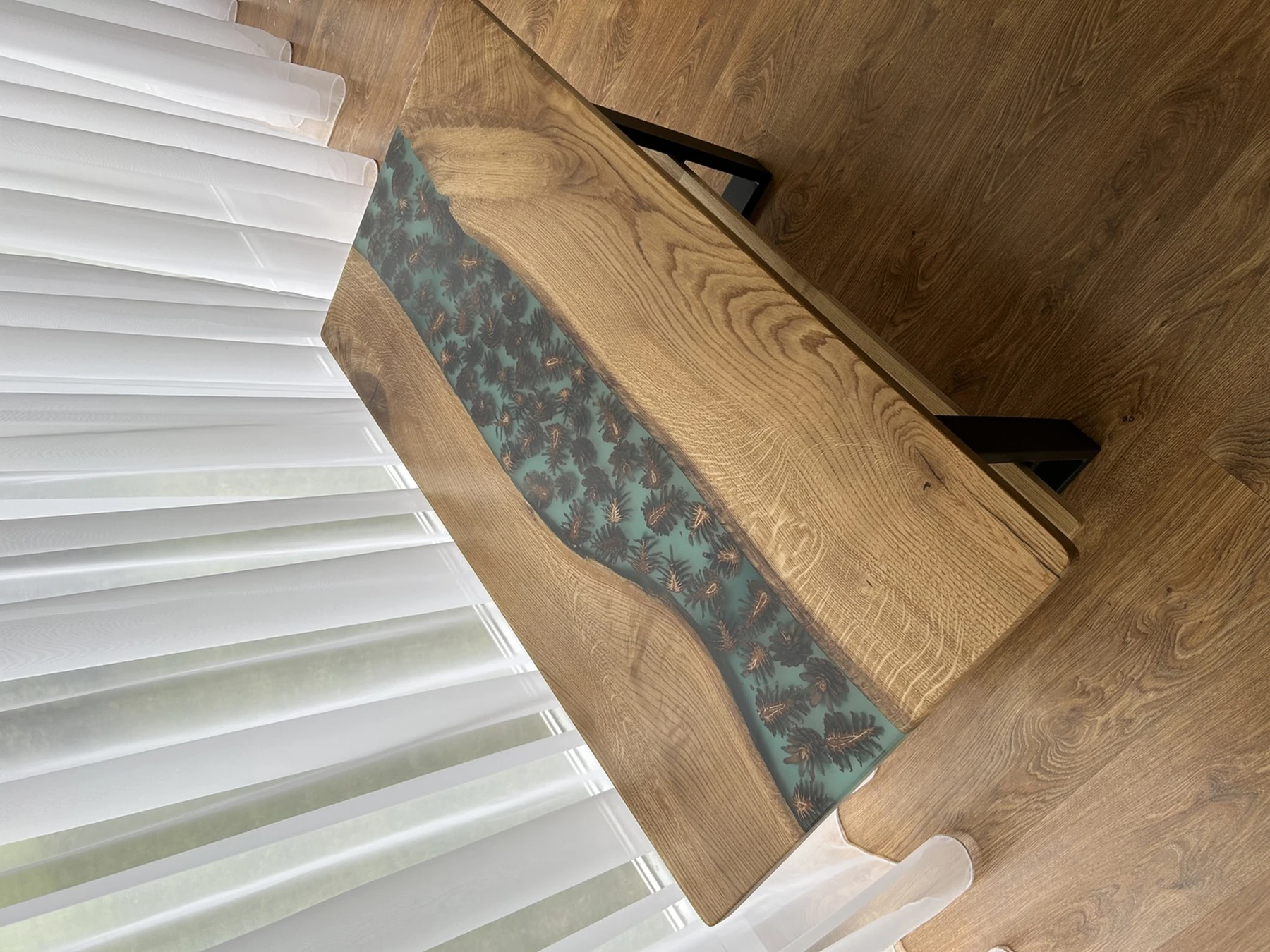 Jūros žavesį kviečiantis stalas su epoksidinės dervos įtaigumu, turintis turkio spalvos detalės, kankorėžiai ir fosforo milteliai suteikia jūsų namams unikalumo net tamsoje. Metalinės kojos užtikrina stabilumą ir eleganciją, o prie stalo pridėtas padekliukas su harmoningai derančiais medžiagų elementais sukuria subalansuotą dizainą.
