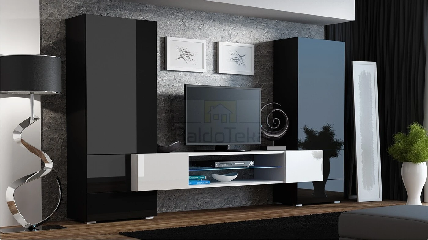 TV staliuko korpusas – baltas matinis; fasadai – balti blizgūs.