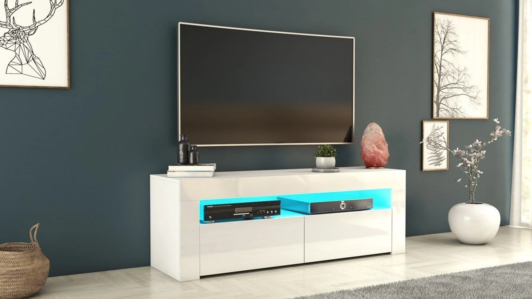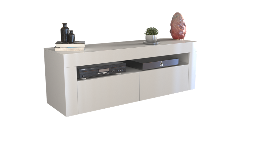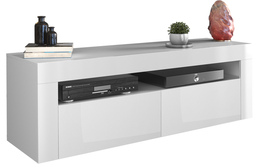 2 skyrių TV spintelė;Durelės atidaromos prisilietimui jautriu mechanizmu;Išmatavimai: ilgis – 140 cm , gylis – 40 cm, aukštis – 45 cm;Pagaminta iš: priekinė dalis - 17 mm medžio dulkių plokštės (MDF); korpusas - 16 mm laminuotos medžio drožlių plokštės (MDP)Korpuso spalva: matinė balta, priekinė dalis - blizgi balta;