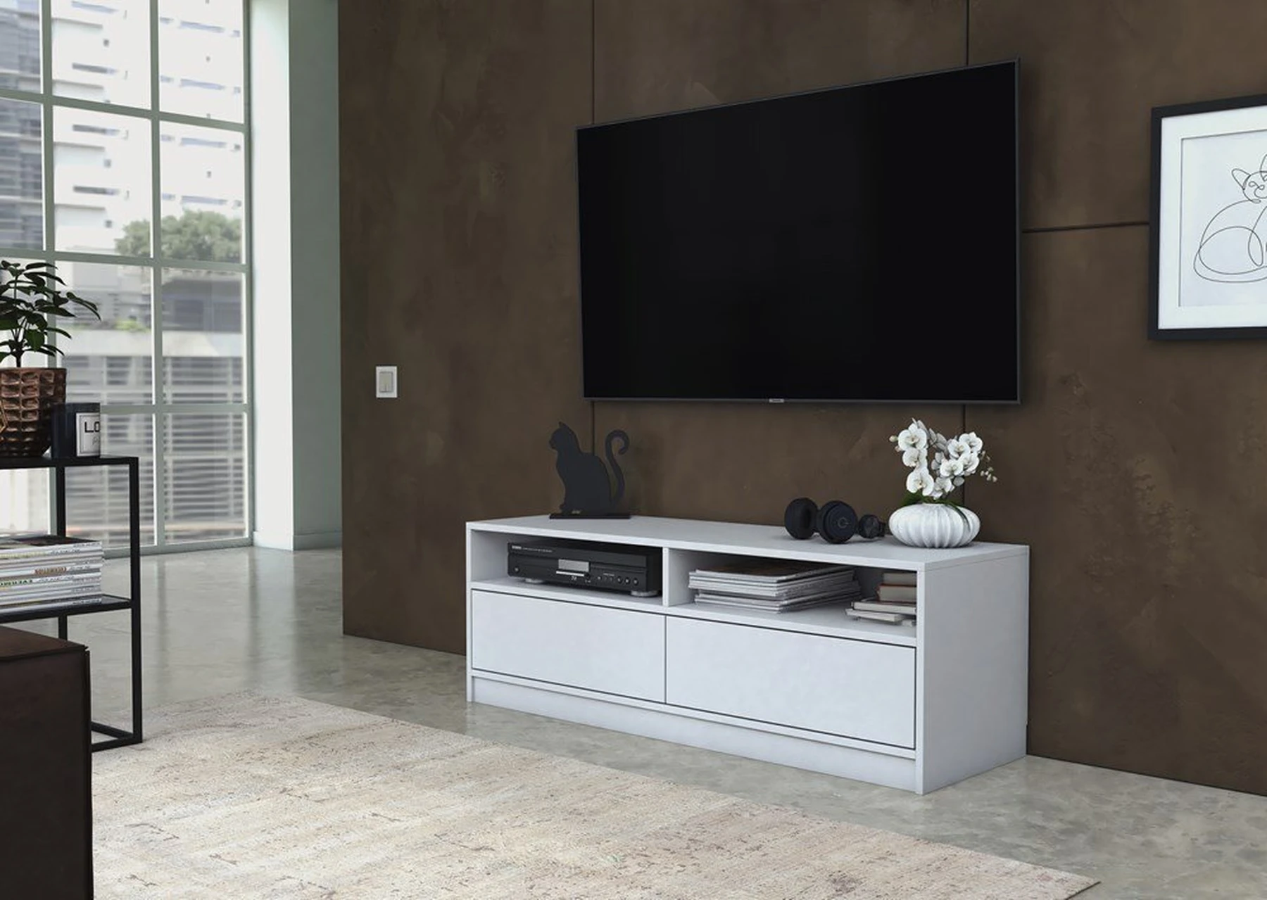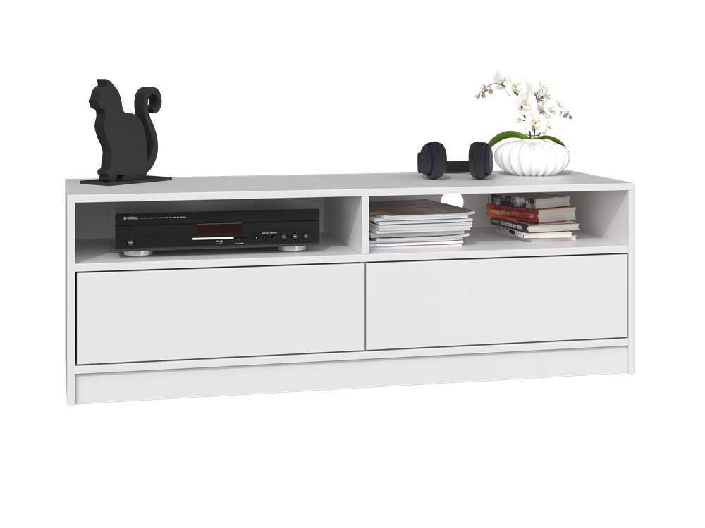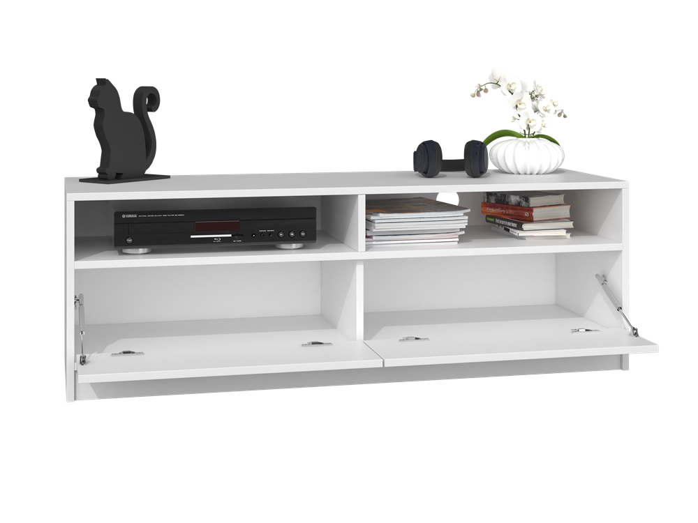 4 skyrių TV spintelė;2 atviri ir 2 uždari skyriai;Uždarų skyrių durelės atidaromos prisilietimui jautriu mechanizmu;Išmatavimai: plotis – 120 cm , gylis – 40 cm, aukštis – 45 cm;Pagaminta iš: 16 mm laminuotos medžio drožlių plokštės (MDP);Spintelės spalva: matinė balta;