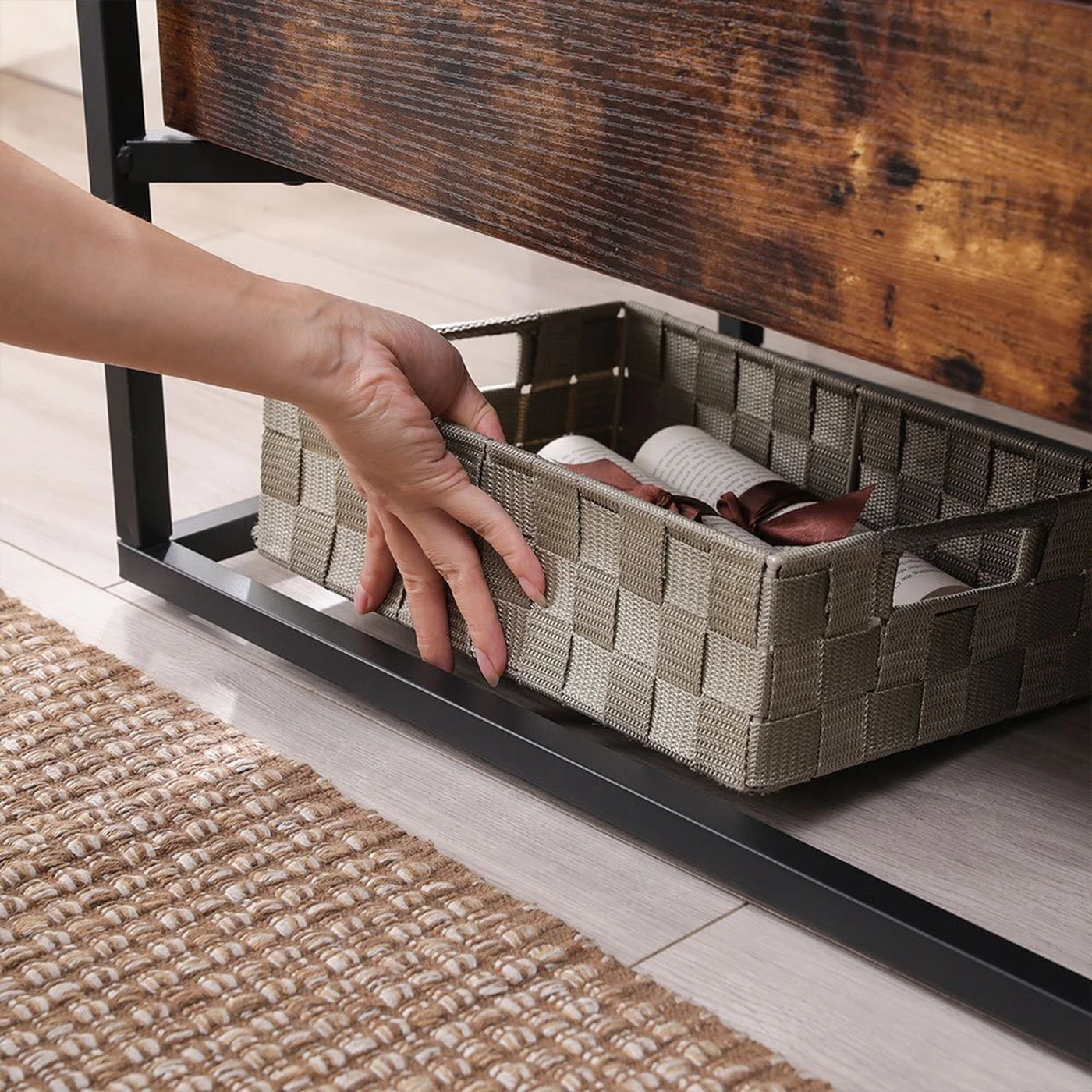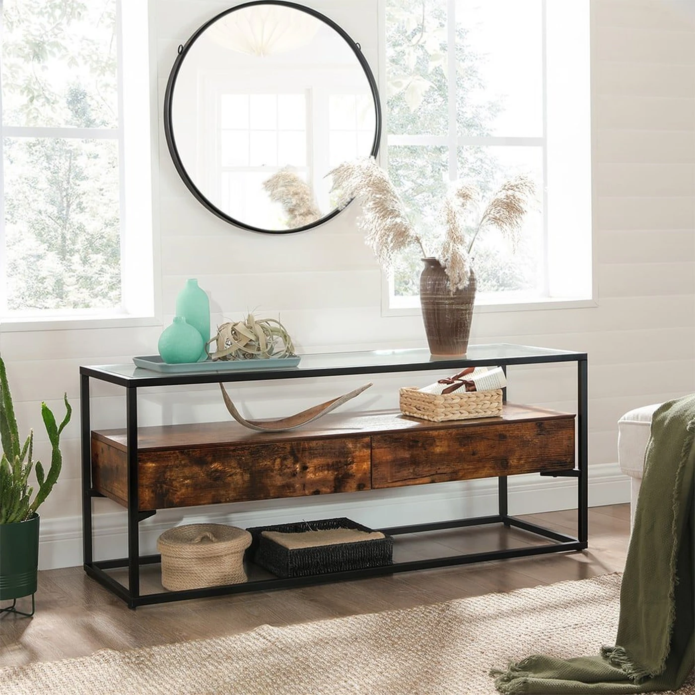 Aprašymas buvo automatiškai išverstas, gali pasitaikyti klaidų. Informacija apie gaminį: - Spalva: vintažinė ruda-juoda - Medžiaga: medžio drožlių plokštė, plienas, grūdintas stiklas - Dydis: 120 x 40 x 50 cm (P x P x A) - Svoris: 24,9 kg - Maksimali statinė stiklo viršaus apkrova: 30 kgPristatymo komplektas: - 1 x televizoriaus stovas su stikliniu paviršiumi - 1 x priedų paketas - 1 x instrukcija (DE, EN, FR, ES, IT) VASAGLE Pastabos: - Saugumo sumetimais vaikams draudžiama lipti ar žaisti su produktas.