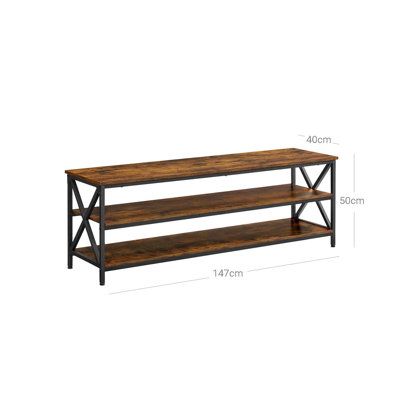 Aprašymas buvo automatiškai išverstas, gali pasitaikyti klaidų. Informacija apie gaminį: - Spalva: vintažinė ruda-juoda - Medžiaga: medžio drožlių plokštės, plieninis rėmas - Dydis: 147 x 40 x 50 cm (P x P x A) - Svoris: 22,7 kg - Maksimali statinė paviršiaus apkrova: 50 kg - Maksimali statinė apkrova vienai lentynai žemiau: 20 kgPristatymo komplektas:- 1 x TV lentyna- 1 x priedų pakuotė- 1 x instrukcijaVASAGLE Pastabos:- Saugumo sumetimais vaikams draudžiama lipti ant gaminio ar žaisti su juo.- Ant stalviršio dėkite daiktus tolygiai paskirstę. Didžiausia šio gaminio statinė apkrova yra 50 kg. Prašome neviršyti šio didžiausio svorio.