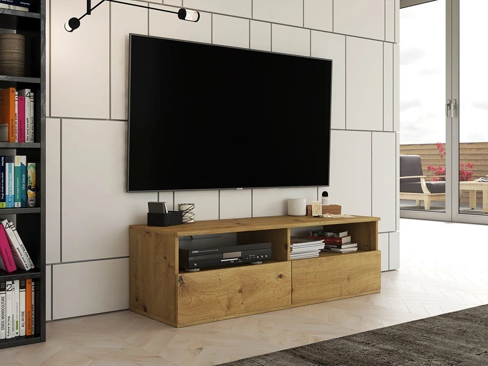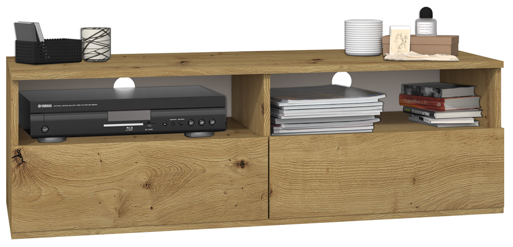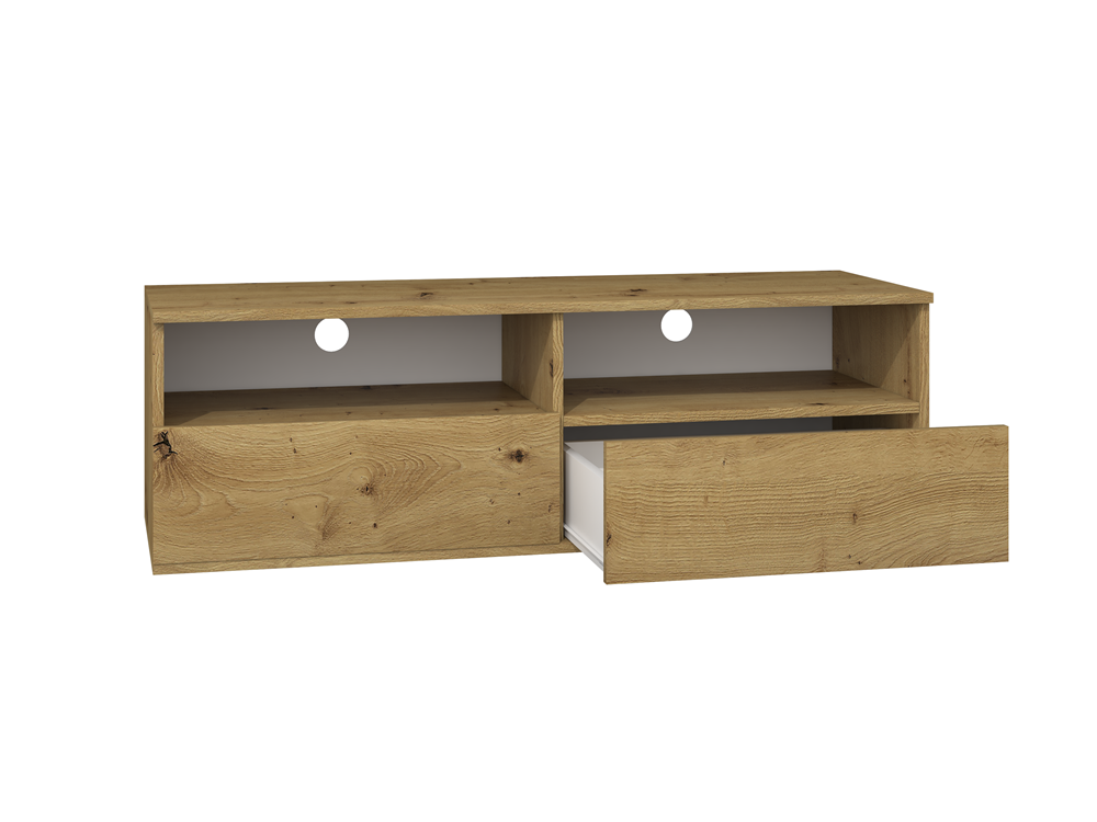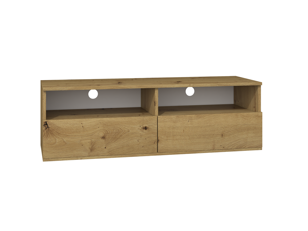 4 skyrių TV spintelė;2 atviri skyriai ir 2 stalčiai;Stalčių kreiptuvai - ritininiai;Atvirų skyrių galinėje sienelėje įmontuota ertmė laidams pervesti;Išmatavimai: plotis – 120 cm , gylis – 40 cm, aukštis – 38 cm;Pagaminta iš: 16 mm laminuotos medžio drožlių plokštės (MDP);Briaunos dailintos PVC danga, pasižyminčia dideliu mechaniniu ir cheminiu atsparumu;Spintelės spalva: ruda (artisan oak);