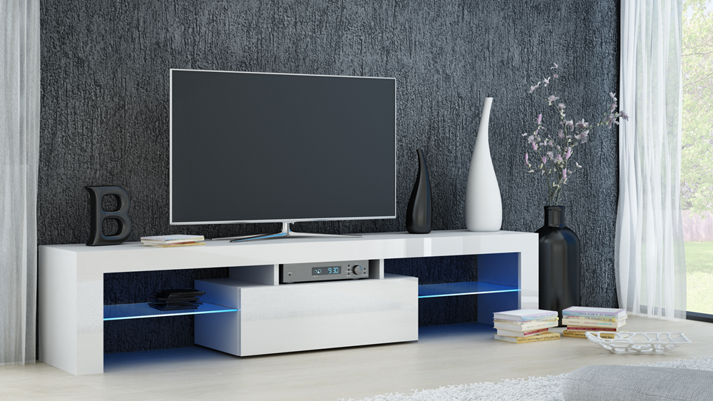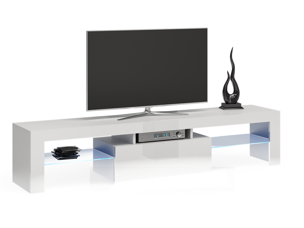 Modernus TV staliukas;Staliuke yra dvi stiklinės atviros lentynos šonose, viena per vidurį;Pagamintas iš laminuotos medžio dulkių plokštės (MDF) su PVC kraštų apdaila;Spalva - balta;Išmatavimai: ilgis - 160 cm, gylis - 40 cm, aukštis - 45 cm;Stiklinių lentynų išmatavimai: gylis - 38 cm, plotis - 43 cm;