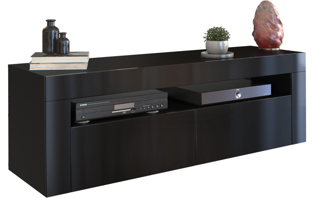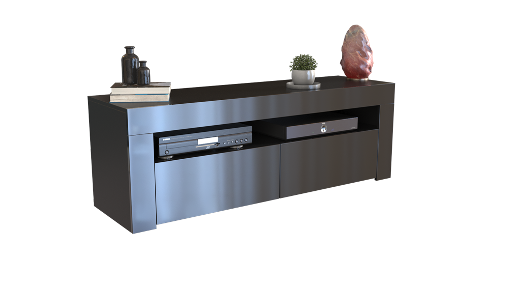 Modernus TV staliukas;Staliuke yra du erdvūs uždari skyriai ir viena talpi atvira lentyna;Pagamintas iš laminuotos medžio drožlių plokštė (MDP);Spalva - juoda;Korpusas - matinis, priekinė dalis - blizgi;Išmatavimai: ilgis - 140 cm, gylis - 40 cm, aukštis - 45 cm;