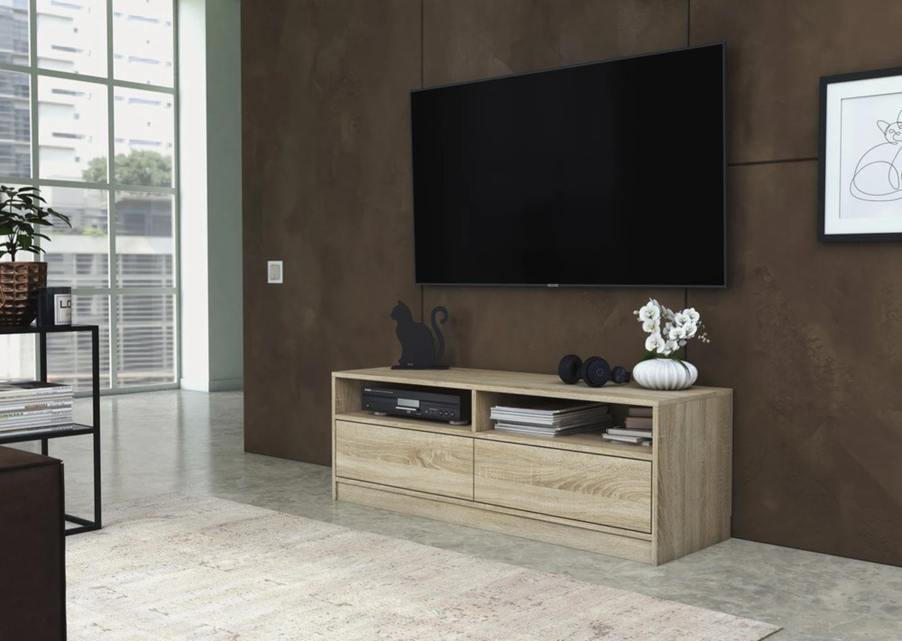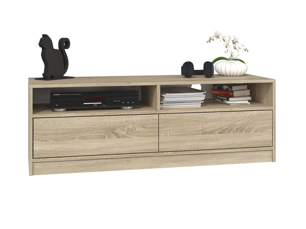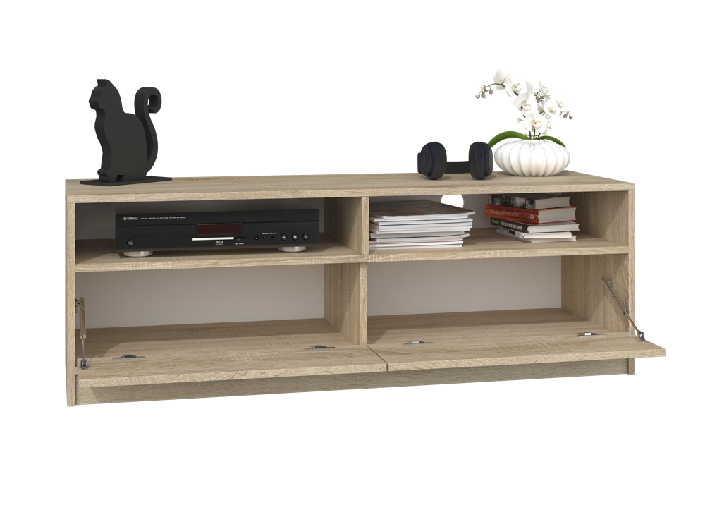 Modernus TV staliukas;Staliuke yra dvi atviros bei dvi erdvios uždaros lentynos;Uždaros lentynos yra be rankenų, su paspaudžiamu mechanizmu;Pagamintas iš laminuotos medžio drožlių plokštės (MDP);Spalva - ąžuolo spalvos;Korpusas bei priekinė dalis - matinė;Išmatavimai: ilgis - 120 cm, gylis - 40 cm, aukštis - 45 cm;
