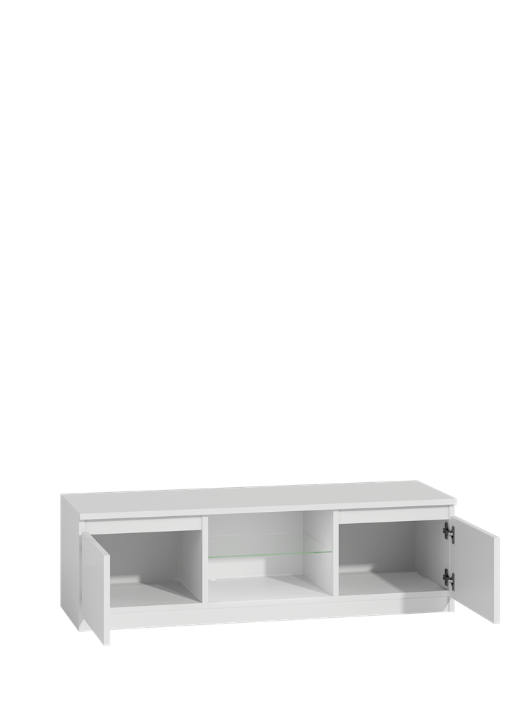 Modernus TV staliukas;Staliuke yra 2 uždari ir 2 atviri skyriai;Staliukas turi stiklinę lentyną;Pagamintas iš laminuotos medžio drožlių plokštės (MDP) su PVC kraštų apdaila;Spalva - balta;Korpusas blizgus;Išmatavimai: ilgis - 120 cm, gylis - 40 cm, aukštis - 36 cm;