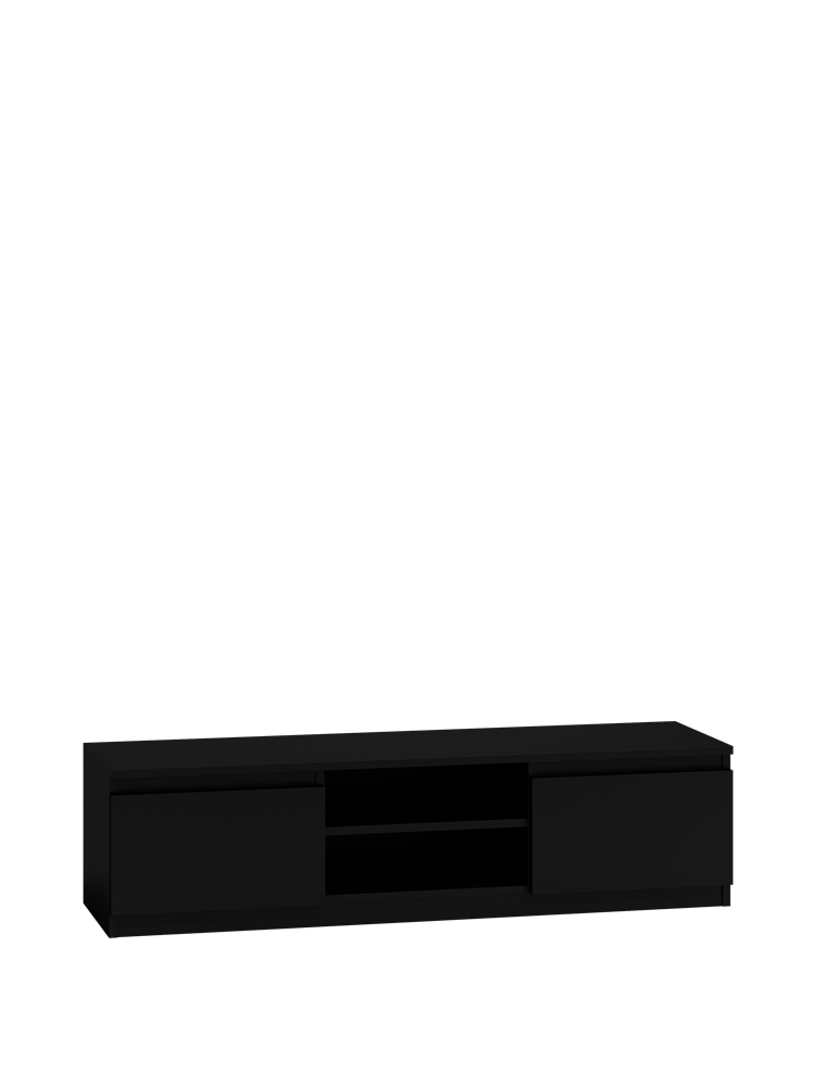 Modernus TV staliukas;Staliuke yra 2 durelės ir 2 atviri skyriai;Už uždarų durelių yra vienas skyrius (be lentynos);Pagamintas iš laminuotos medžio drožlių plokštės (MDP) su PVC kraštų apdaila;Spalva - juoda;Išmatavimai: ilgis - 140 cm, gylis - 40 cm, aukštis - 36 cm;
