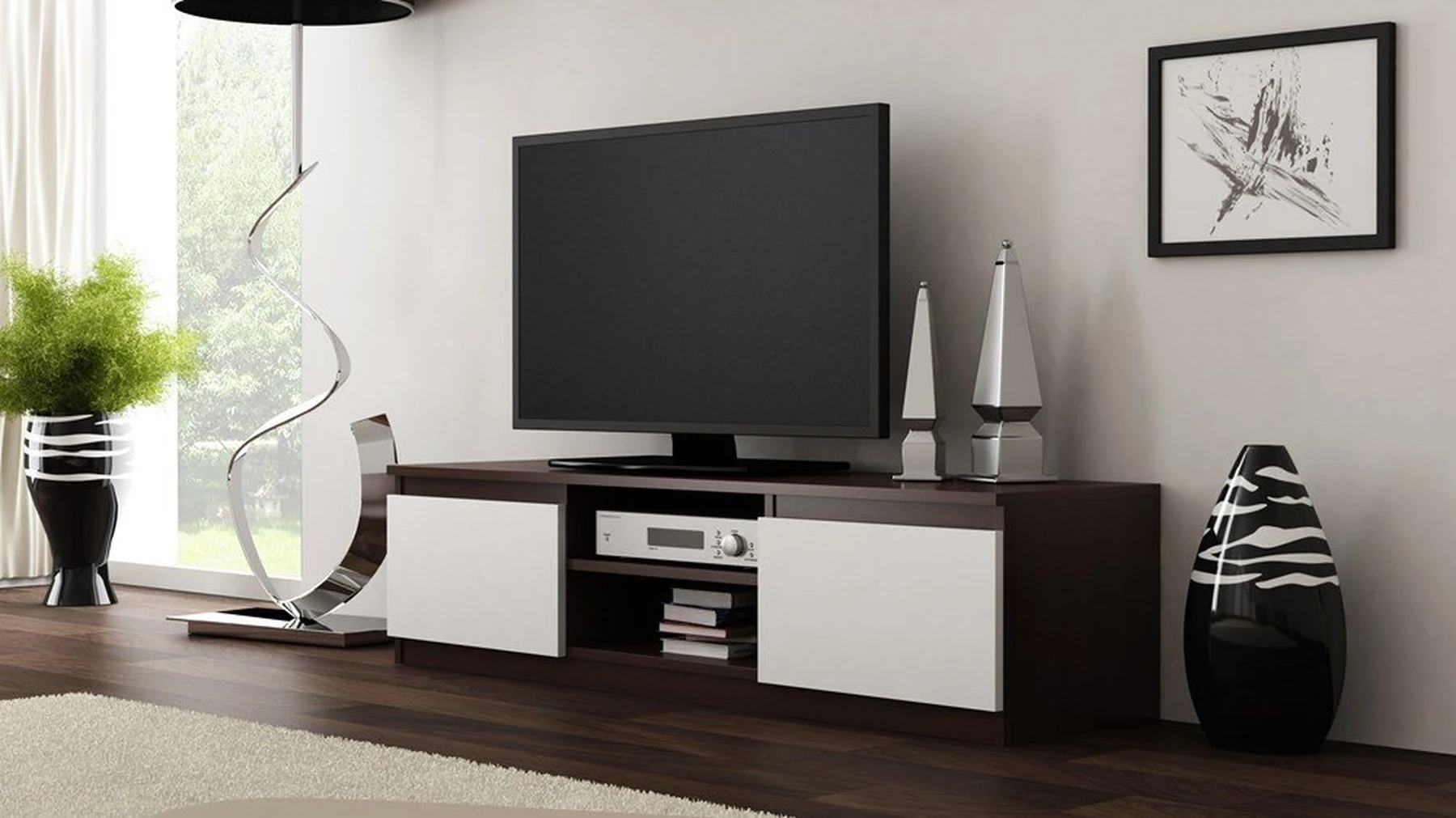 Modernus TV staliukas;Staliuke yra 2 durelės ir 2 atviri skyriai;už uždarų durelių yra vienas skyrius (be lentynos);Pagamintas iš laminuotos medžio drožlių plokštės (MDP) su PVC kraštų apdaila;Spalva: korpusas - tamsiai rudas, durelės - baltos;Išmatavimai: ilgis - 140 cm, gylis - 40 cm, aukštis - 36 cm;