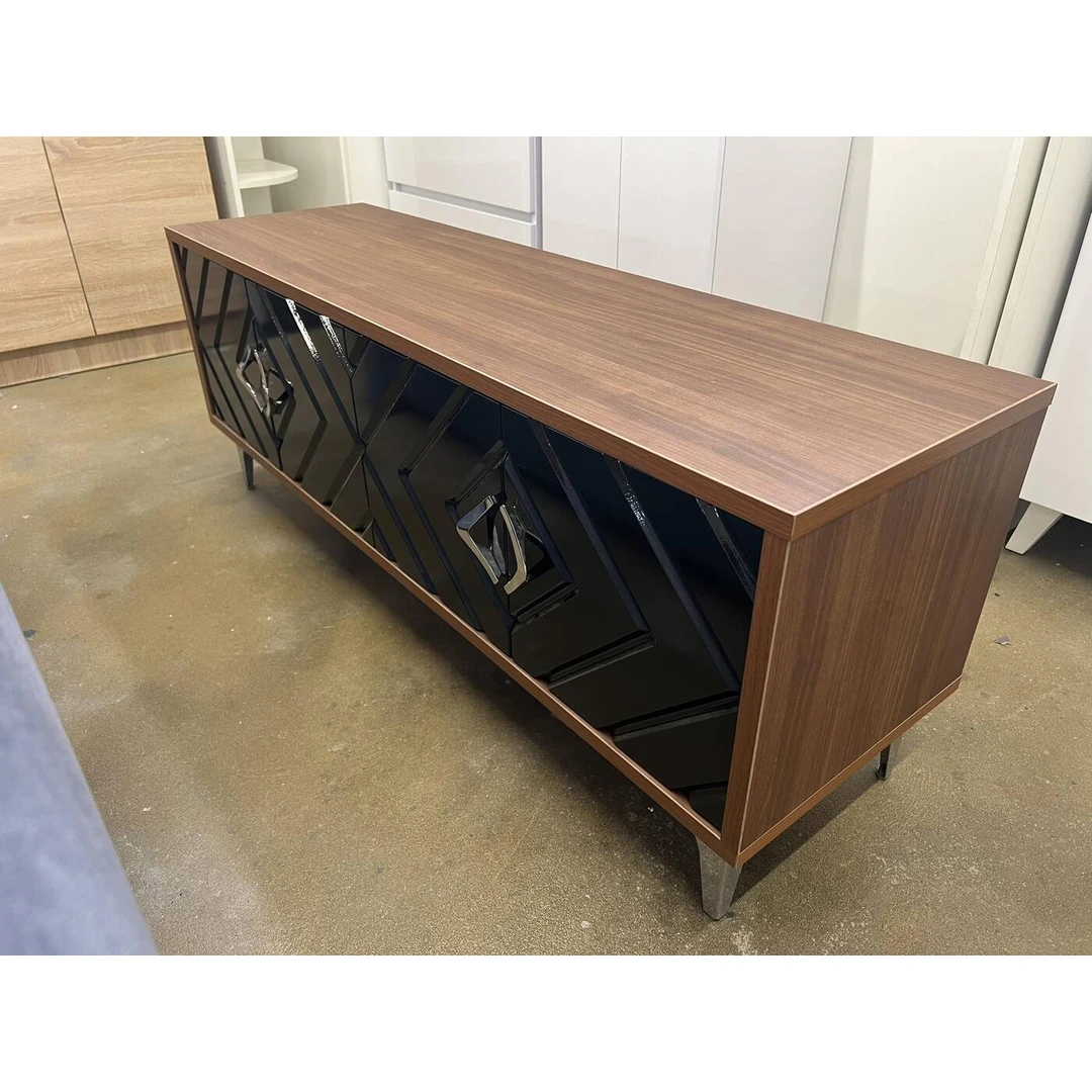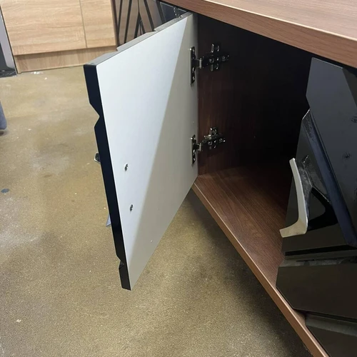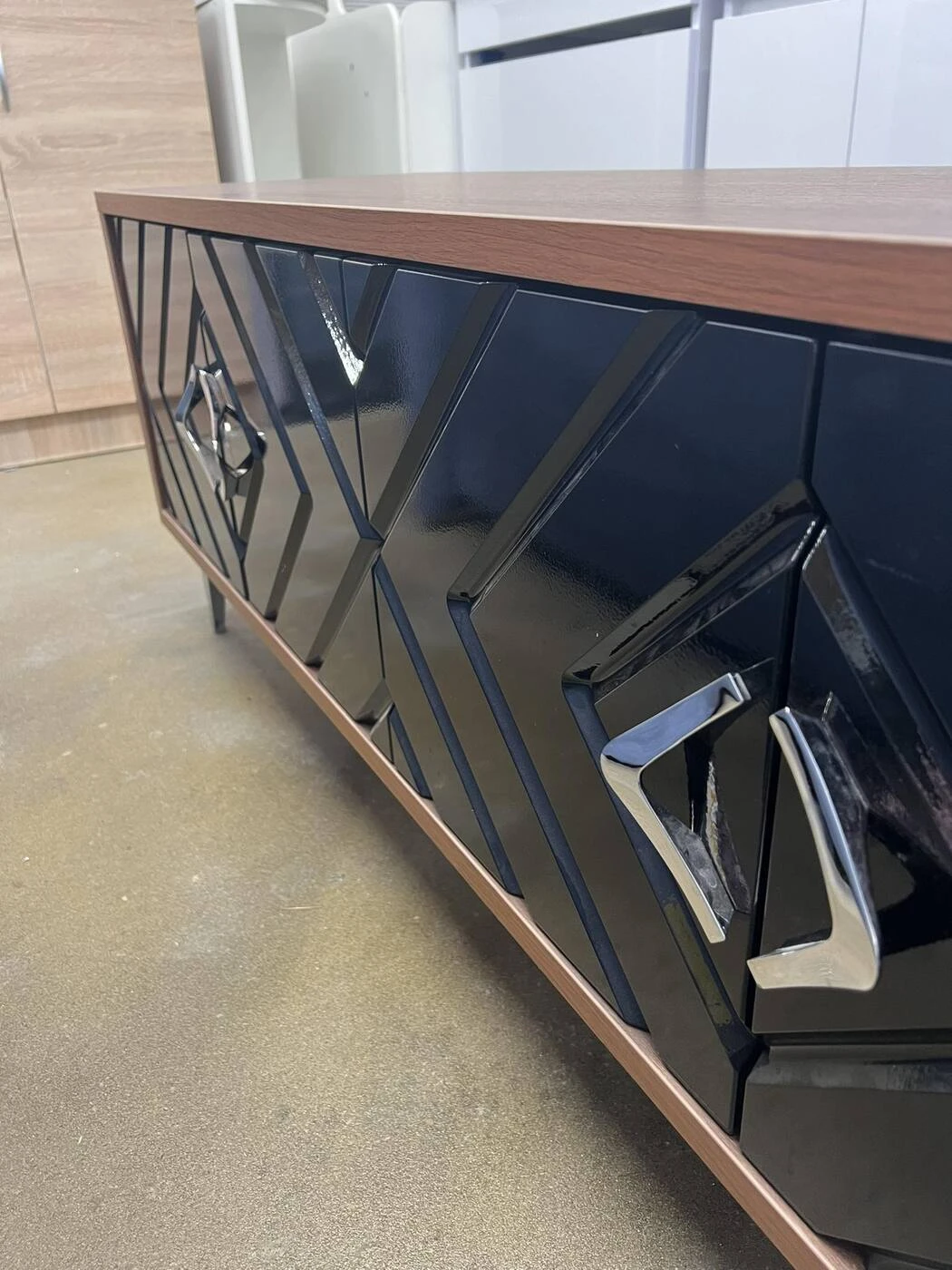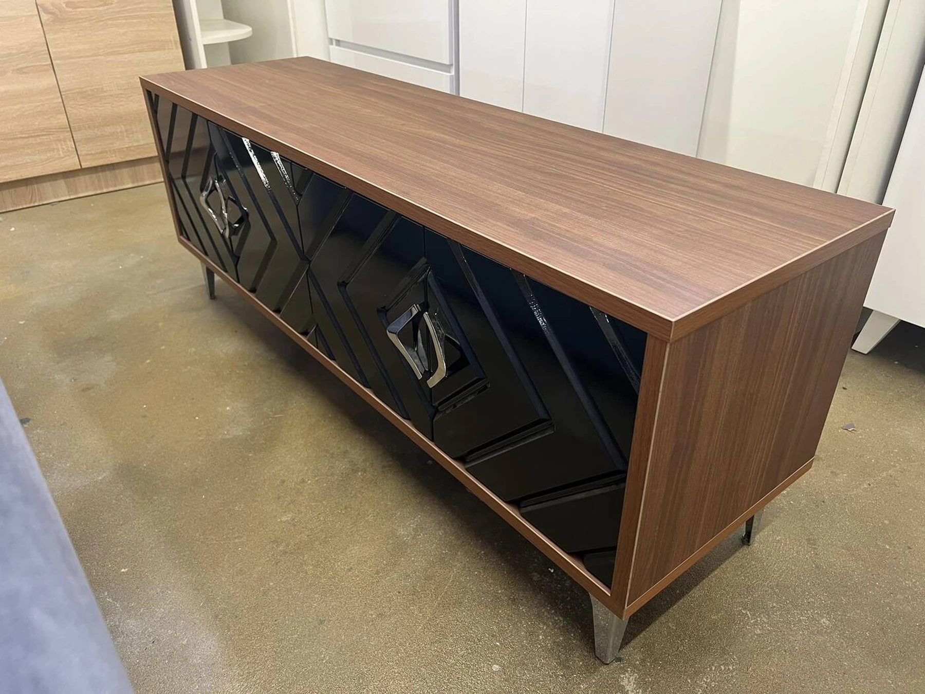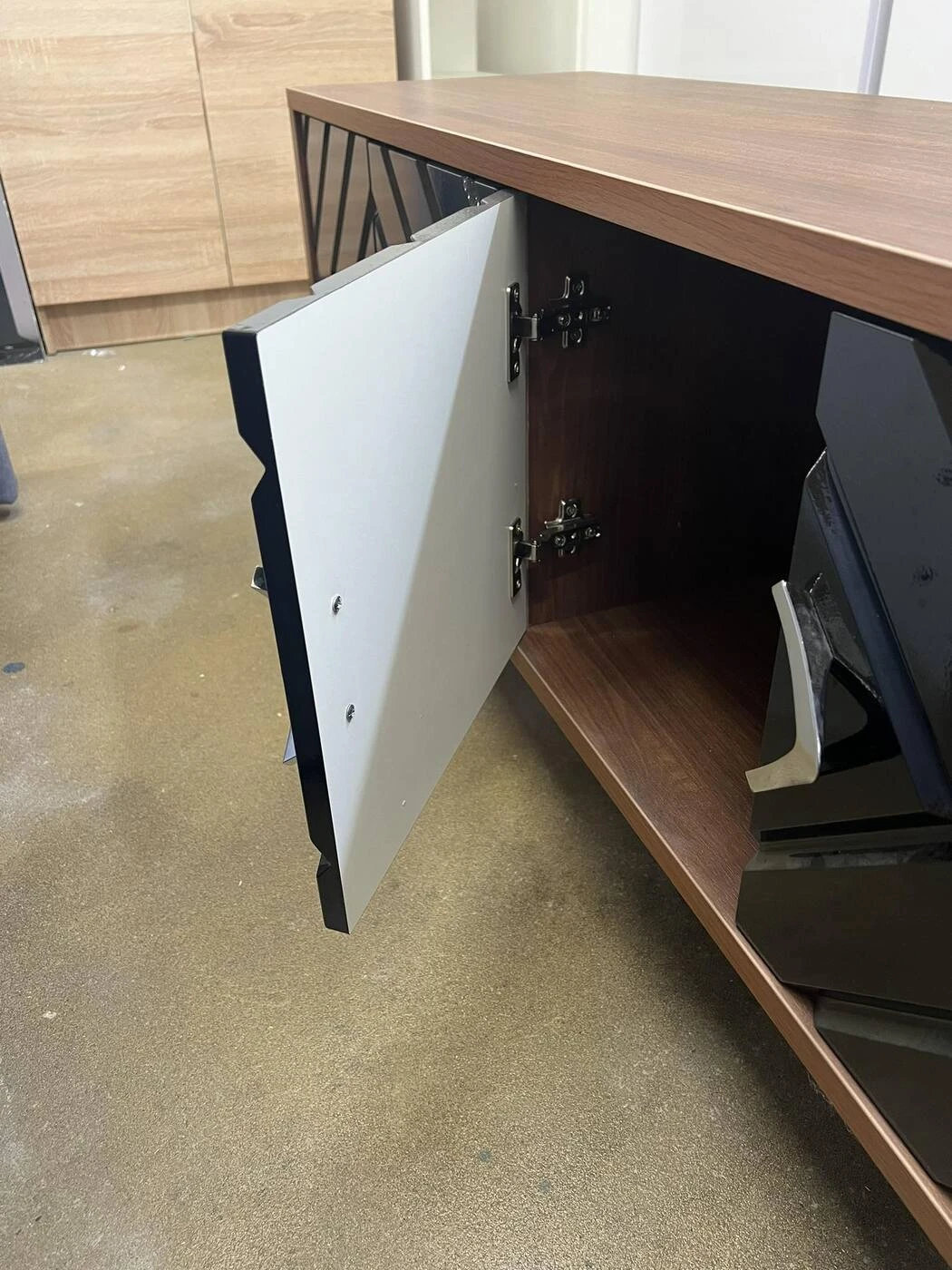 Parduodamas naujas TV staliukas su keturiomis durelėmis. Durelių fasadai juodo lako. Patogu susidėti aukštesnius daiktus.