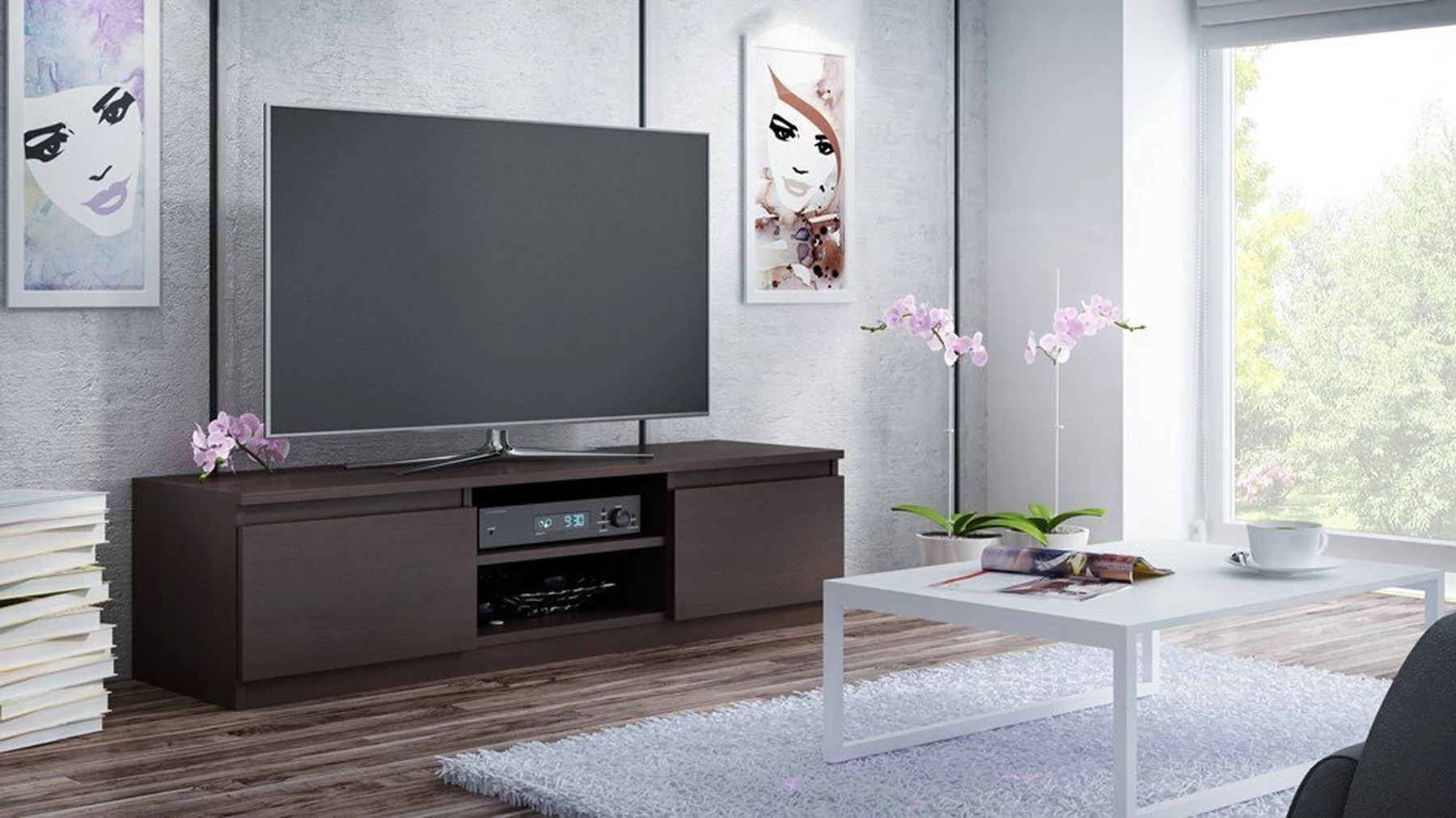 Modernus TV staliukas;Staliuke yra 2 uždari ir 2 atviri skyriai;Pagamintas iš laminuotos medžio drožlių plokštės (MDP) su PVC kraštų apdaila;Spalva - tamsiai ruda;Korpusas matinis;Išmatavimai: ilgis - 120 cm, gylis - 40 cm, aukštis - 36 cm;