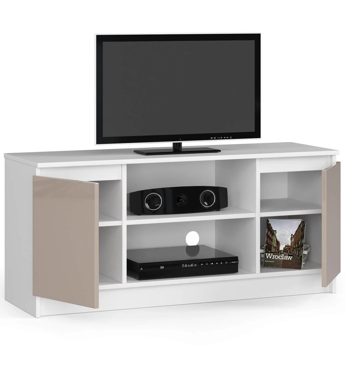 Aprašymas buvo automatiškai išverstas, gali pasitaikyti klaidų. 120 cm televizoriaus spintelė televizoriui, derinanti klasikinę baltą su kiek modernesniu kapučino spalvos atspalviu su blizgia apdaila, yra vienas iš CLP baldų sistemos elementų. Dėl didelio universalumo jis gali būti sėkmingai naudojamas kaip savarankiškas baldas arba gali būti derinamas su kitais gaminiais, kuriuos galima rasti minėtoje serijoje. Jis išsiskiria dideliu funkcionalumu, praktiškumu ir talpa, užtikrinančia naudojimo ergonomiką, tuo labiau, kad gaminys sukurtas taip, kad būtų vietos garso aparatūrai, priedėliui ar bet kokiai kitai elektronikai patalpinti. RTV spintelė 120 cm televizoriui , puikiai tiks ne tik svetainėje, bet ir daugelyje kitų patalpų, nes jos vieta ir naudojimas (plėtra) priklauso nuo mūsų individualių poreikių ir pageidavimų. Todėl gaminys yra idealus sprendimas ieškantiems praktiškų ir estetiškų interjero sprendimų. Be to, spintelė turi daug privalumų, dėl kurių, be kita ko, yra naudojant tokius sprendimus kaip: laminuota plokštė ir MDF plokštė, kuri užtikrina didelį atsparumą dilimui, ABS apvadai, kurie suteikia ne tik estetinę briaunų apdailą, bet ir aukštą apsaugą nuo pažeidimų, kiekvienose durelėse įdedama po vieną lentyną, o tai leidžia geriau organizuoti erdvę. Be to, aptariamo televizoriaus korpuso modelio atveju galime tikėtis 24 mėnesių garantijos, kuri tik patvirtina aukštą baldų kokybę. Be to, produktą galima įsigyti už labai patrauklią ir prieinamą kainą, kuri daugeliui žmonių gali nulemti jo pasirinkimą.