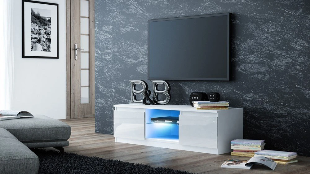 Modernus TV staliukas;Staliuke yra 2 uždari ir 2 atviri skyriai;Staliukas turi stiklinę lentyną;Pagamintas iš laminuotos medžio drožlių plokštės (MDP) su PVC kraštų apdaila;Spalva - balta;Išmatavimai: ilgis - 140 cm, gylis - 40 cm, aukštis - 36 cm;