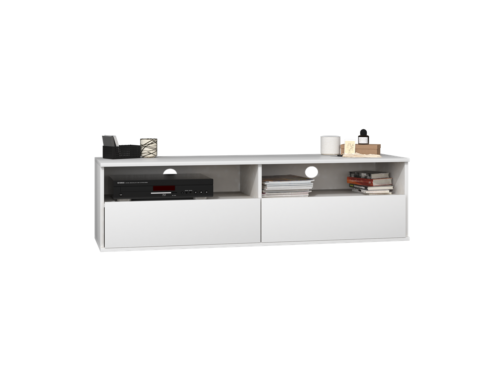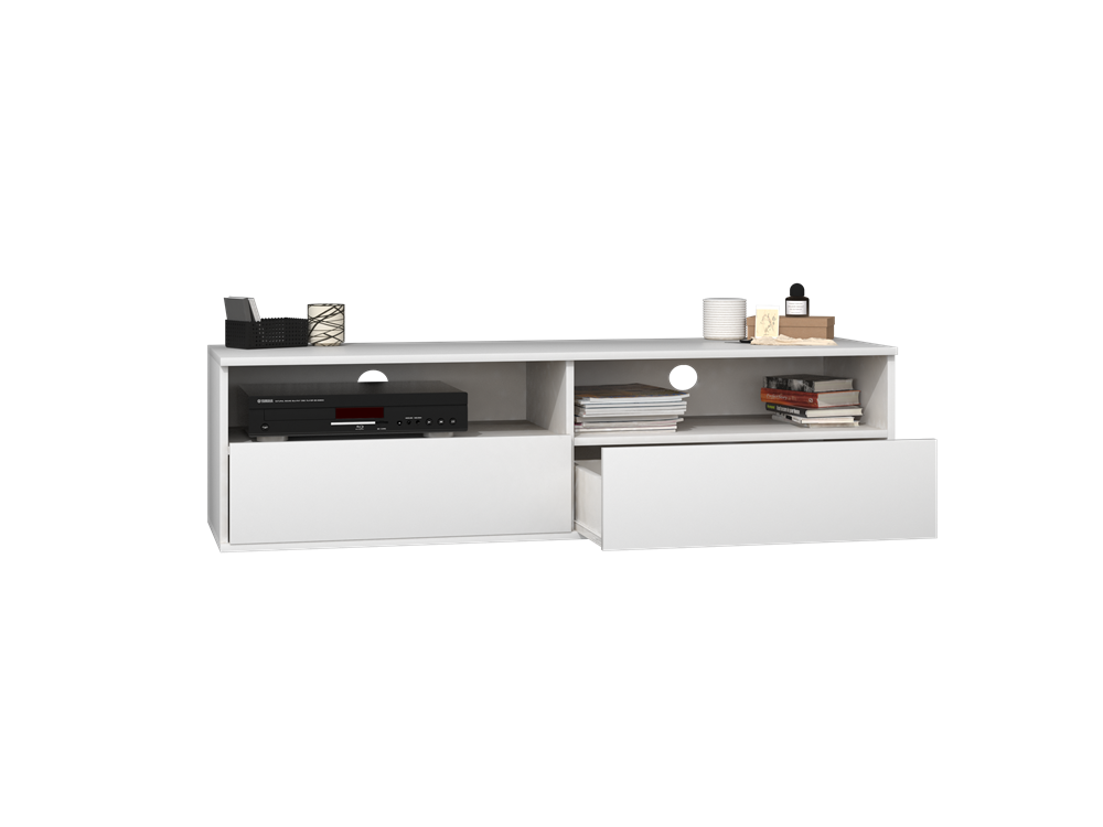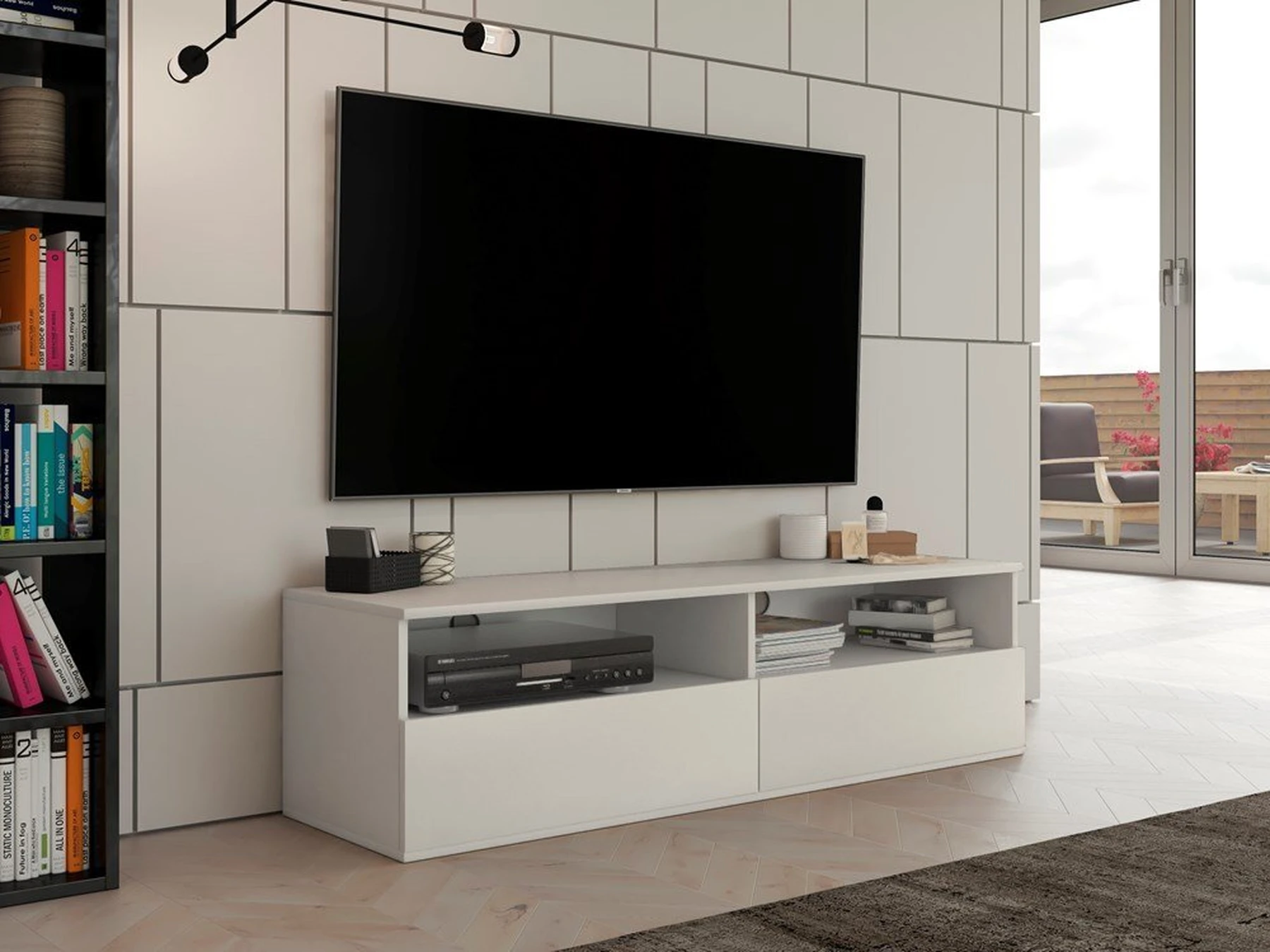 Modernus TV staliukas;Staliuke yra 2 stalčiai ir 2 atviri skyriai;Pagamintas iš laminuotos medžio drožlių plokštės (MDP) su PVC kraštų apdaila;Spalva - balta;Korpusas matinis;Išmatavimai: ilgis - 138 cm, gylis - 40 cm, aukštis - 38 cm;