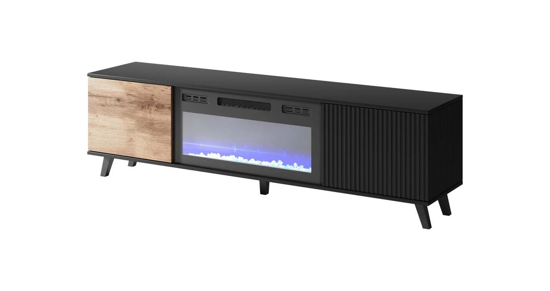 TV stovas su židiniu, matmenys: 180/40/52 cm, medžiaga: laminuota MDF / laminuota medžio drožlių plokštė / polipropilenas, spalva: ąžuolas / juoda