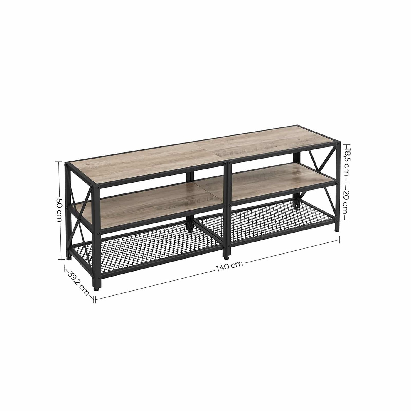 Aprašymas buvo automatiškai išverstas, gali pasitaikyti klaidų. Išsami informacija apie gaminį: - Spalva: pilkai juoda - Medžiaga: medžio drožlių plokštės, plienas - Dydis: 140 x 39,2 x 50 cm (P x P x A) - Svoris: 17,4 kg - Maksimali statinė apkrova vienai medžio drožlių plokštės lentynai: 60 kg - Maks. statinė metalinės grotelių lentynos apkrova: 10 kgPristatymo komplektas: - 1 x TV stovas - 1 x priedų paketas - 1 x vadovasVASAGLE Pastabos: - Saugumo sumetimais vaikams draudžiama lipti ant gaminio ar žaisti su juo.