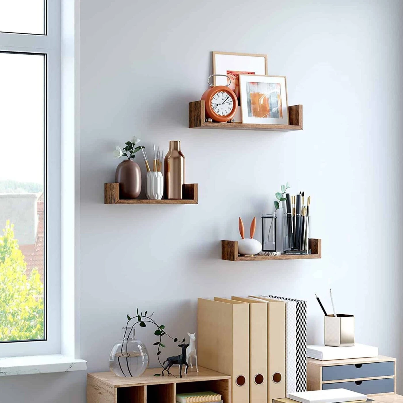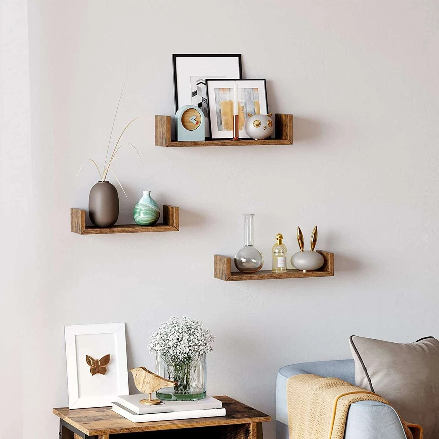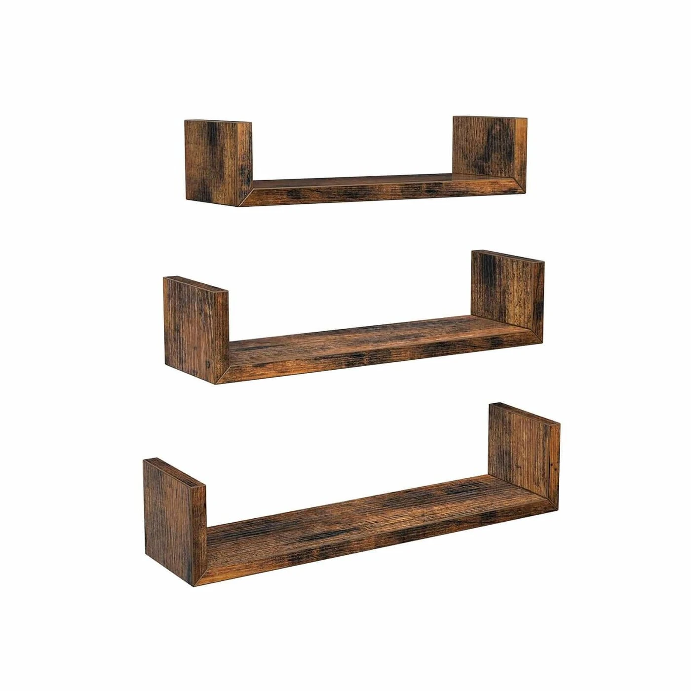 Aprašymas buvo automatiškai išverstas, gali pasitaikyti klaidų.Dėl unikalumo jūsų namuose Šios plaukiojančios lentynos atrodo unikaliai ir žaviai dėl savo U formos ir vintažinės medienos išvaizdos. Ar vis dar trūksta centrinio elemento savo kambaryje? Tada šie produktai yra būtent tai, ko ieškote! Šias lentynas galite kabinti viename kambaryje arba naudoti atskirai skirtingose patalpose – pasirinkimas yra jūsų!Skirtingi dydžiai skirtingiems daiktams Šį rinkinį sudaro 3 sieninės lentynos, kurių ilgis 30 cm, 35 cm ir 40 cm. Įsigykite šiuos gaminius ir suteikite savo paveikslų rėmams, dekoratyviniams daiktams, knygoms ir kt. stilingą vietą jiems laikyti. Į šias lentynas galima pakrauti iki 3 kg (mažų), 4 kg (vidutinių) ir 5 kg (didelių).Išsami informacija apie gaminį: - Spalva: vintažinė ruda - Medžiaga: medžio drožlių plokštė - Mažas lentynos dydis: 30 x 10 x 7 cm (I x P x A) - Vidutinis lentynos dydis: 35 x 10 x 8 cm (P x P x A) - Dydis didelės lentynos: 40 x 10 x 9 cm (P x P x A) - Bendras svoris: 1,7 kg - Maksimali statinė apkrova vienai sieninei lentynai: 3 kg, 4 kg, 5 kg (maža, vidutinė, didelė) pristatymas: - 3 x sieninės lentynos - 1 x priedų pakuotė - 1 x instrukcijos (DE, EN, FR, ES, IT) VASAGLE Pastabos: - Šias lentynas rekomenduojama montuoti ant tvirtos sienos - Nedėkite per sunkių daiktų šiose lentynose.
