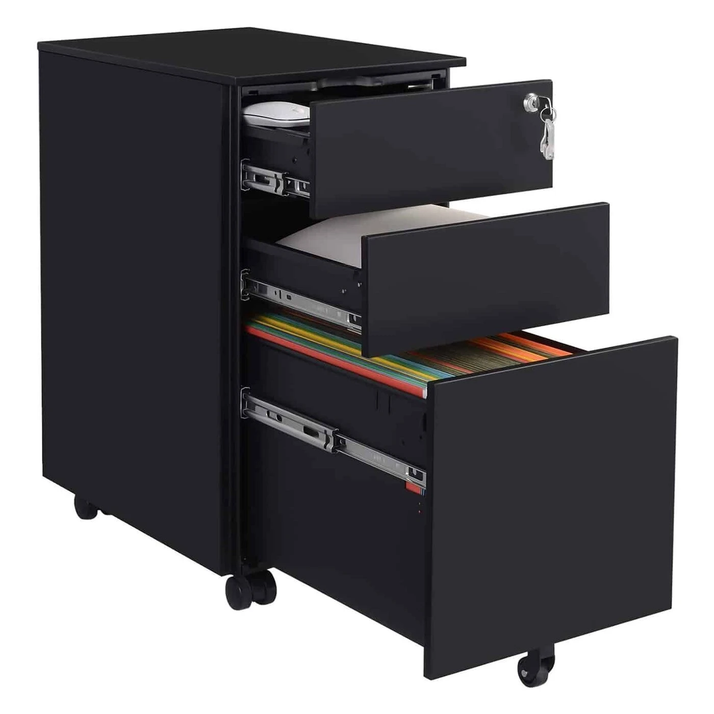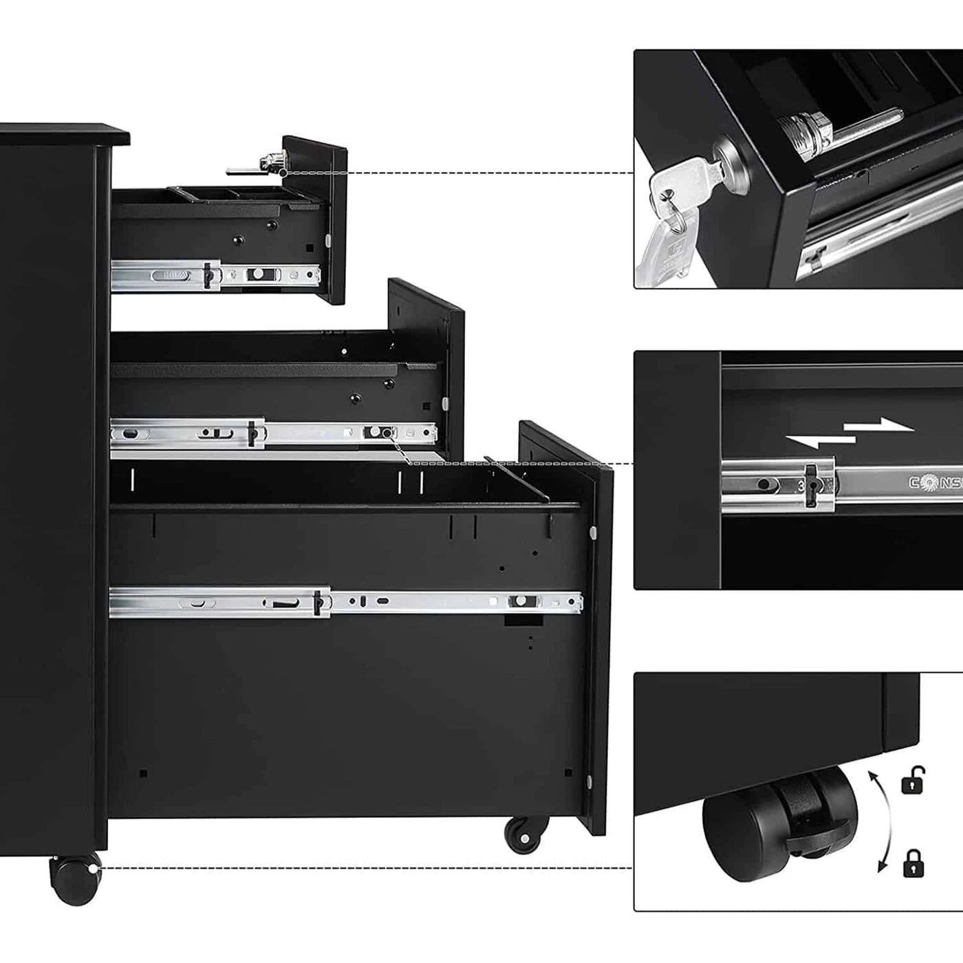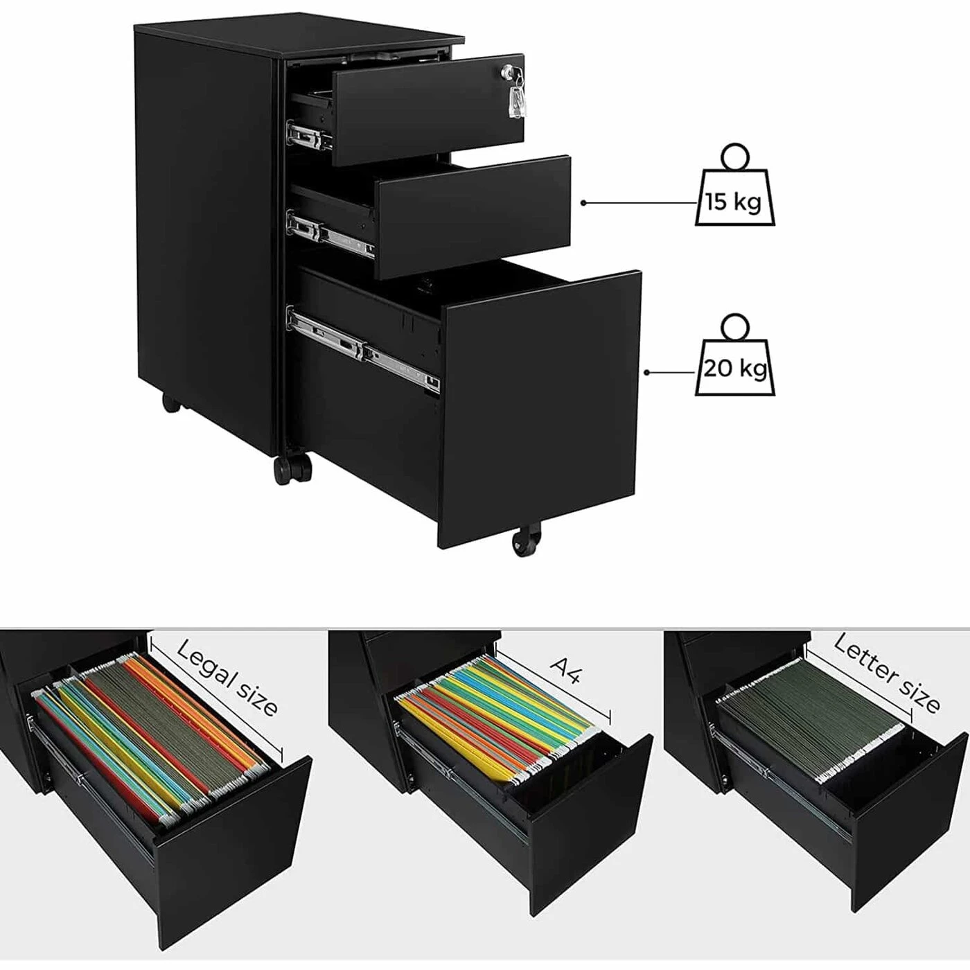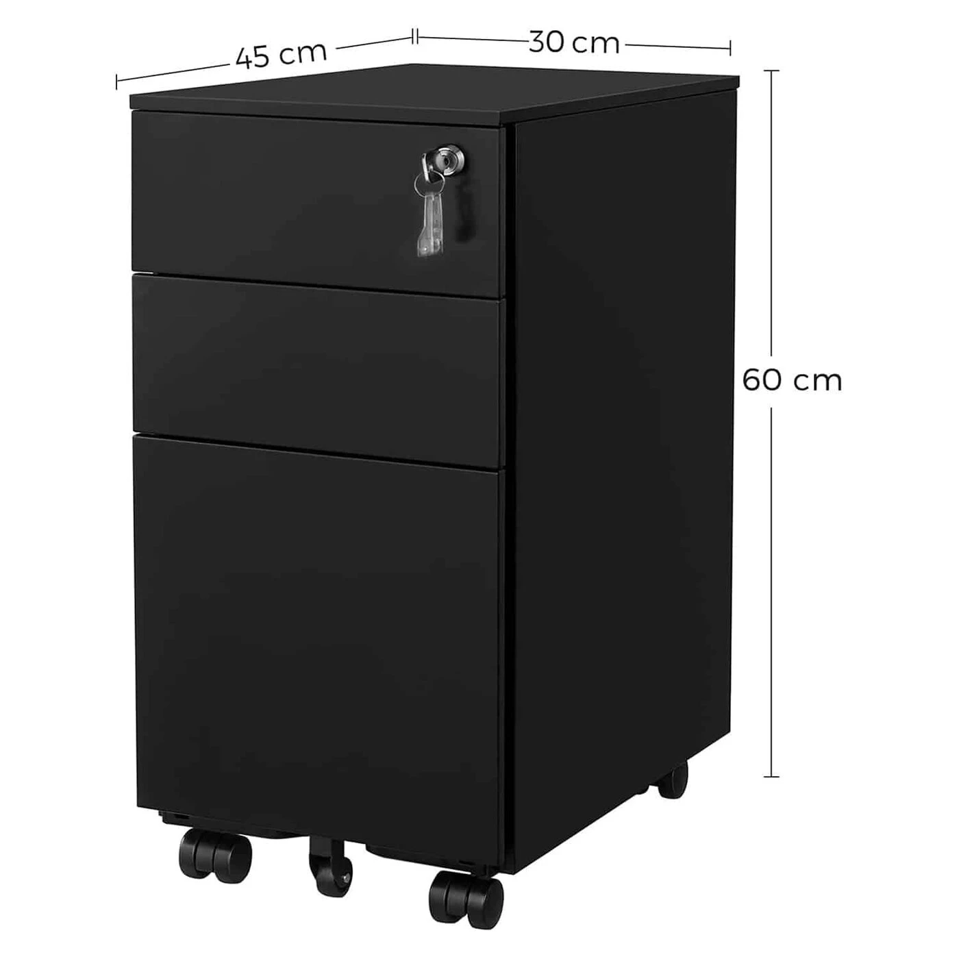Aprašymas buvo automatiškai išverstas, gali pasitaikyti klaidų.Visi svarbūs dokumentai saugiai vienoje vietoje: mobiliajame konteineryje rasite vietos įvairiems dokumentams ir biuro reikmenims. Viršutiniame stalčiuje yra papildomas laikiklis, kad rašikliai, užrašai ir kt. būtų lengvai pasiekiami. Iš 4 ratų, kurie gali suktis 360 laipsnių, 2 galima užfiksuoti, kad konteineris tvirtai ir saugiai laikytųsi vienoje vietoje Lankstus ir praktiškas: apatiniame stalčiuje galima pakabinti A4 formato pakabos failus. Didesniems ar mažesniems dokumentams, tokiems kaip legal, F4 ar raidžių dydis, kabantį failą galima reguliuoti naudojant reguliuojamus strypus. Be to, apatiniame stalčiuje yra sumontuotas ratukas apačioje, kuris suteikia daugiau stabilumo ir saugumo, kai stalčius visiškai ištraukiamas.Galima rakinti ir puikiai telpa po rašomuoju stalu: spyna (pridedama 2 rakteliai) užrakina visus 3 stalčius tuo pačiu metu, kad visi jūsų dokumentai būtų saugiai laikomi spintelės konteineryje. 60 cm aukščio mobilus konteineris taip pat telpa po visais standartinio dydžio stalais ir sutaupo dar daugiau vietos.Informacija apie gaminį: Spalva: Juoda Medžiaga: Plienas Dydis: 30 x 45 x 60 cm (P x P x A) Svoris: 14,5 kg Maks. Statinė 2 viršutinių stalčių apkrova: kiekvieno maks. 15 kg. Apatinio stalčiaus statinė apkrova: 20 kg Pakuotės turinys: 1 x Ritantis konteineris 1 x Priedų krepšys 1 x Instrukcijos SONGMICS Pastabos: Neviršykite šio didžiausio vieno stalčiaus svorio. Vaikams neleidžiama lipti ar žaisti su gaminiu, kad išvengtų sužalojimų dėl apvirtimo.