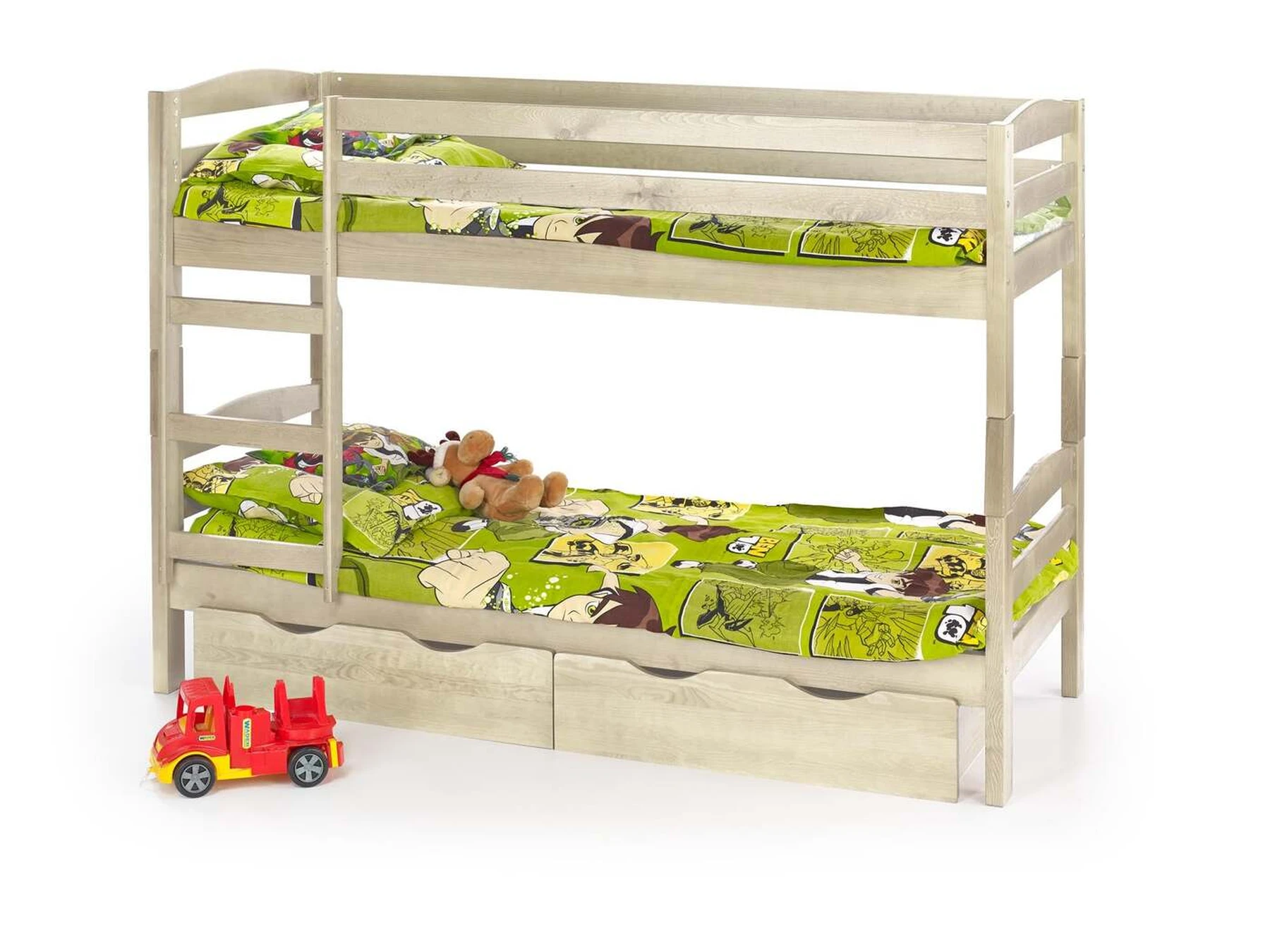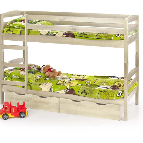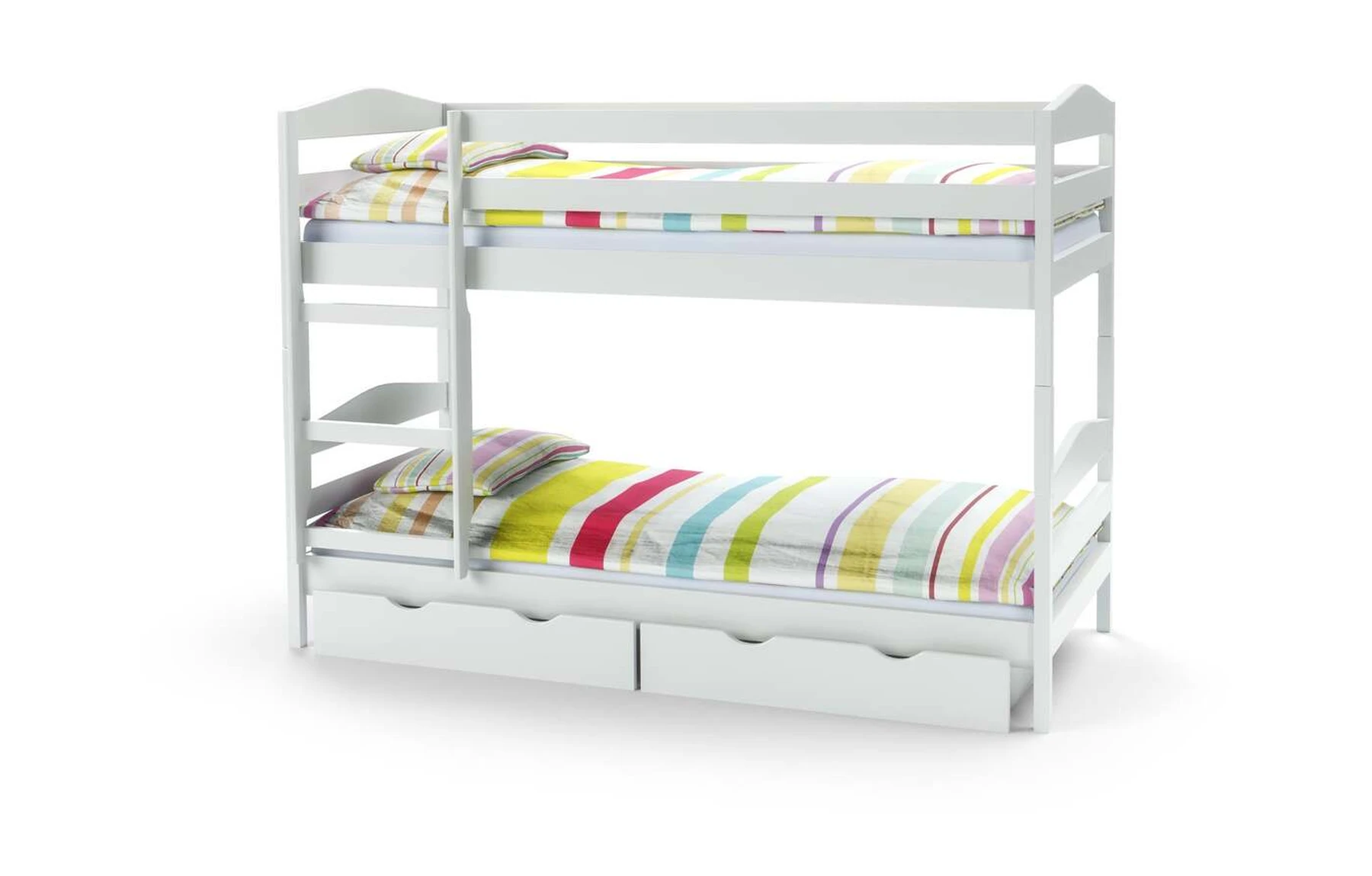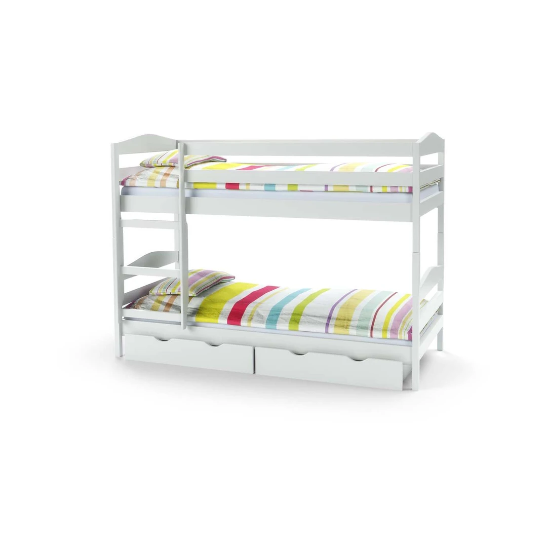dviaukštė lova, išmatavimai: 198/86/142 cm, medžiaga: lakuota pušis, spalva: balta, lova su čiužiniais, su stalčiais pasirenkama