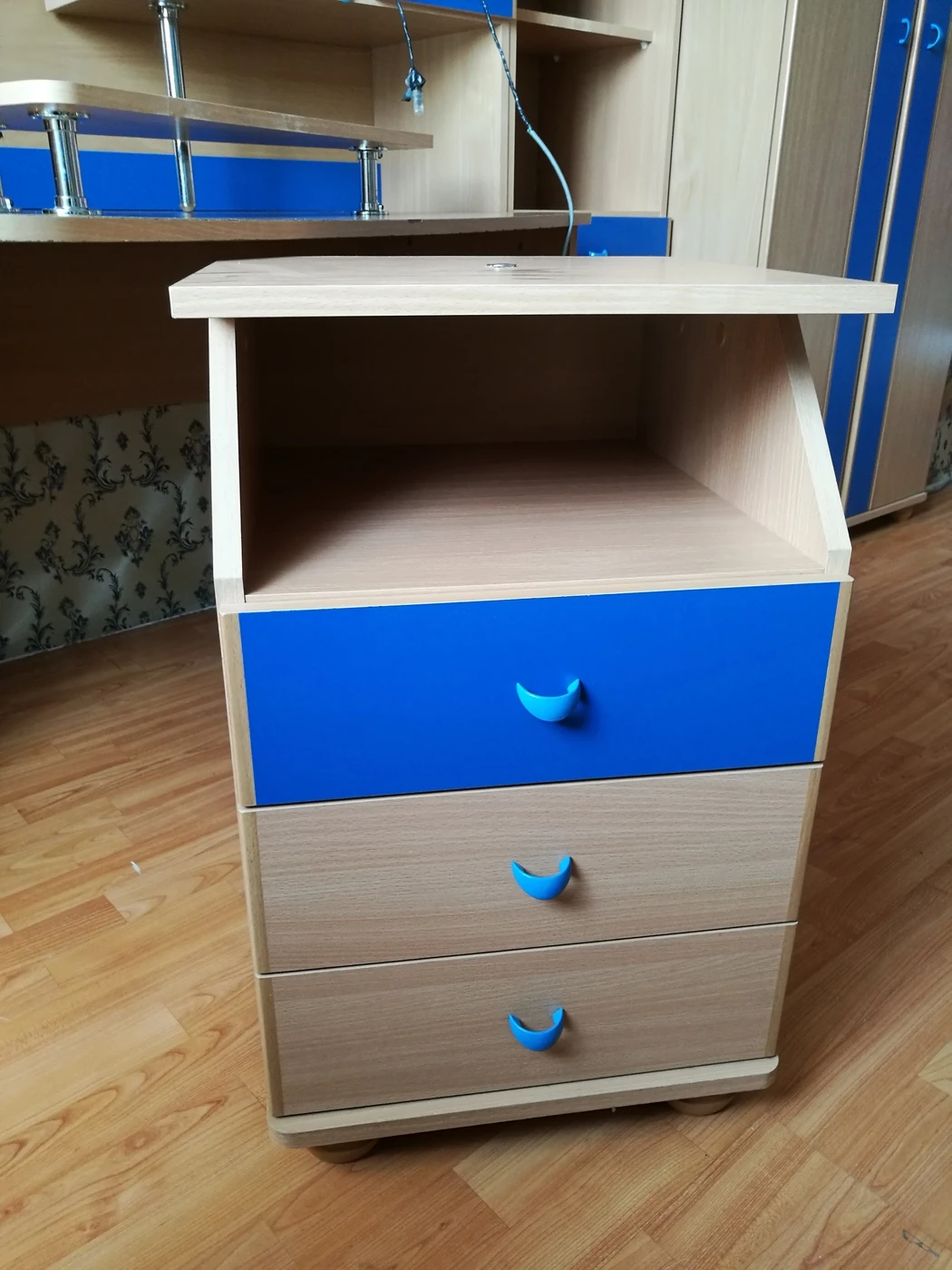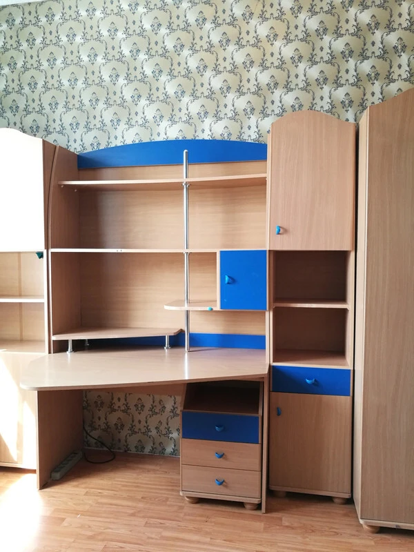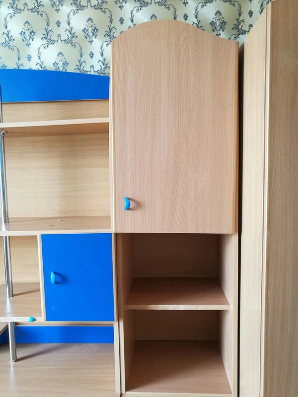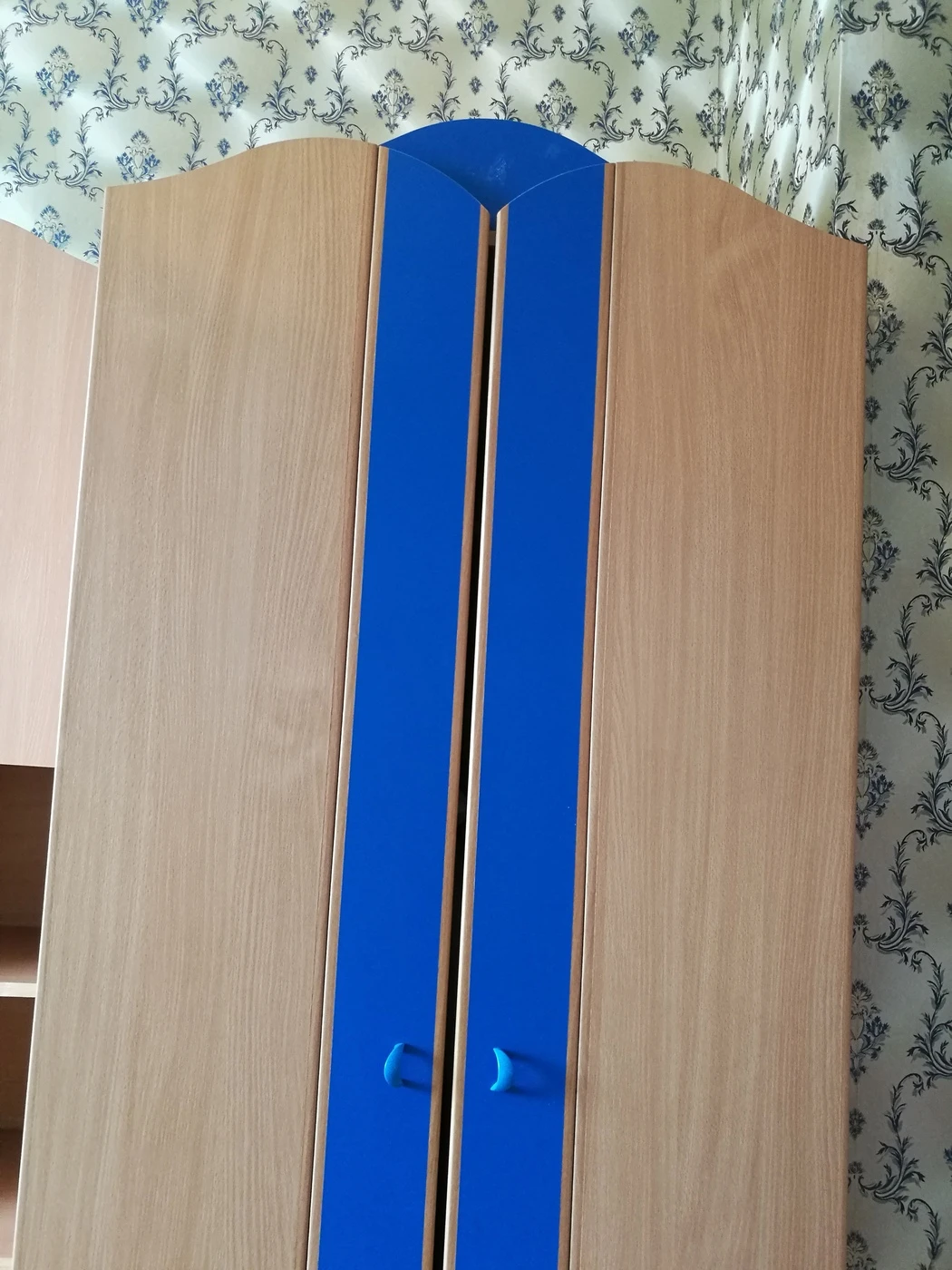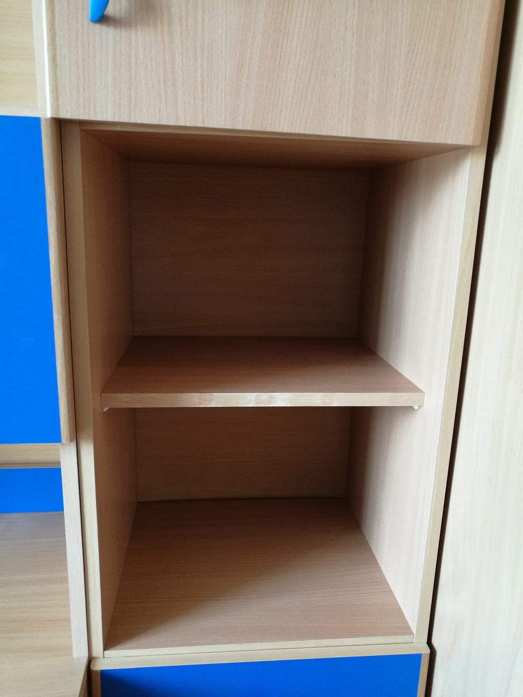 Tikrai dar puikios būkles vaikiškų baldų komplektas. Yra naudojimo žymių, tačiau bendrai atrodo puikiai ir niekas tolimesniam naudojimui netrukdo. Parduodam tik viską kartu arba dalimis, bet už tą pačią kaina. Jeigu kils klausimų - skambinkite, mielai atsakysiu. Defektai matosi nuotraukoje. Bet galima lengvai nuvalyti iki galo ir užklijoti nauja juostele toje vietoje. Didžiausioje spintoje yra viršuje viena lentyna i kabykla kabinti rūbus.