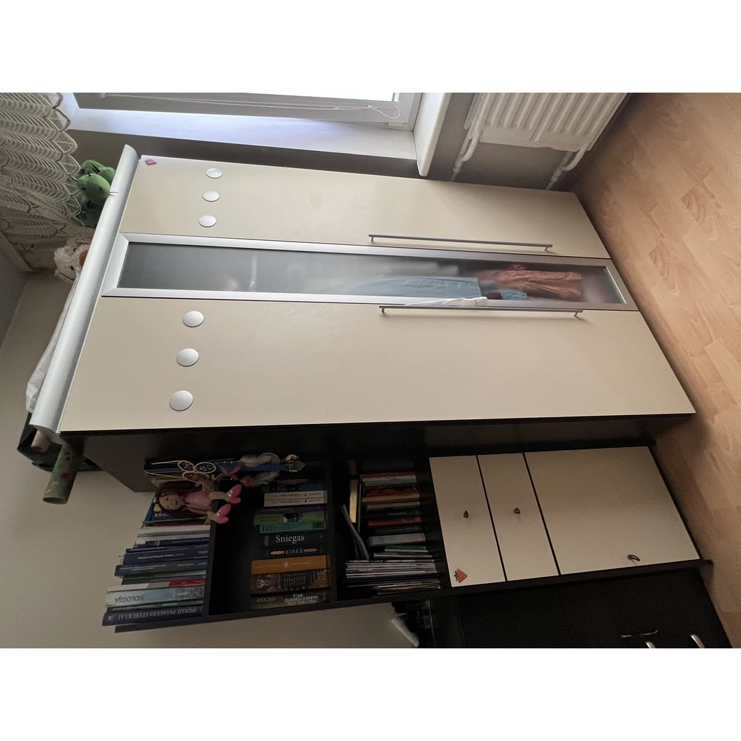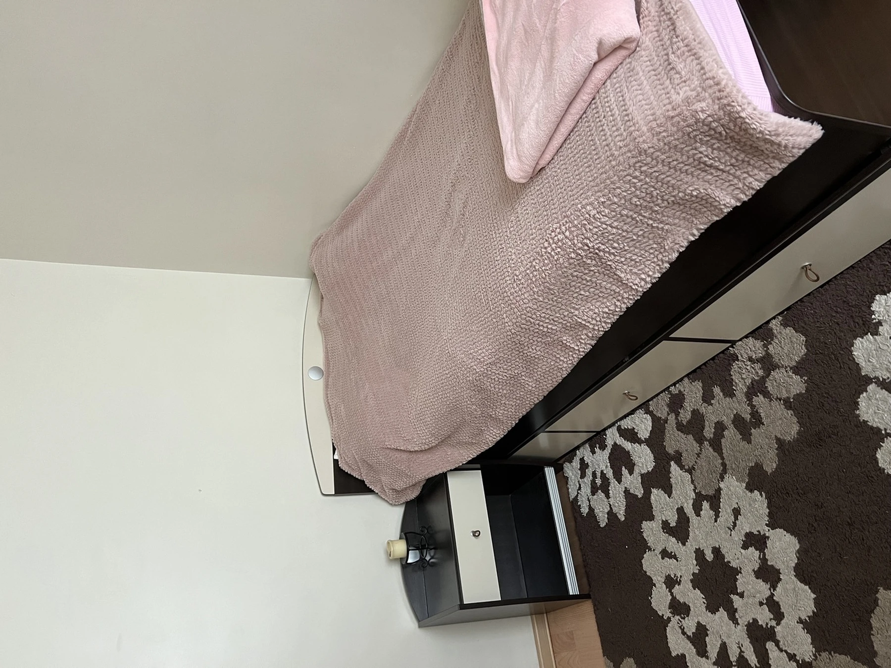 Parduodamas geros būklės vaiko kambario komplektas: dviejų vietų lova su čiužiniais, naktinis staliukas, komoda, spintelė, spinta ir stalas.